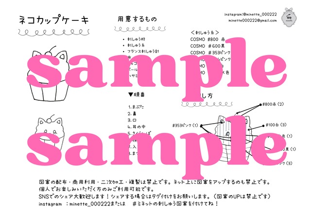 minetteオリジナルの刺しゅう図案 お客様から「ミネットの可愛い図案を刺しゅうしてみたい!」 とリクエストを頂いて配布することにしました?? 第一弾は「ネコカップケーキ」 3月に参加するイベント用は「猫」がテーマなので 猫の刺繍をたくさん作っています! その中でもお気に入りの刺しゅう図案を配布させていただきます。 ※ ご注意事項 ※ 図案の配布・商用利用・二次加工・複製は禁止です。 ネット上に図案をアップするのも禁止です。 個人でお楽しみいただく方のみご利用可能です。 ?SNSでのシェア大歓迎! シェアする場合はタグ付けをお願いします!(図案のUPは禁止です) instagram :minette_000222または #ミネットの刺しゅう図案 を付けてね! ※刺しゅう図案はA4で印刷してください。 <掲載内容> ・刺しゅう図案 ・使用している刺しゅう糸の色 ・刺す順番 ・刺す方向 以上が簡単ですが記載してあります。 図案は大小2つほど記載していますので、 拡大縮小はご自由にどうぞ。 右下にある図案は刺繍の刺す方向を示しています。 ??刺し方が分からない、コツを知りたい! そんな方はminetteのinstagram をご確認ください。(@minette_000222) インスタライブor YouTubeのライブ配信で刺しながら説明をする ライブ配信を行う予定です! ライブ配信は見る時間ないよーという方は instagram のDMでご質問ください?? お返事にお時間いただく時もあると思いますが、 気軽にお問い合わせください!