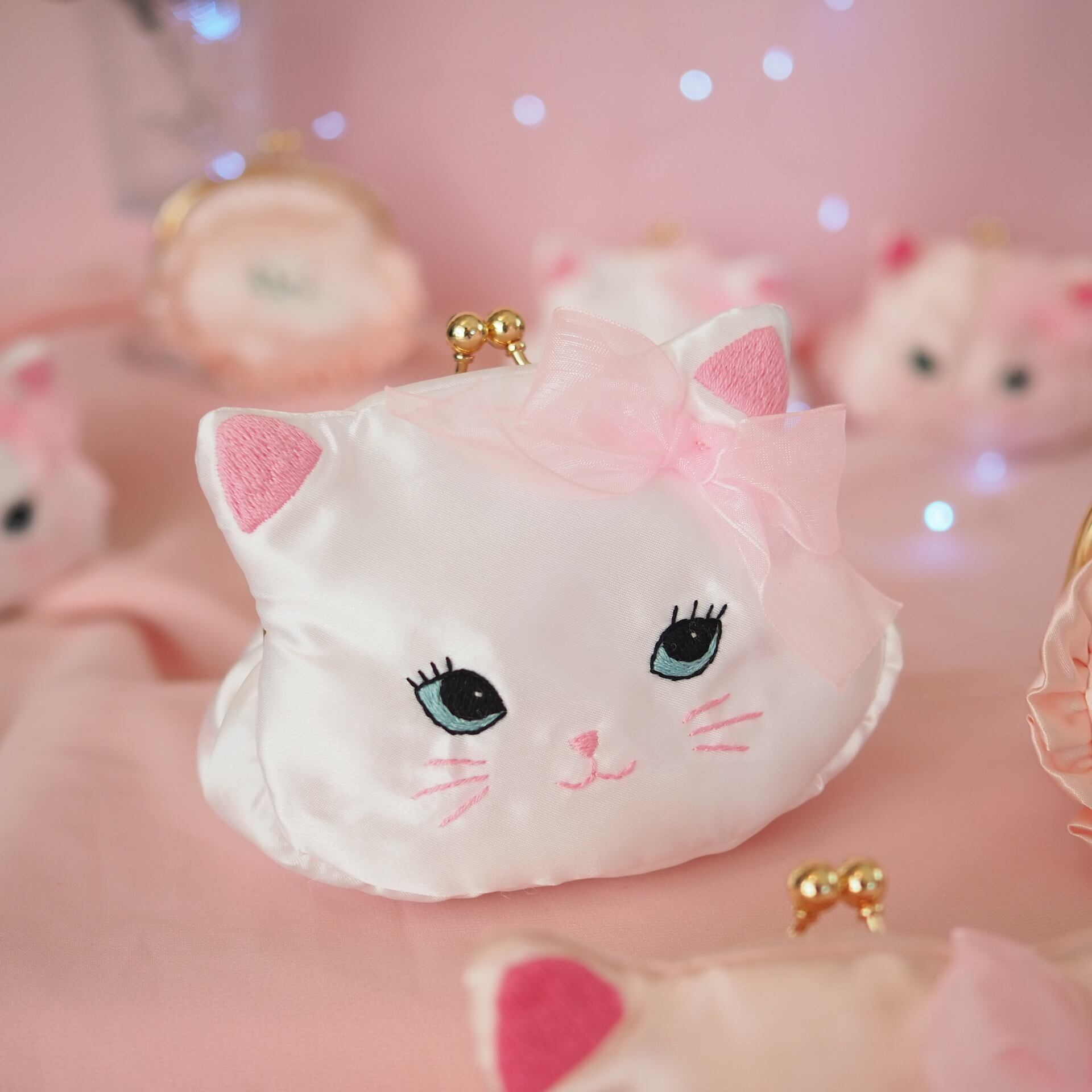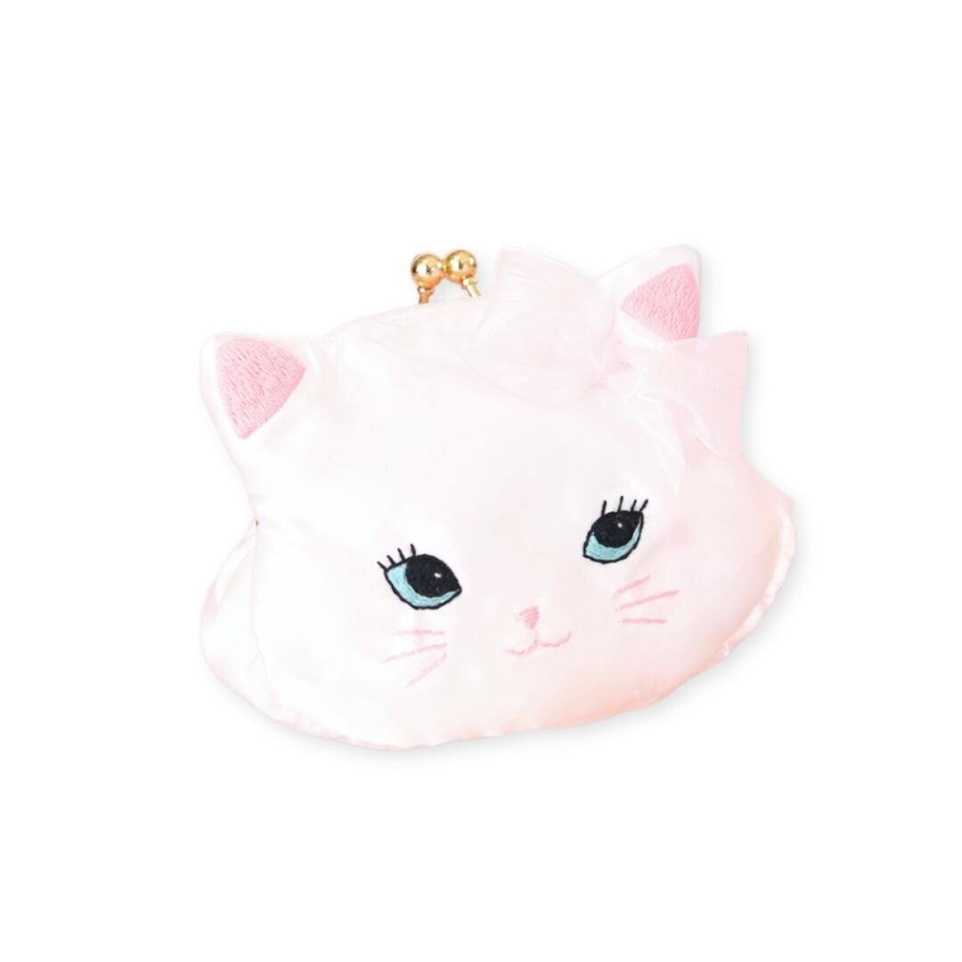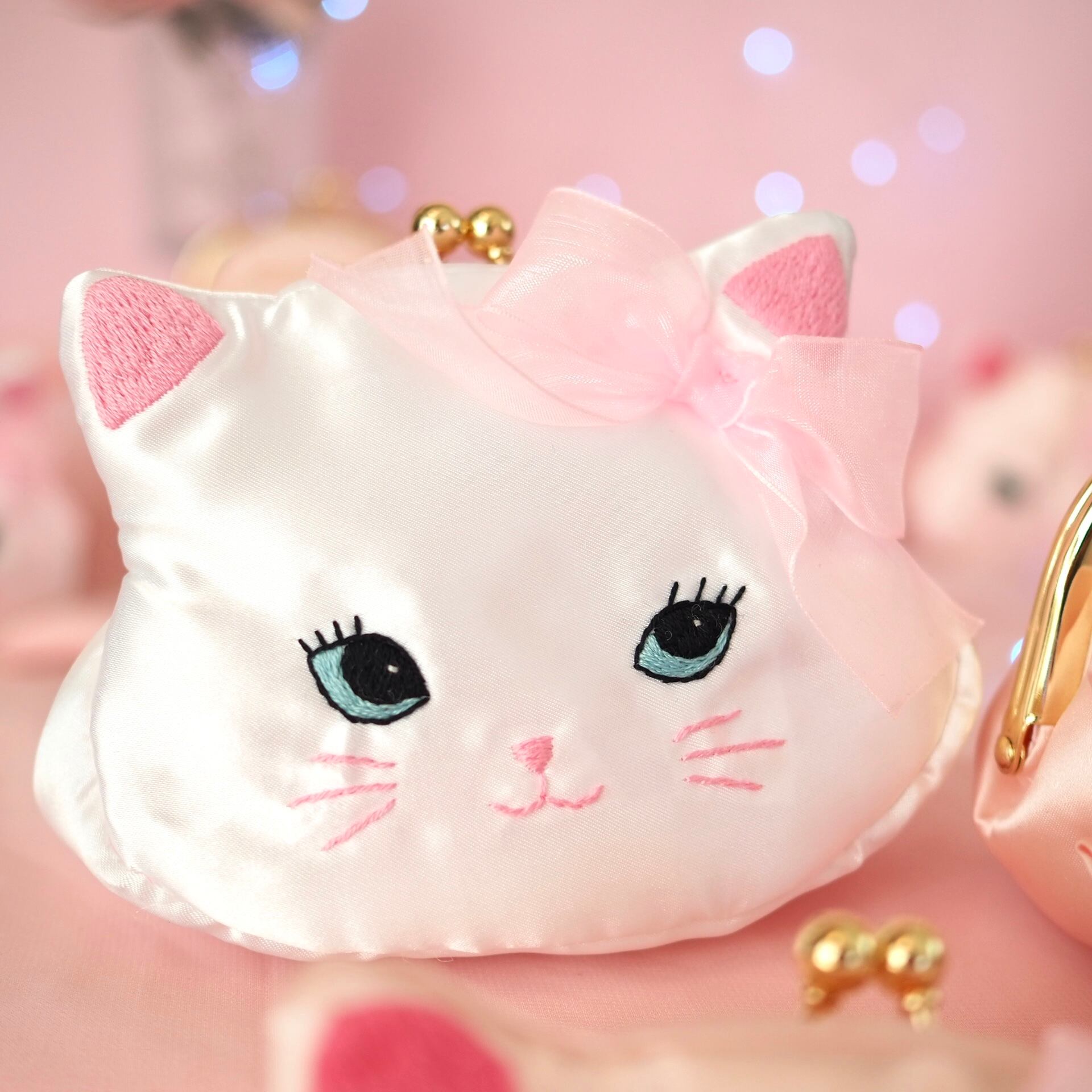 白猫の顔をモチーフにしたがま口ポーチは、ホワイトサテンの優しい光沢と耳にあしらわれたオーガンジーリボンがエレガントな雰囲気を醸し出す一品。刺繍で丁寧に描かれた大きな瞳とキュートな表情が、持つ人の心をときめかせます。コンパクトながら使いやすいサイズ感で、小さなアクセサリーやリップを収納するのにぴったり。バッグの中に忍ばせておくだけで、毎日が少しだけ特別になるようなデザインです。