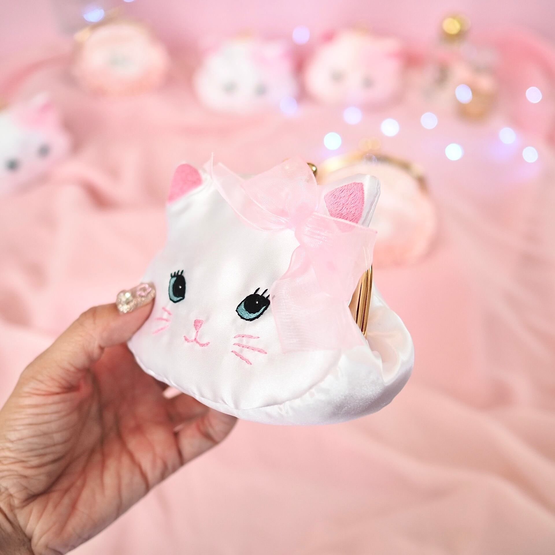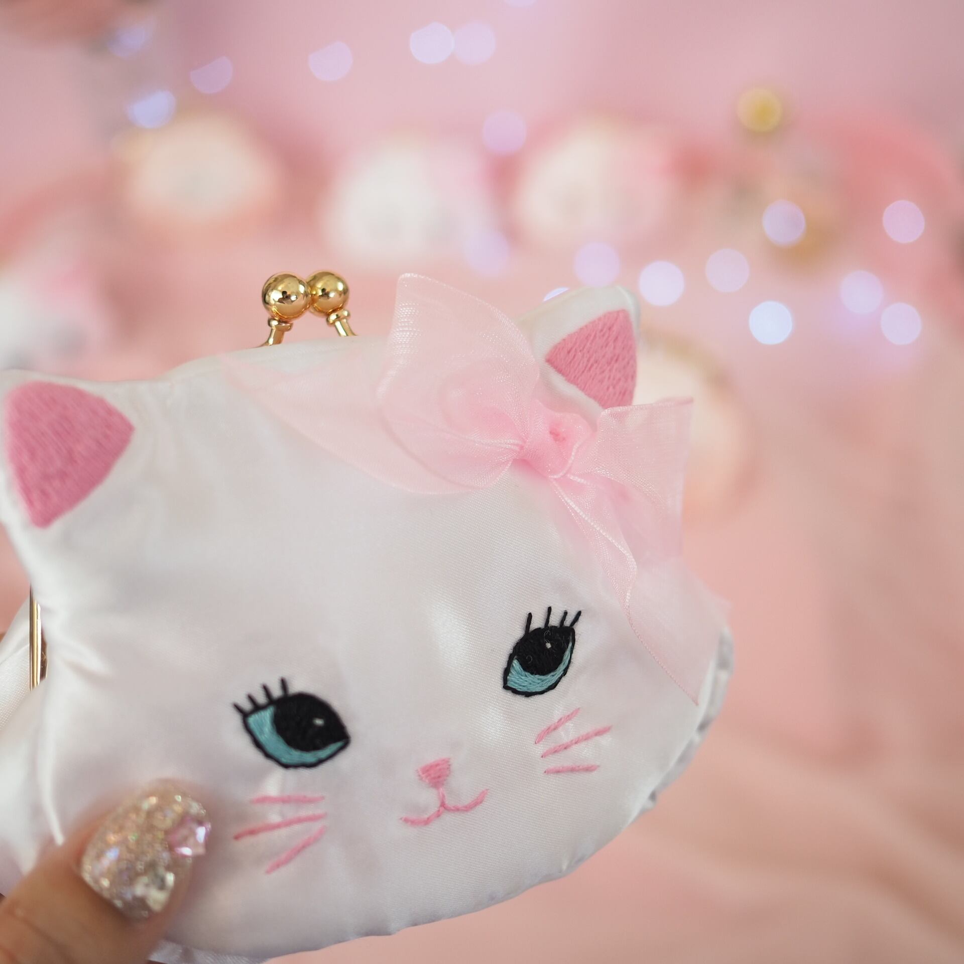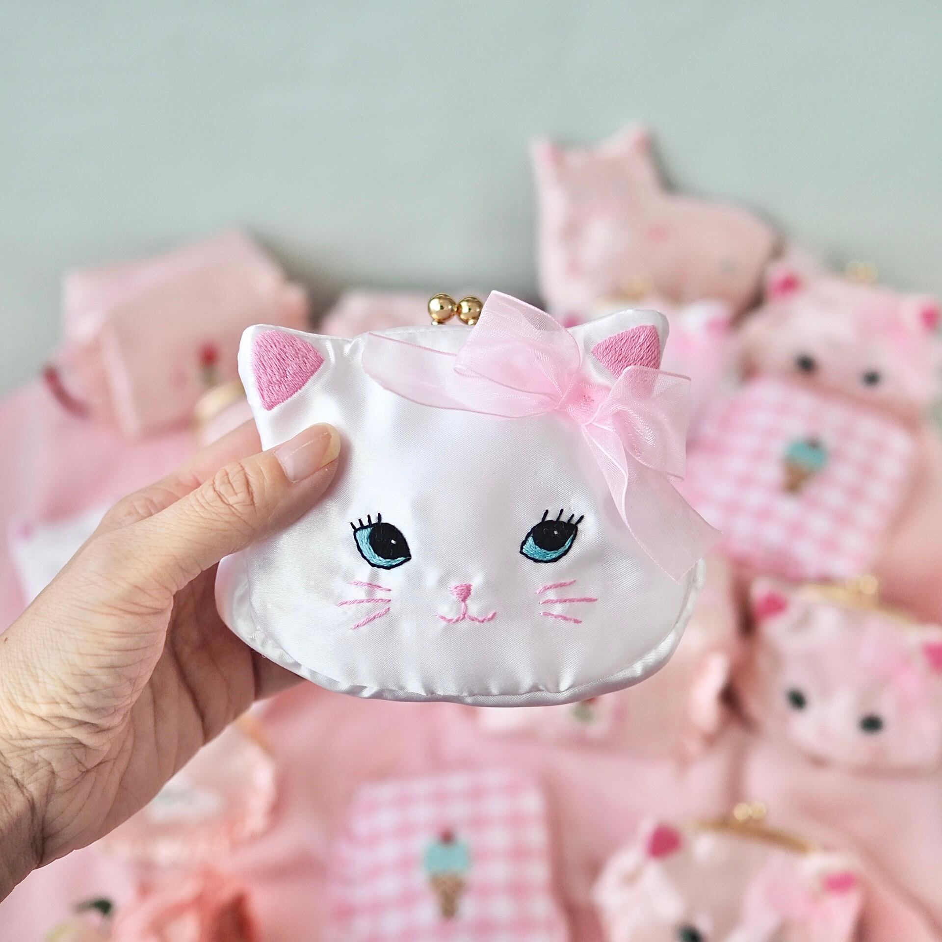 白猫の顔をモチーフにしたがま口ポーチは、ホワイトサテンの優しい光沢と耳にあしらわれたオーガンジーリボンがエレガントな雰囲気を醸し出す一品。刺繍で丁寧に描かれた大きな瞳とキュートな表情が、持つ人の心をときめかせます。コンパクトながら使いやすいサイズ感で、小さなアクセサリーやリップを収納するのにぴったり。バッグの中に忍ばせておくだけで、毎日が少しだけ特別になるようなデザインです。