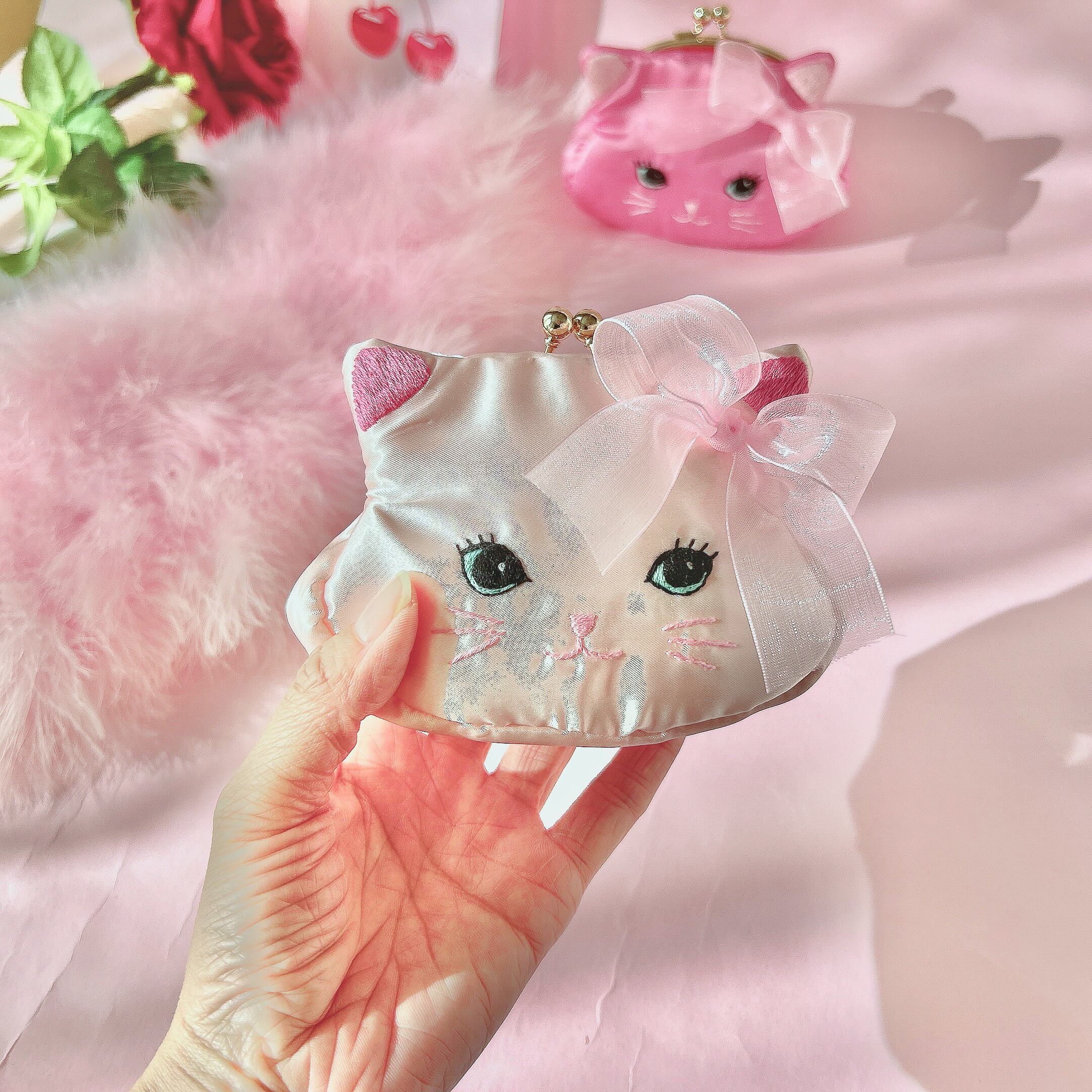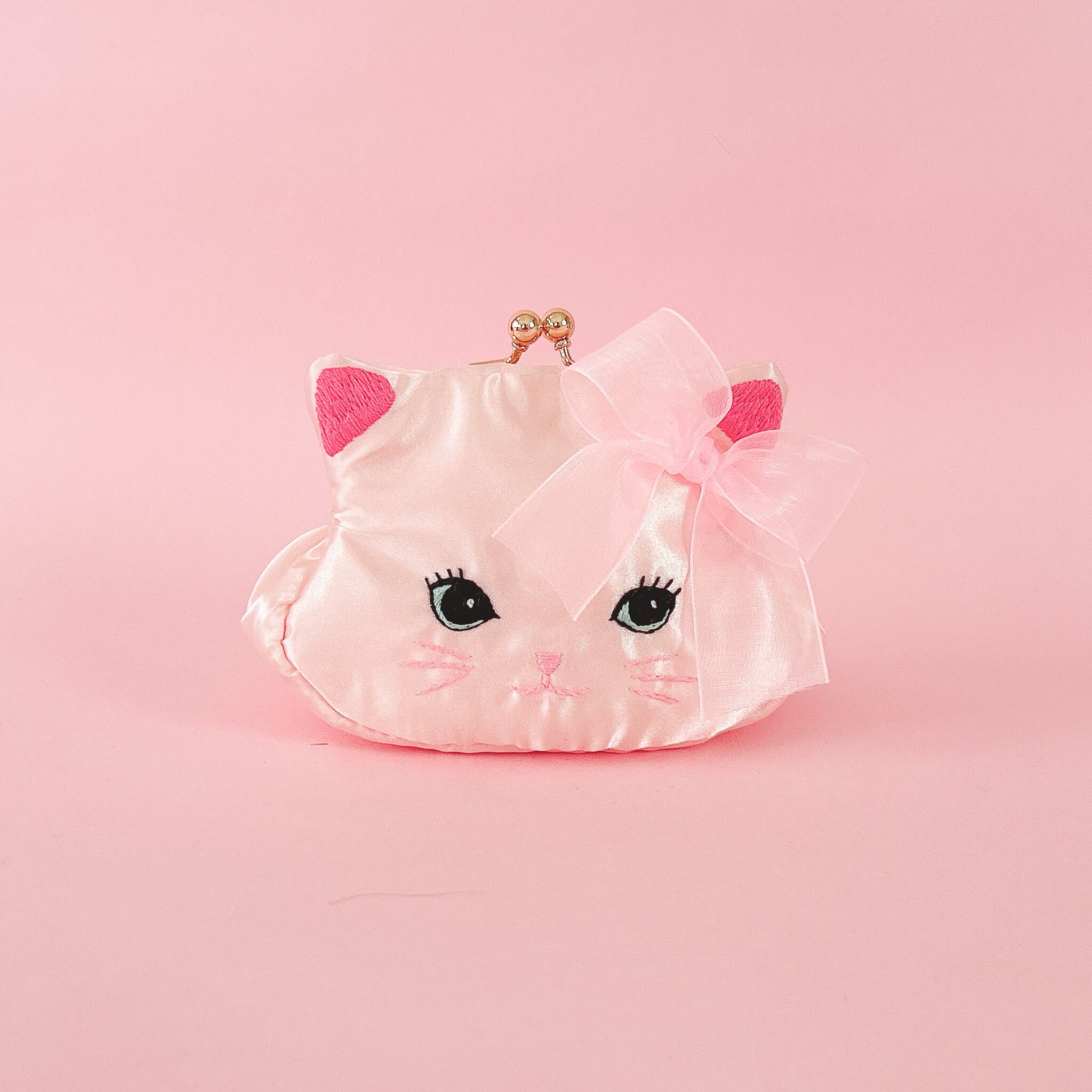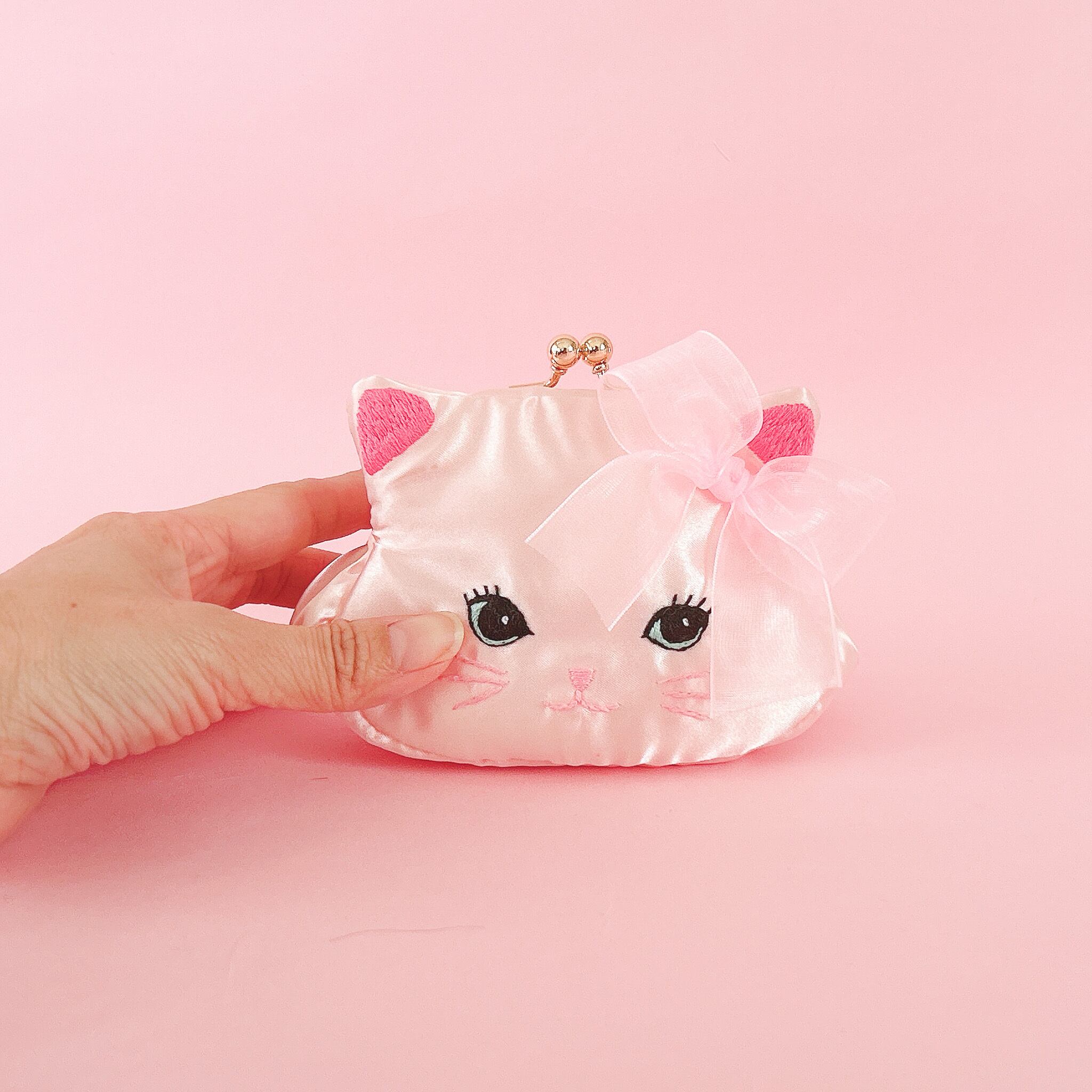 ふっくらした可愛い猫のお顔がま口ポーチを手のひらにのせて可愛がってあげてくださいね!