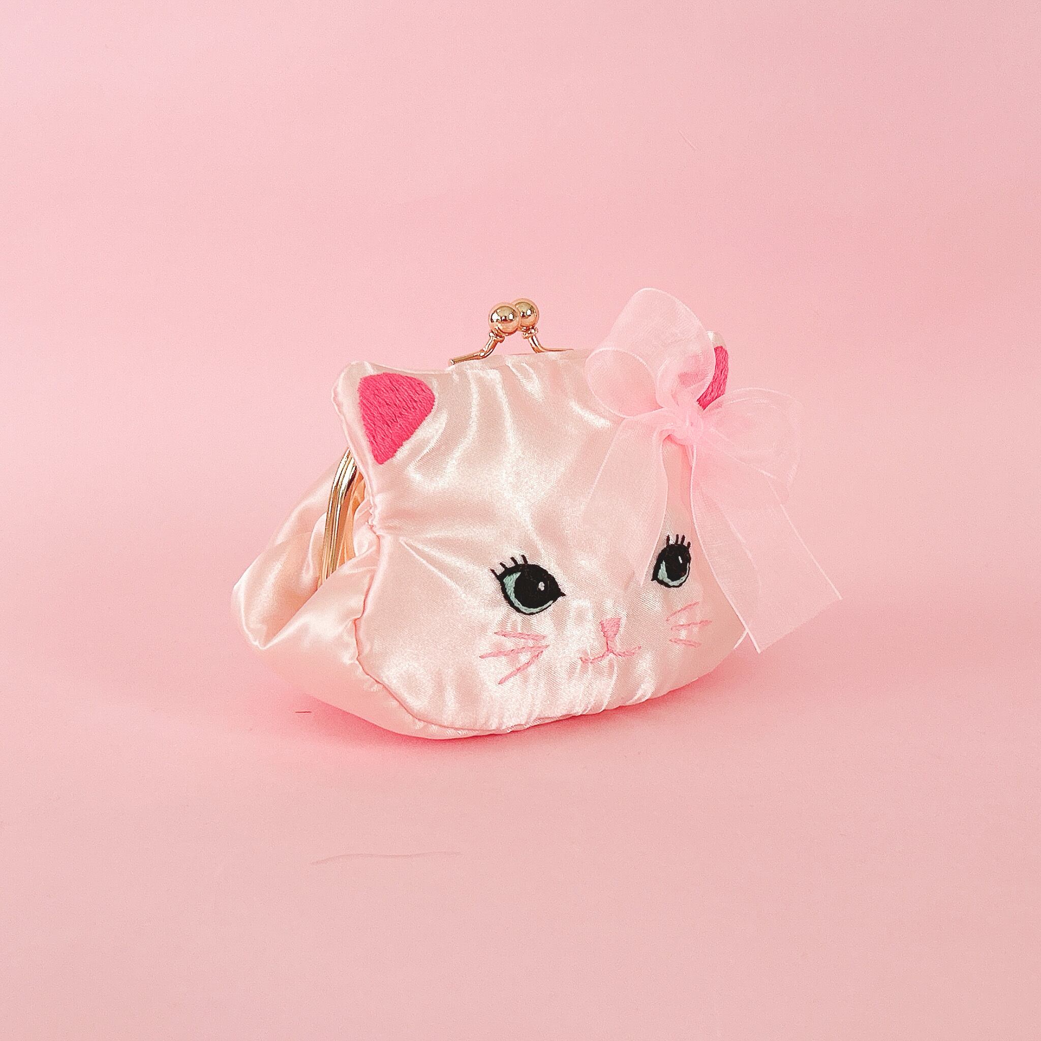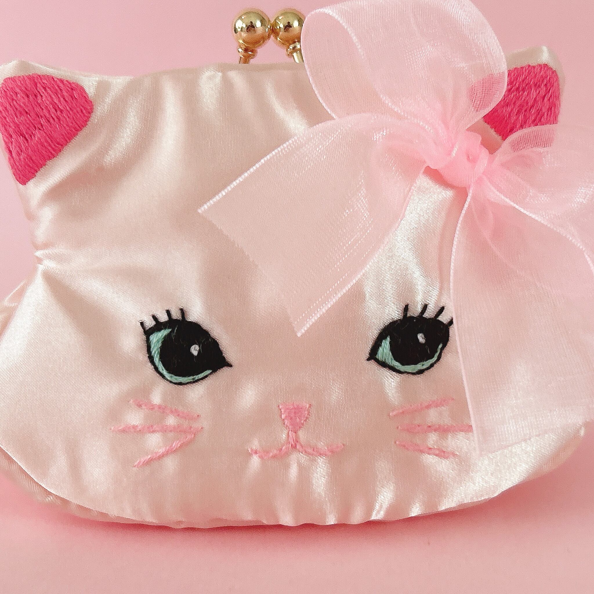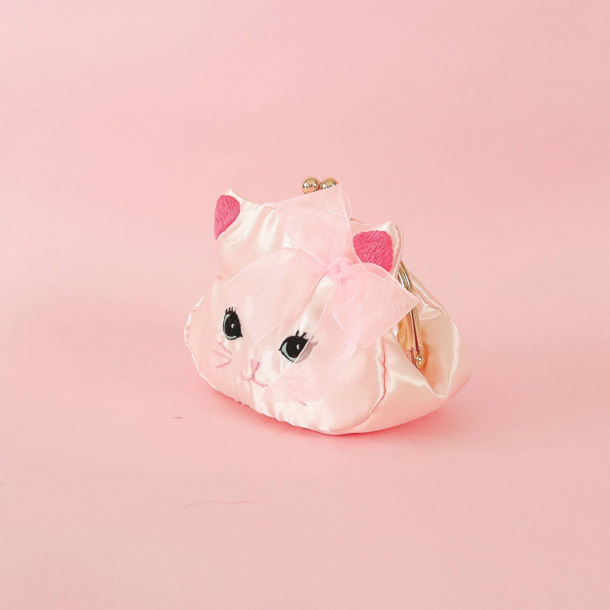 ふっくらした可愛い猫のお顔がま口ポーチを手のひらにのせて可愛がってあげてくださいね!