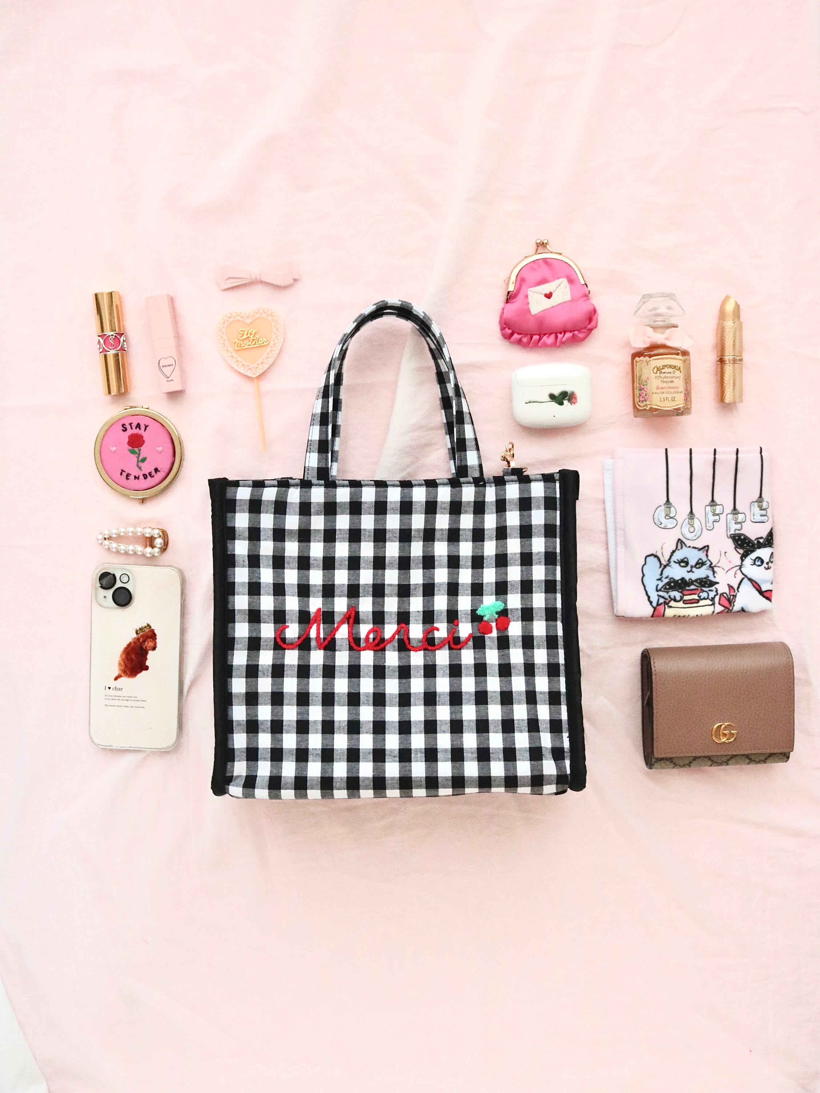 minette / ミネット刺繍 / minetteembroidery / ギンガムチェックバッグ / アムンゼンバッグ / merci刺繍 / チェリー刺繍 / 大人ガーリー / 刺繍バッグ / レディースバッグ / ハンドメイドバッグ / 2wayバッグ / ショルダーバッグ / フェミニン雑貨 / 甘めカジュアル