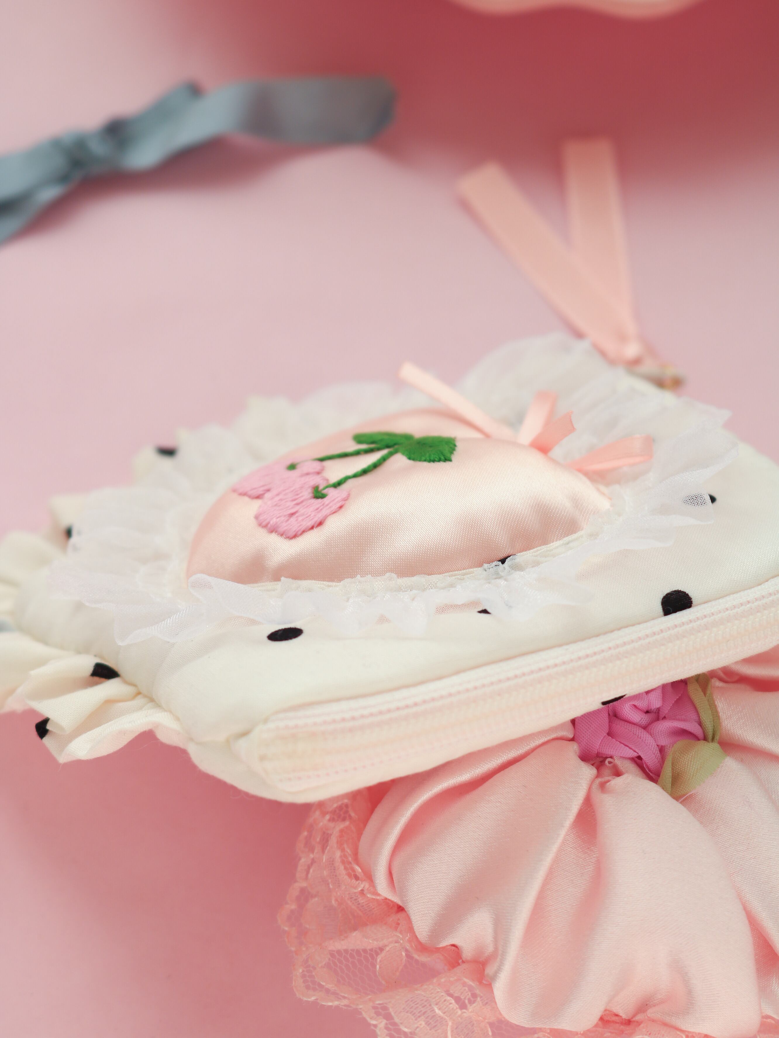 ハートくり抜きミニスクエアポーチ(ドット/チェリー刺繍)