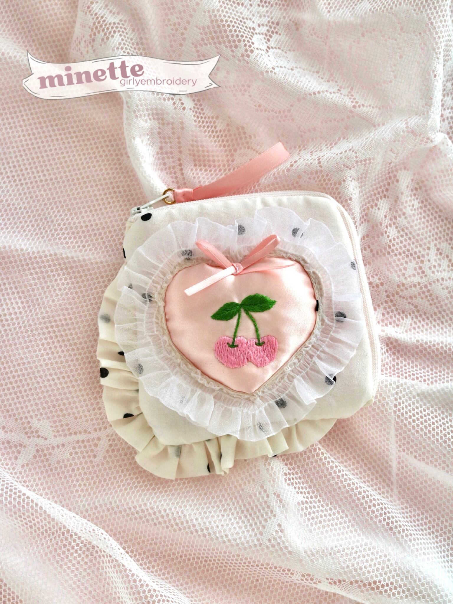 minette / ミネット刺繍 / minetteembroidery / 刺繍ポーチ / ハートポーチ / 立体刺繍 / 大人ガーリー / ふわふわポーチ / カスタムポーチ / ギンガムチェック / ドット柄 / フェミニン雑貨 / ハンドメイドポーチ / ガーリー小物 / ギフトにおすすめ