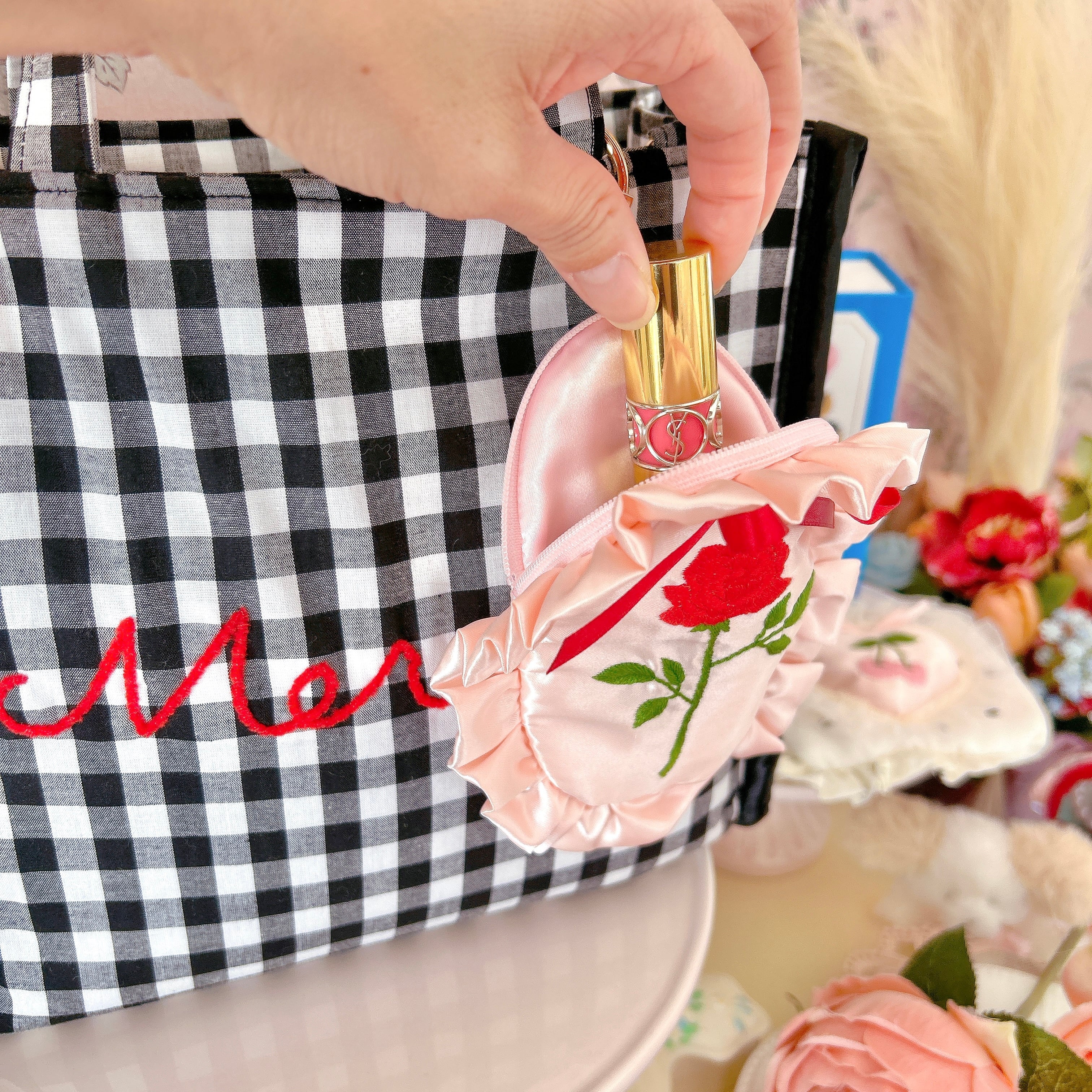 minette / ミネット刺繍 / minetteembroidery / 刺繍ポーチ / ハートポーチ / 立体刺繍 / 大人ガーリー / ふわふわポーチ / カスタムポーチ / ギンガムチェック / サテン / フェミニン雑貨 / ハンドメイドポーチ / ガーリー小物 / ギフトにおすすめ/スワン/白鳥/