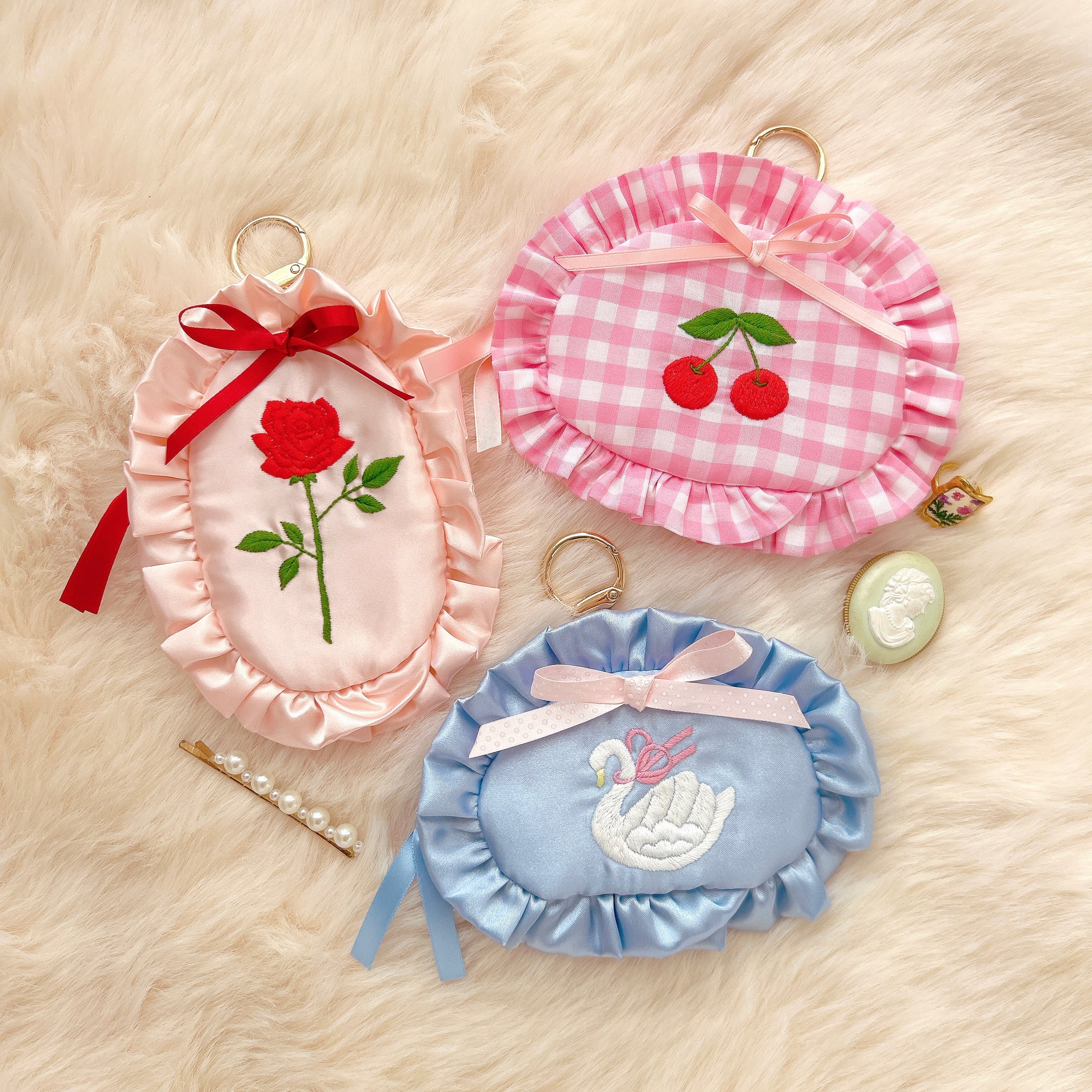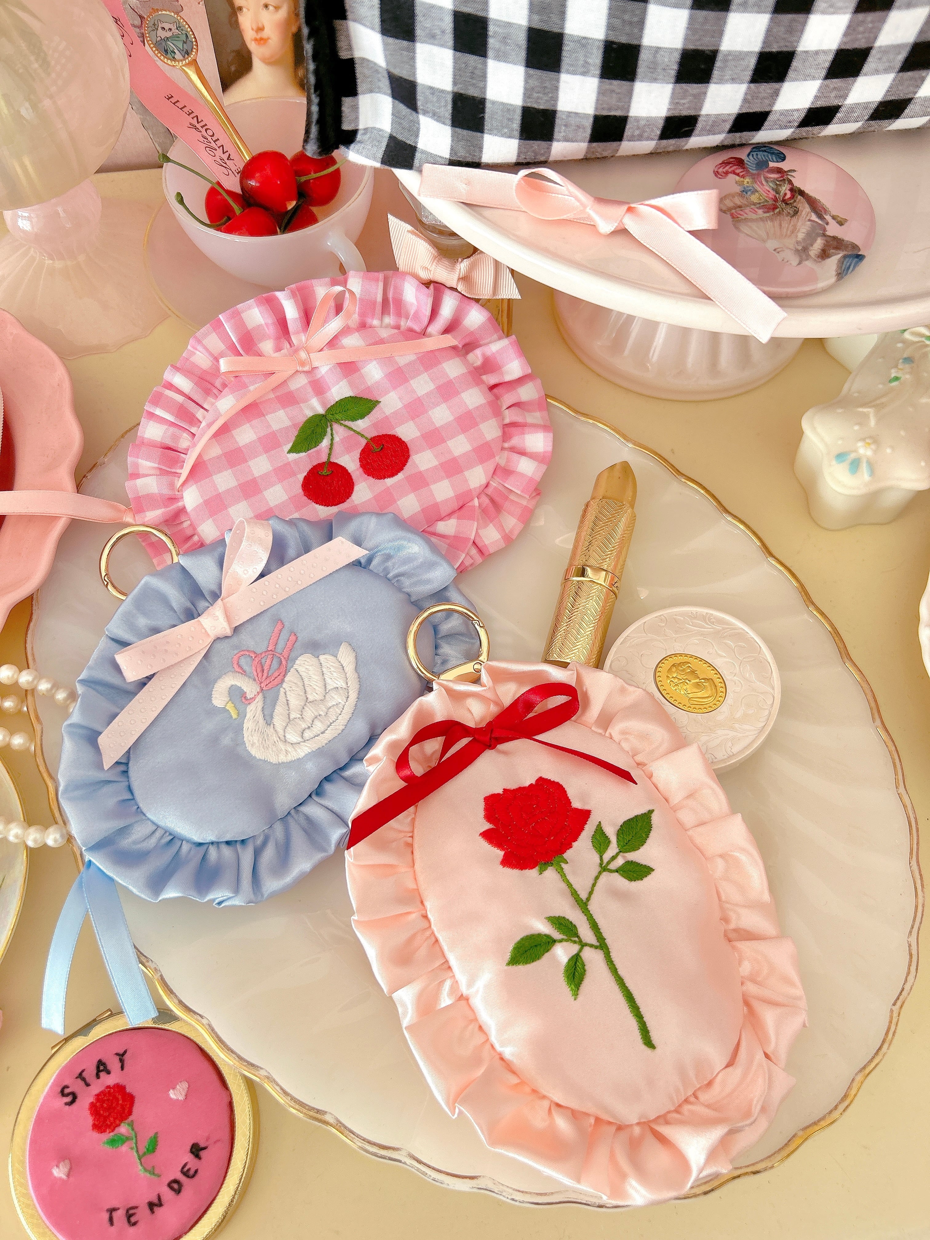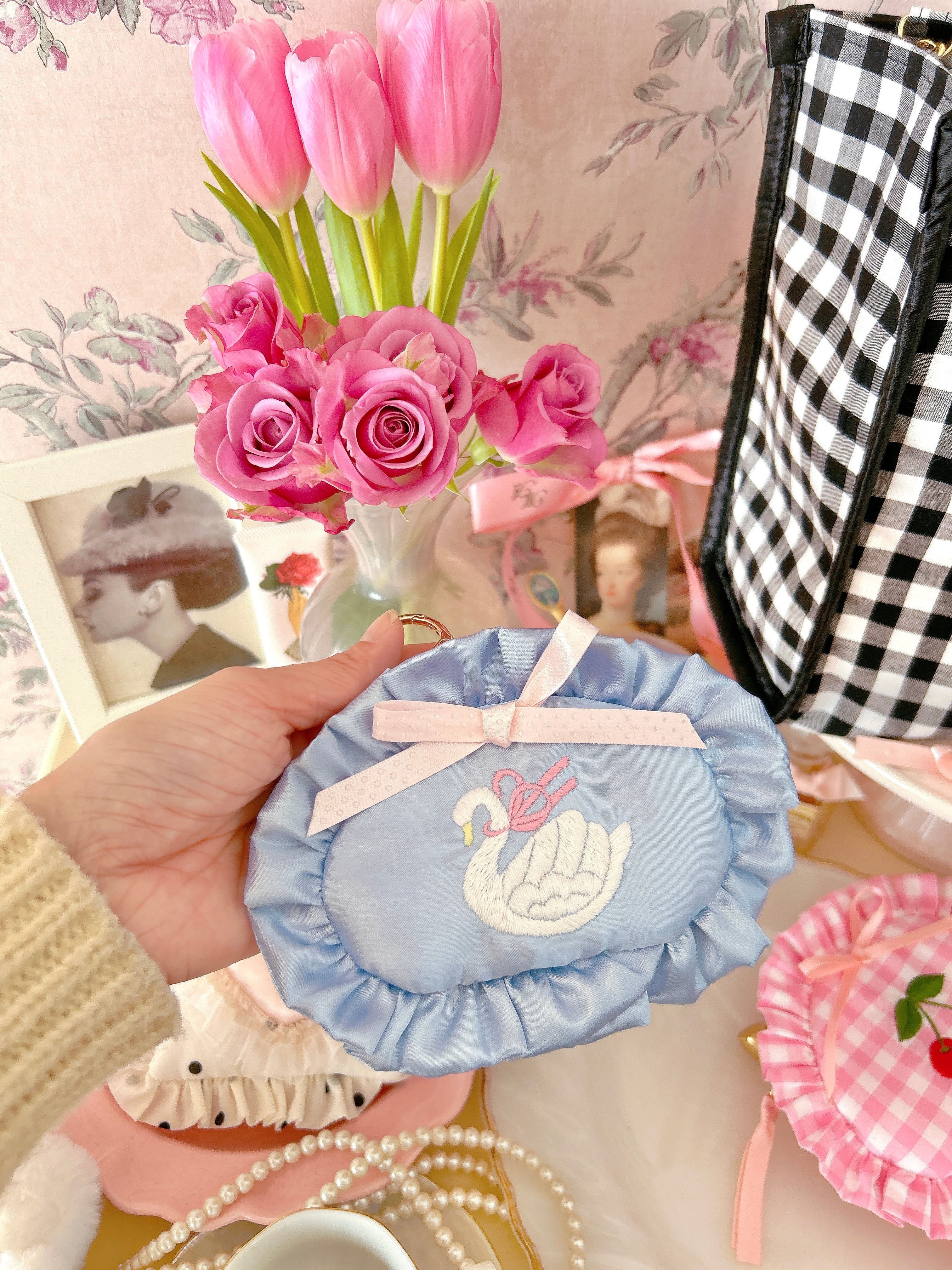 minette / ミネット刺繍 / minetteembroidery / 刺繍ポーチ / ハートポーチ / 立体刺繍 / 大人ガーリー / ふわふわポーチ / カスタムポーチ / ギンガムチェック / サテン / フェミニン雑貨 / ハンドメイドポーチ / ガーリー小物 / ギフトにおすすめ/スワン/白鳥/