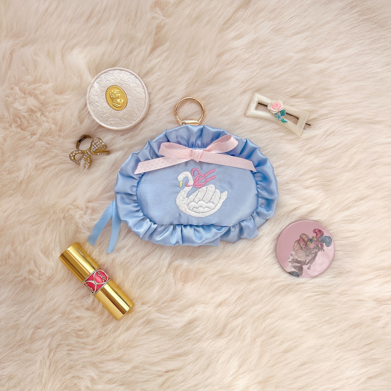 バッグチャームポーチ(水色サテン/スワン刺繍)