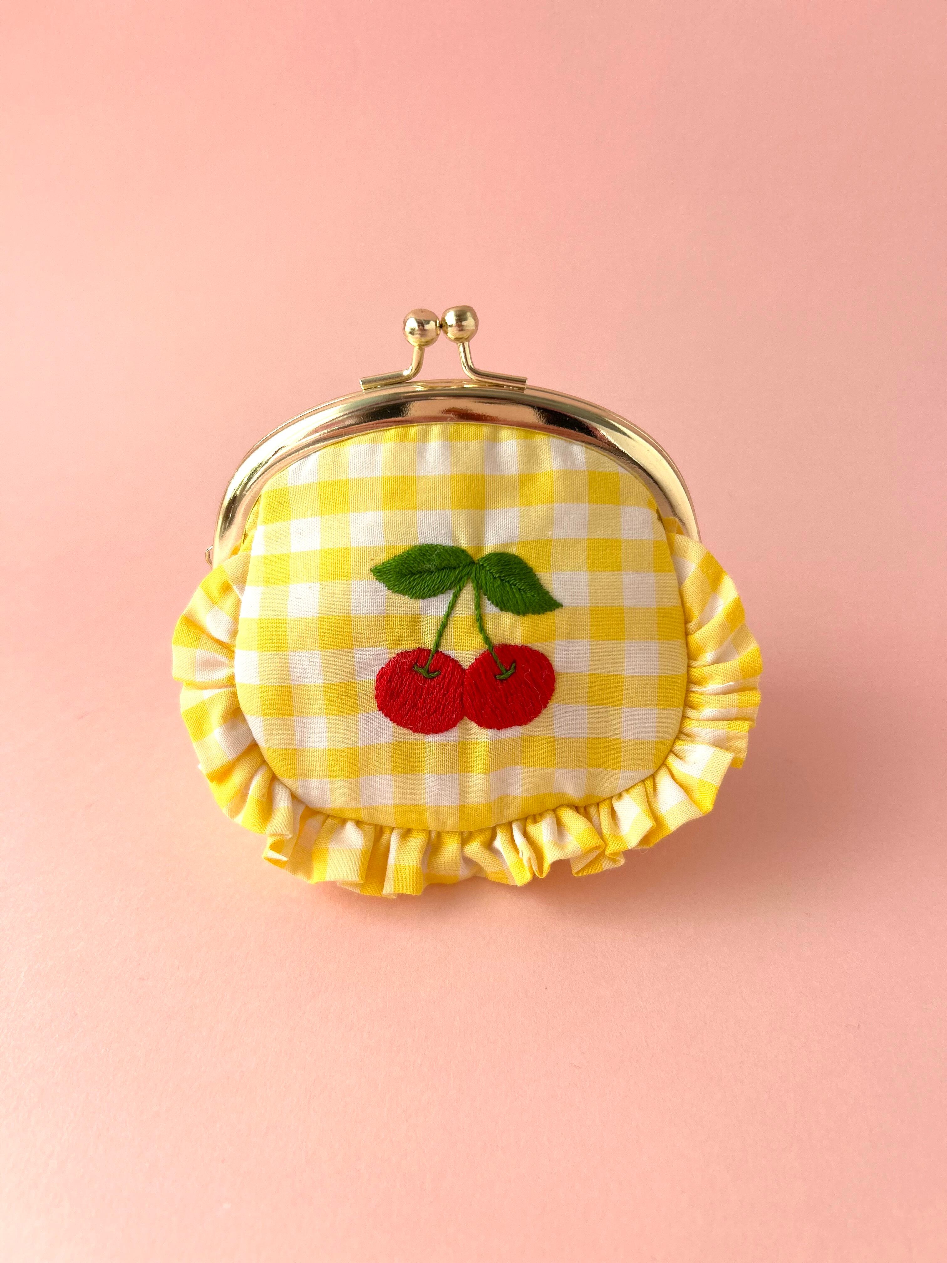 【サンプルセール品】がま口ポーチ(黄色ギンガム/チェリー刺繍)※お一人様2個まで