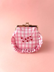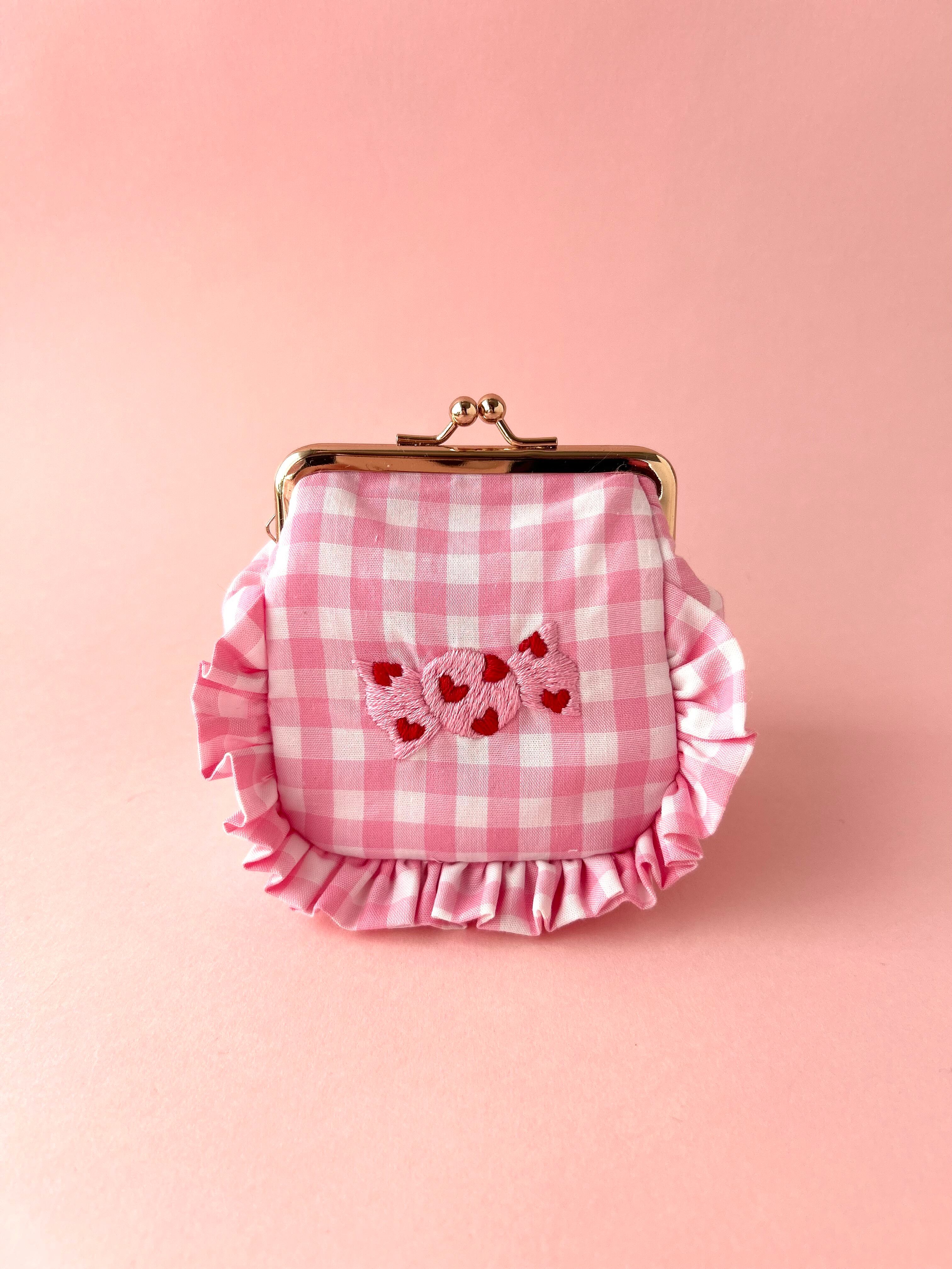 【サンプルセール品】がま口ポーチ(ピンクギンガム/キャンディ刺繍)※お一人様2個まで