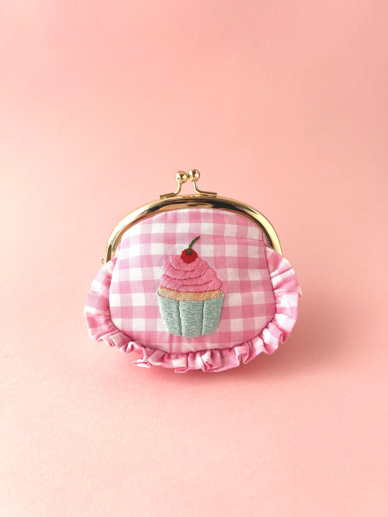 【サンプルセール品】がま口ポーチ(ピンクギンガム/カップケーキ刺繍)※お一人様2個まで