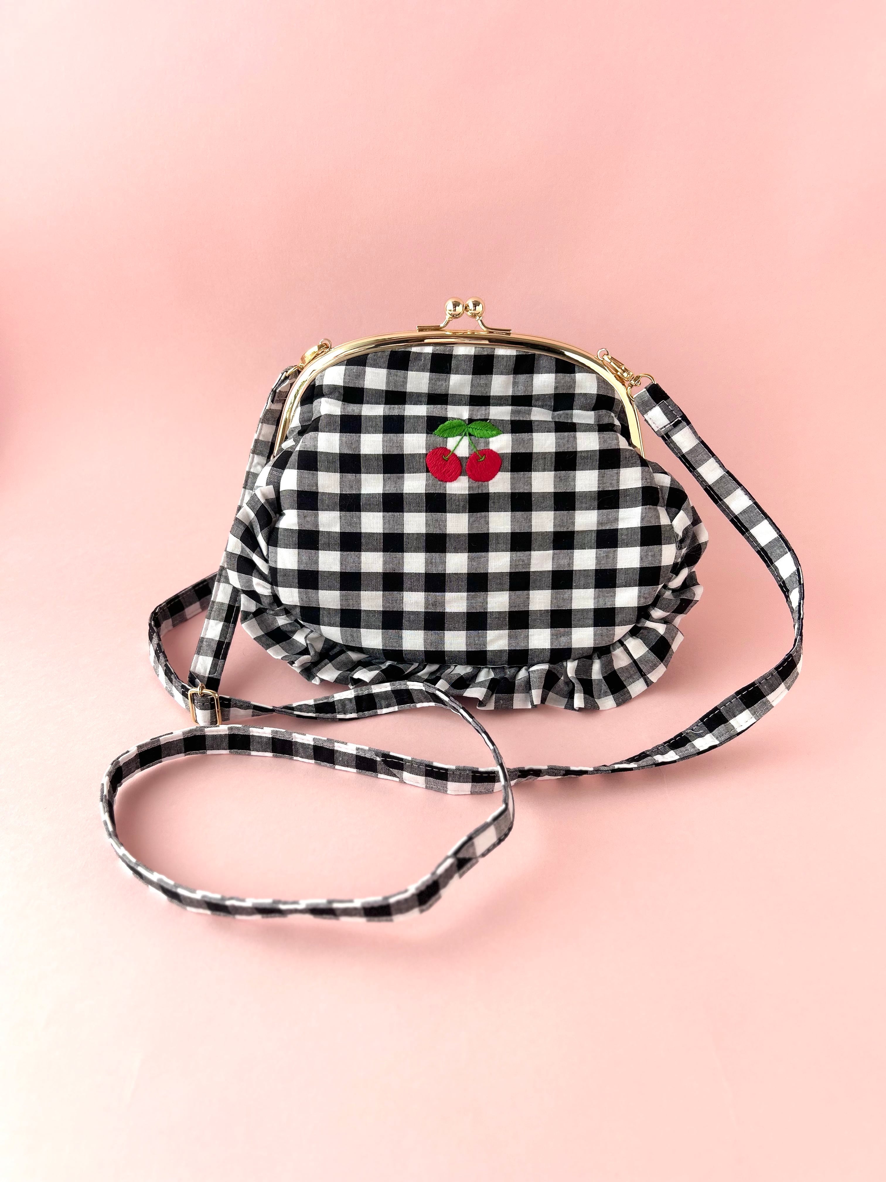 【サンプルセール品】がま口ポシェット(ブラックギンガム/チェリー刺繍刺繍)※お一人様2個まで