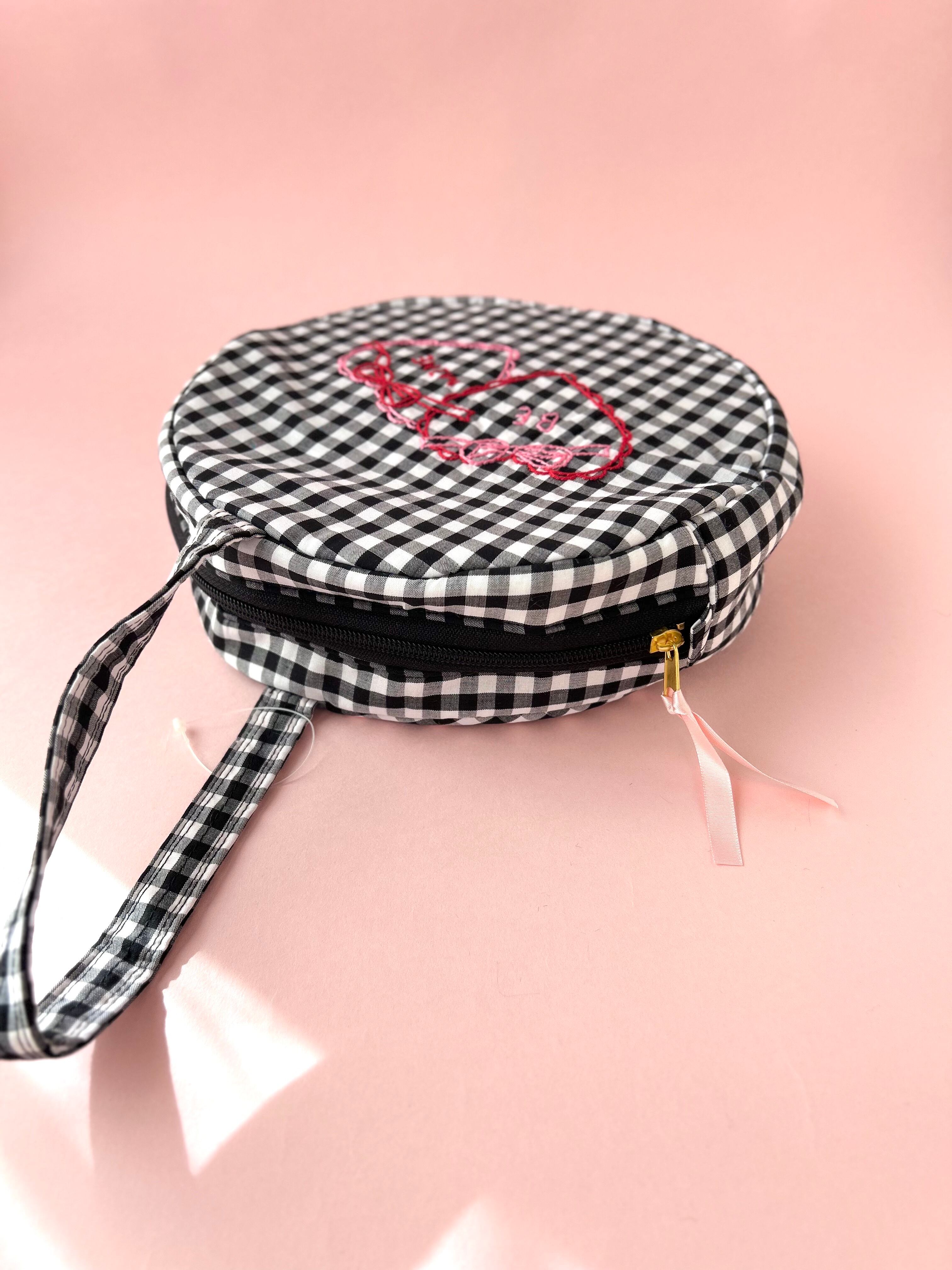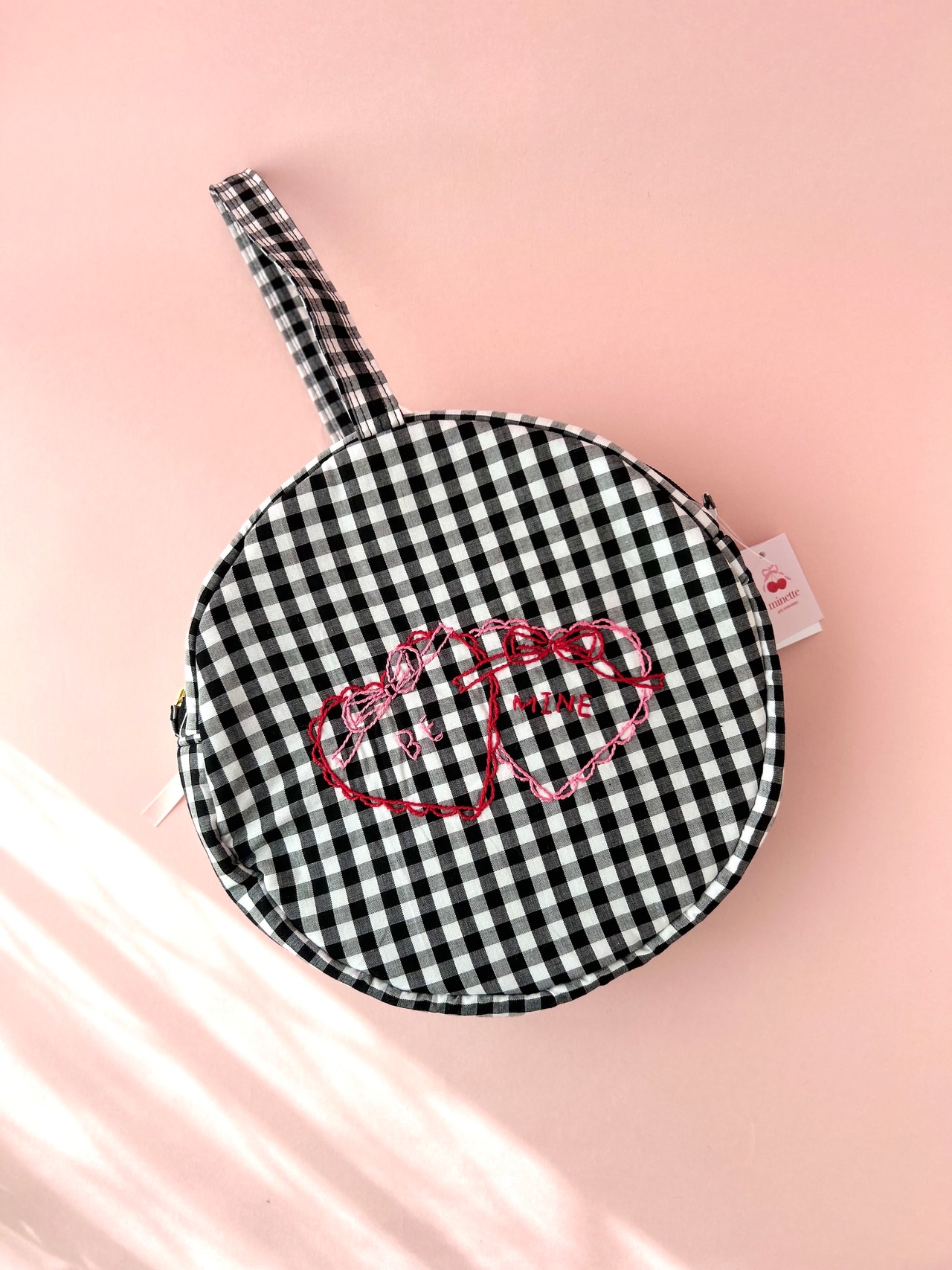 【サンプルセール品】ラウンドバッグ(ブラックギンガム/ダブルハート刺繍)※お一人様2個まで