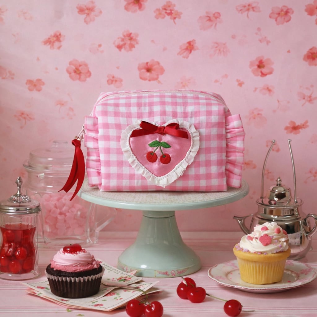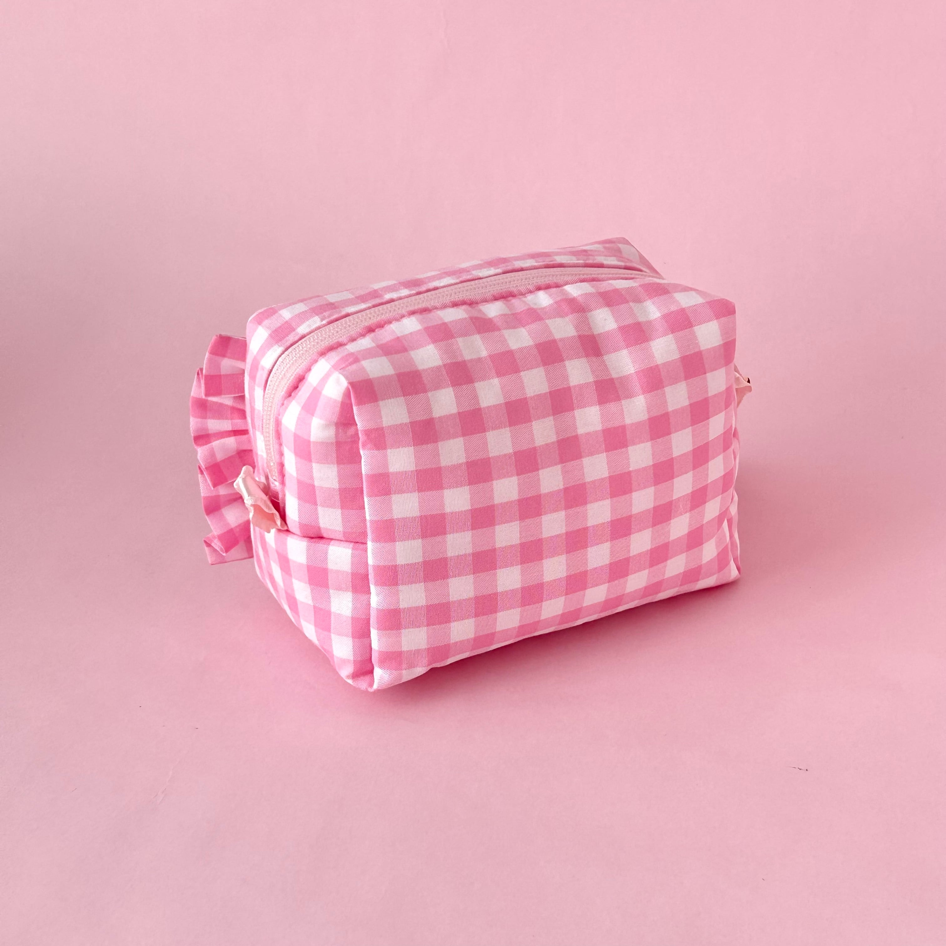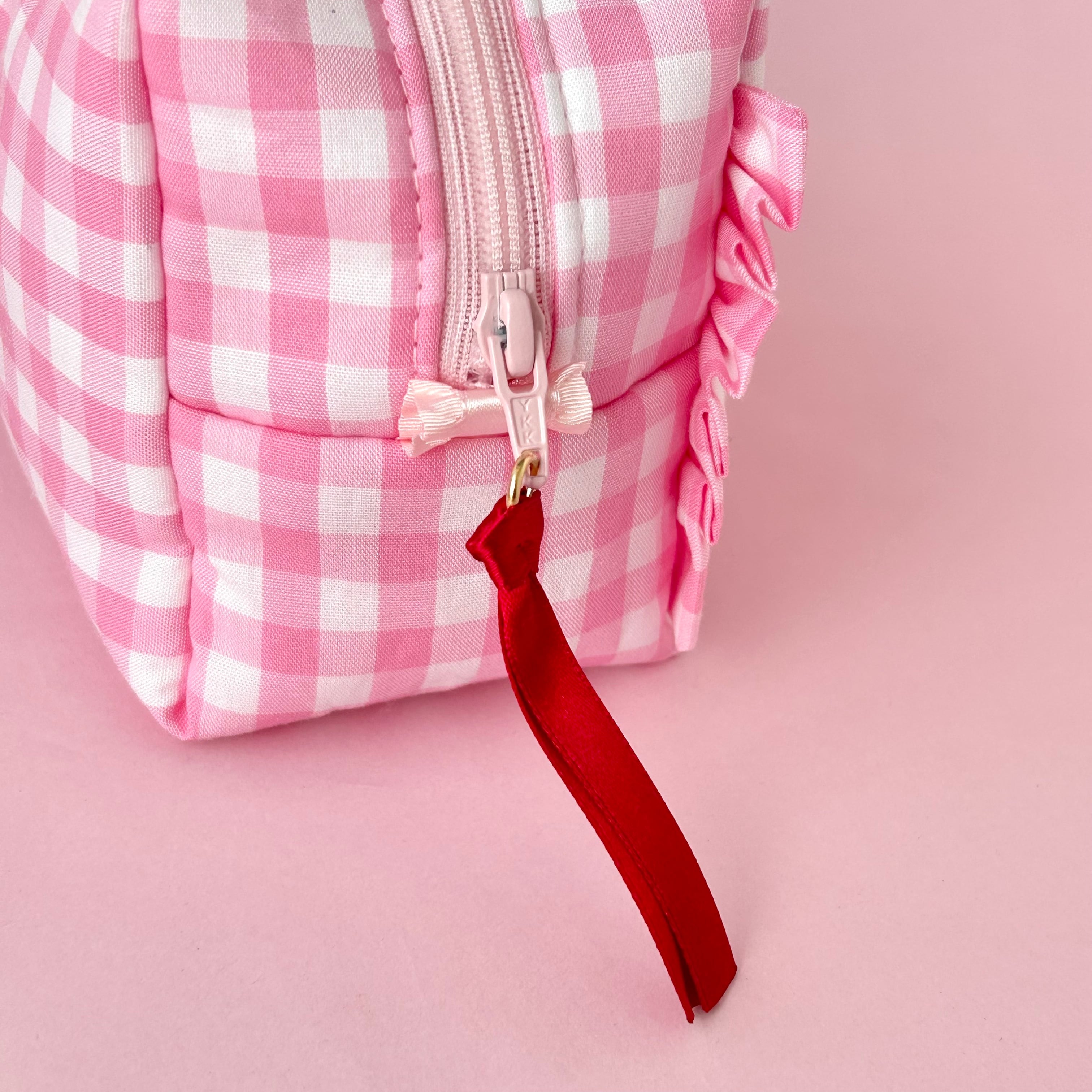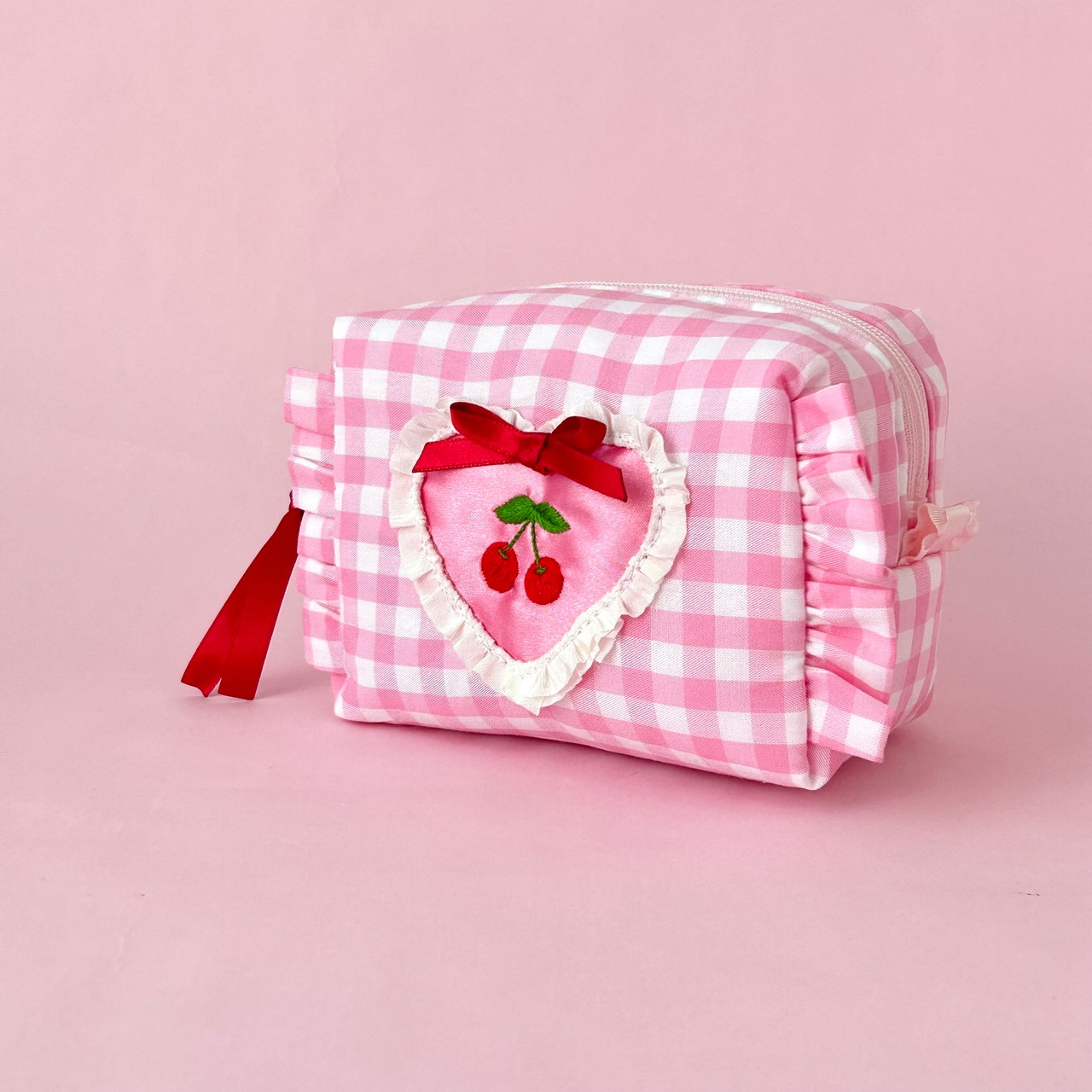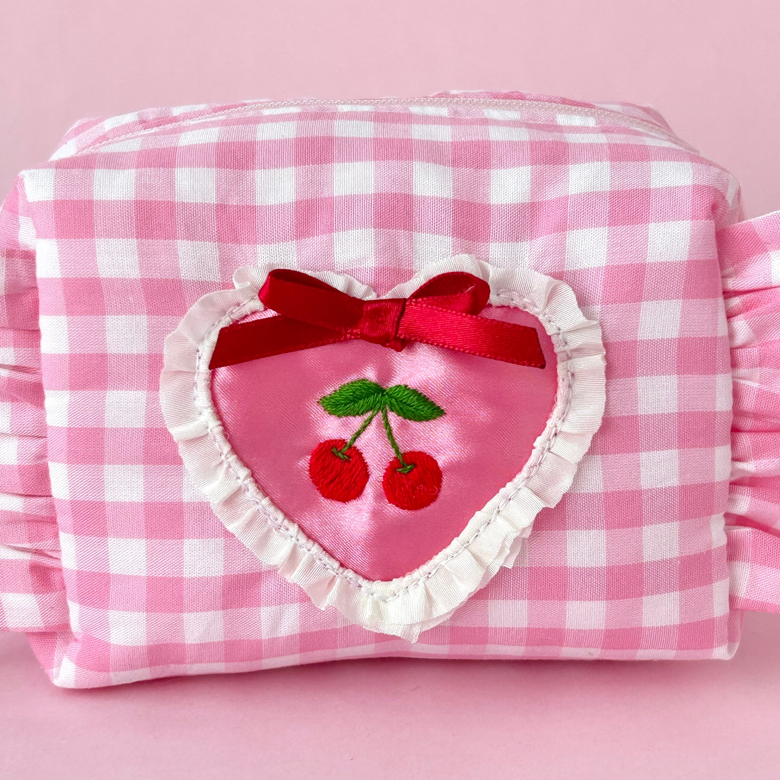 ボックスポーチ(ピンクギンガム/チェリー刺繍)