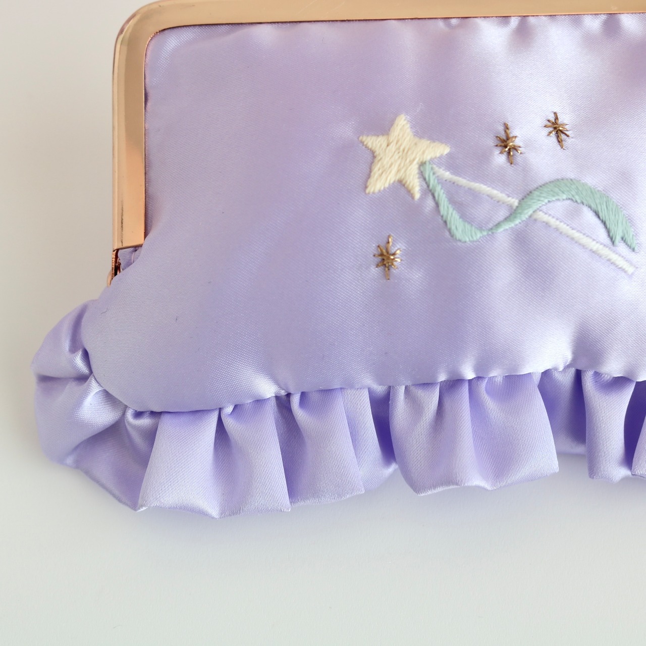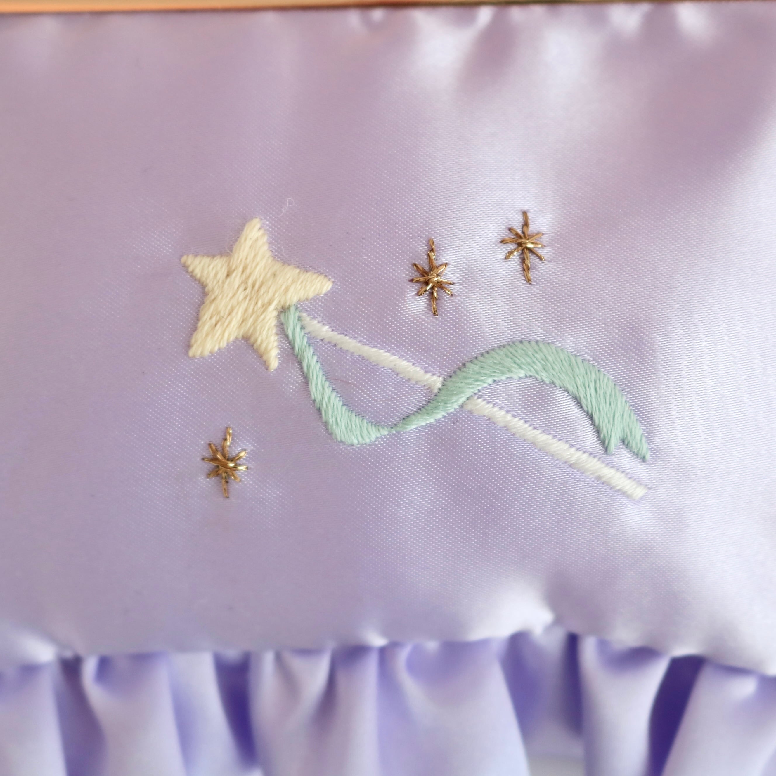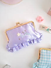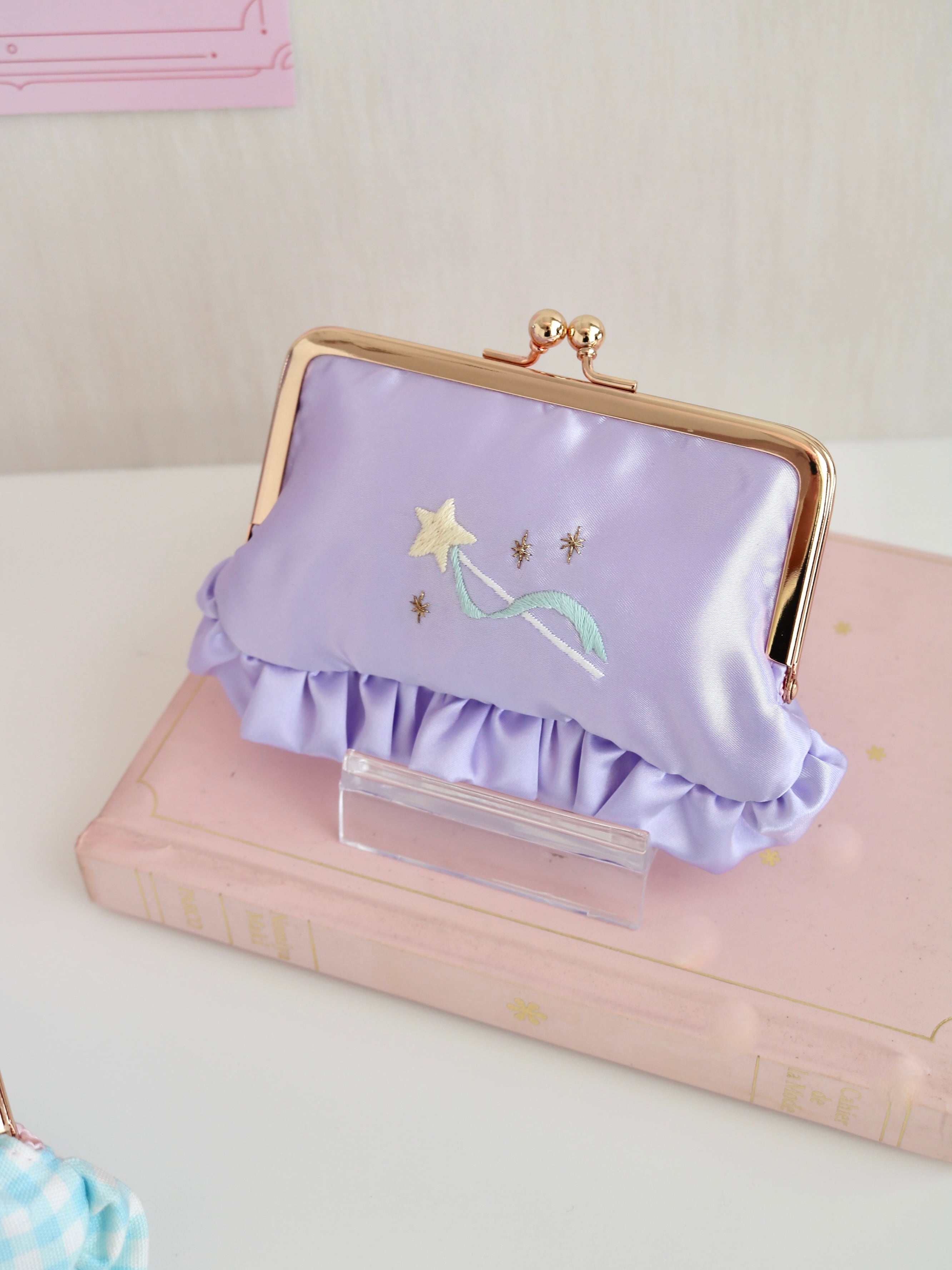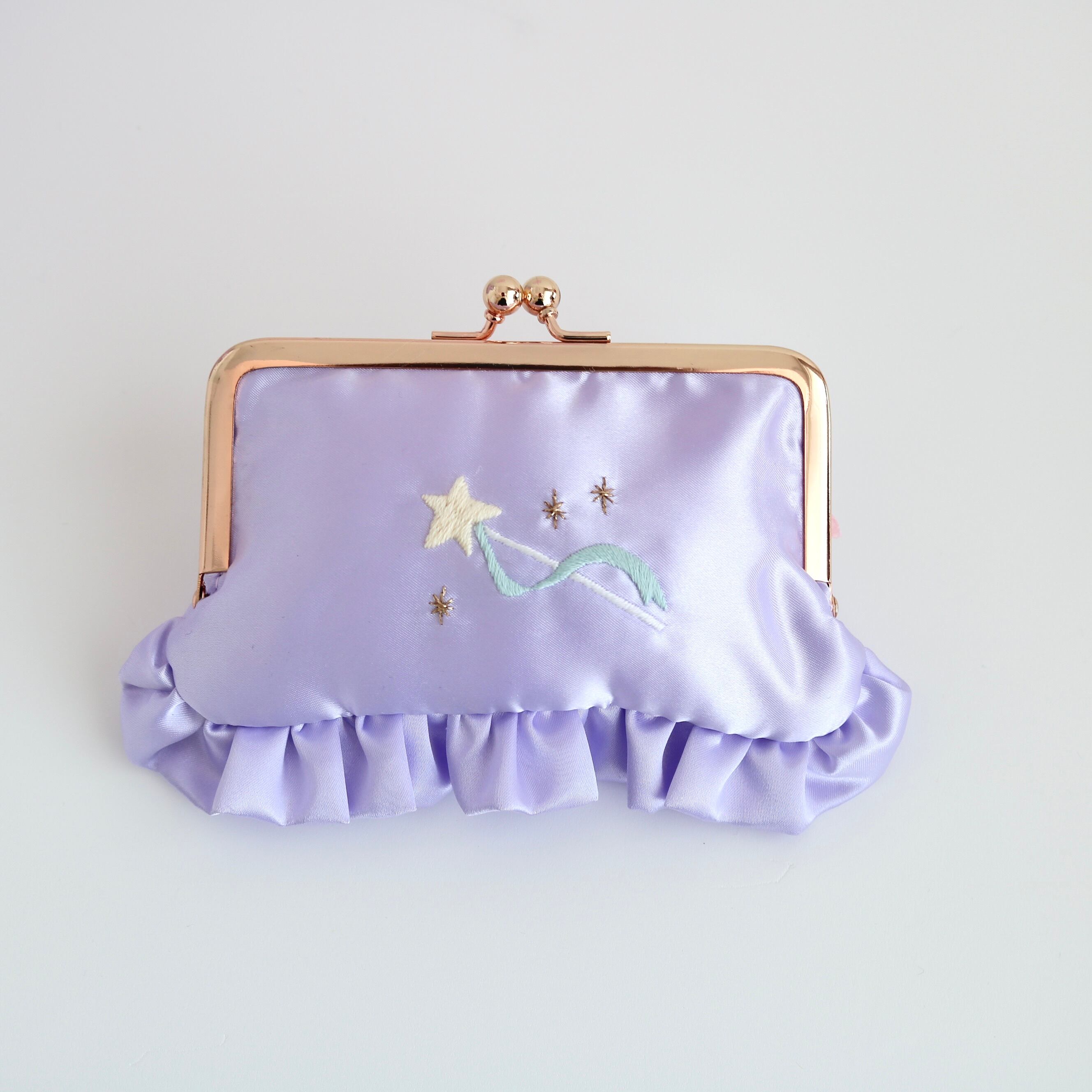横長がま口コスメポーチ(むらさきサテン/星ステッキ刺繍)