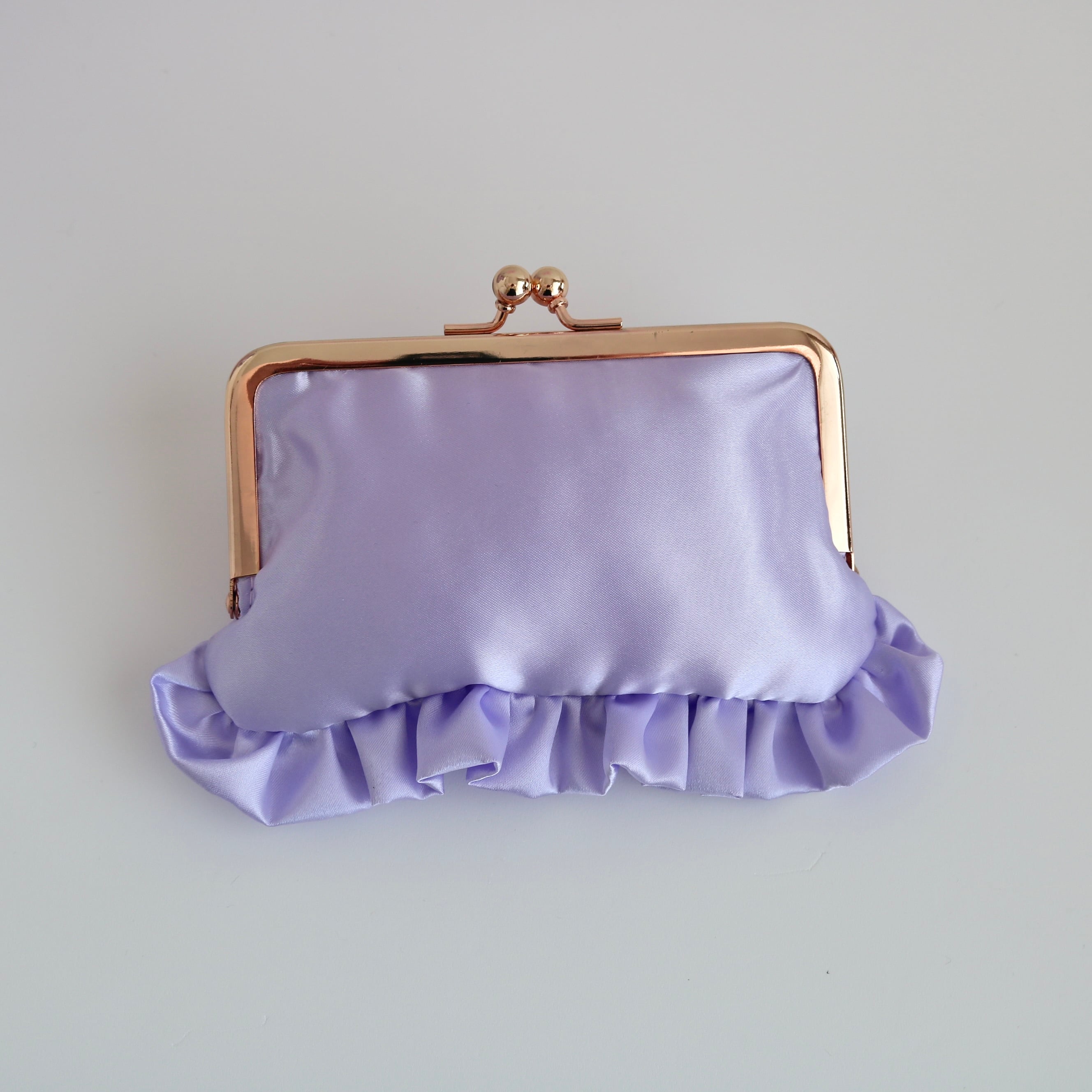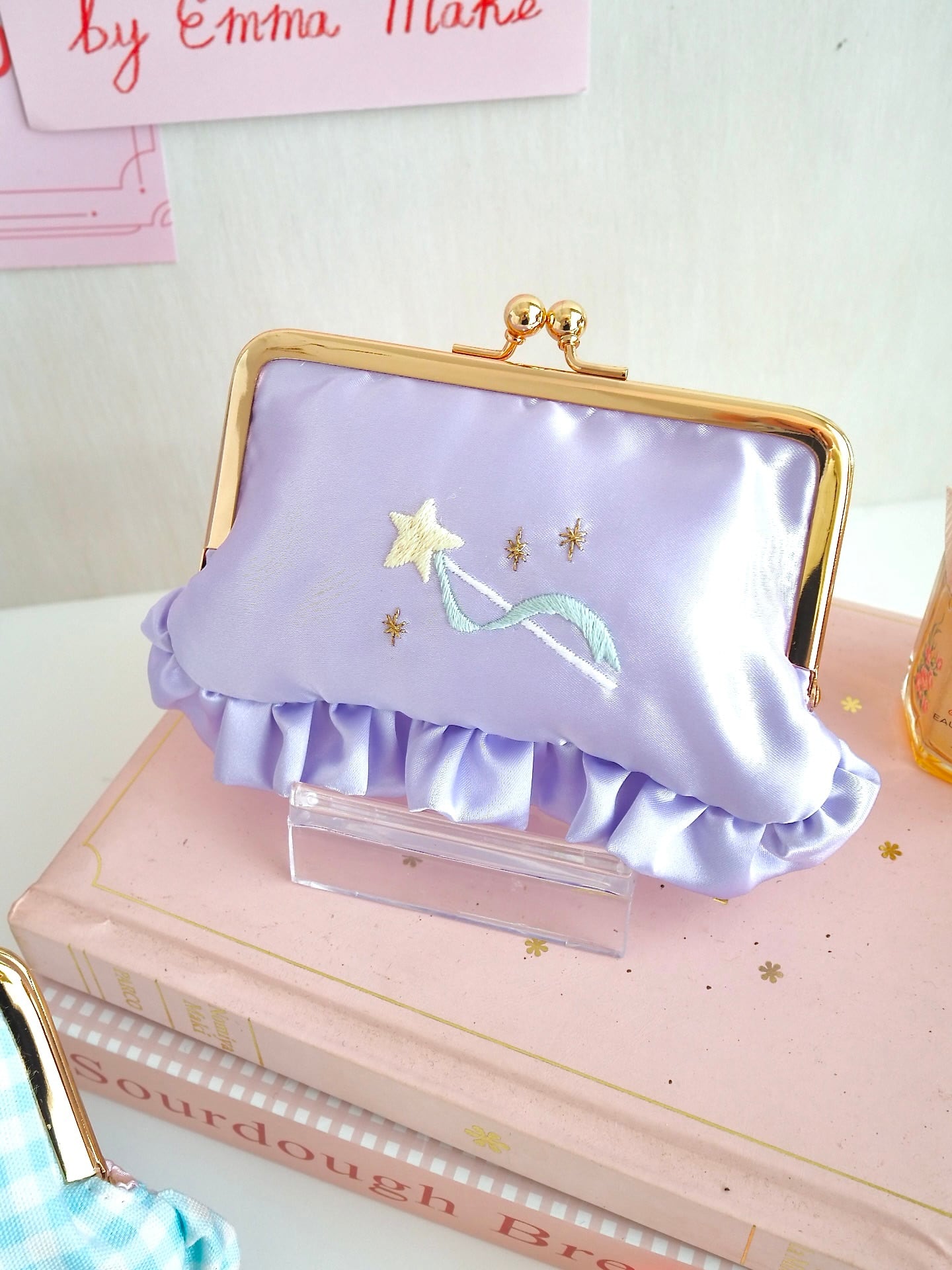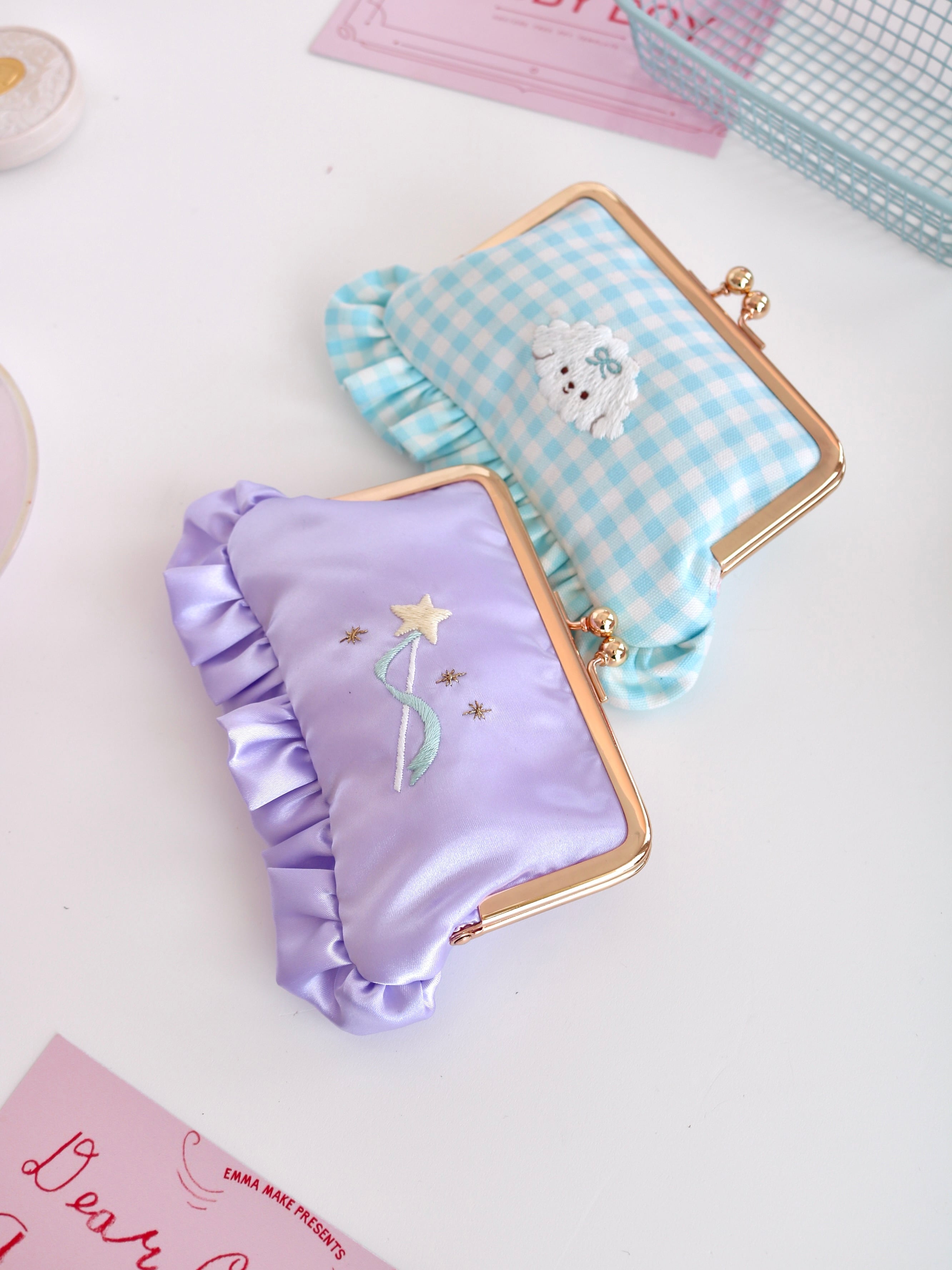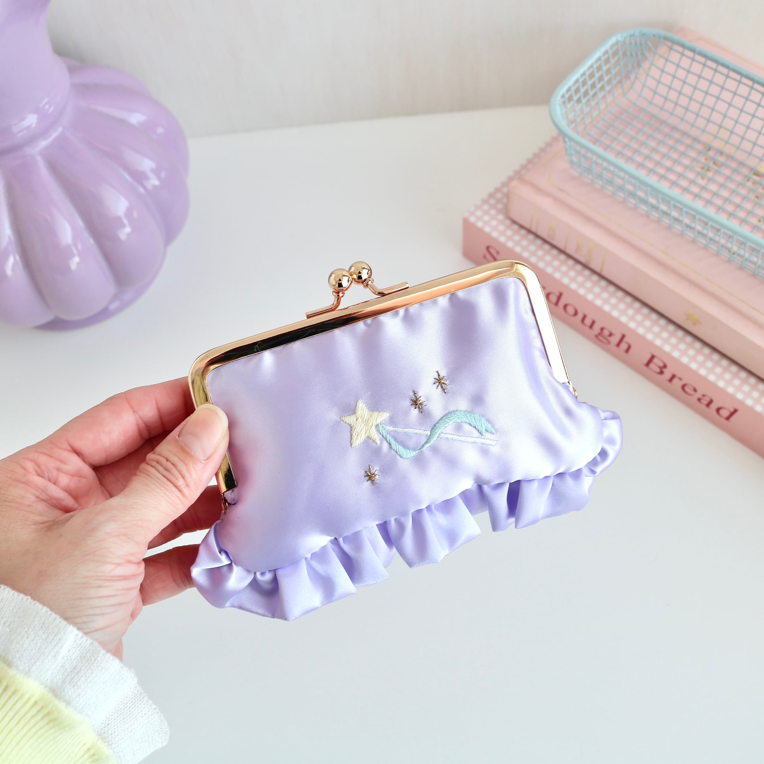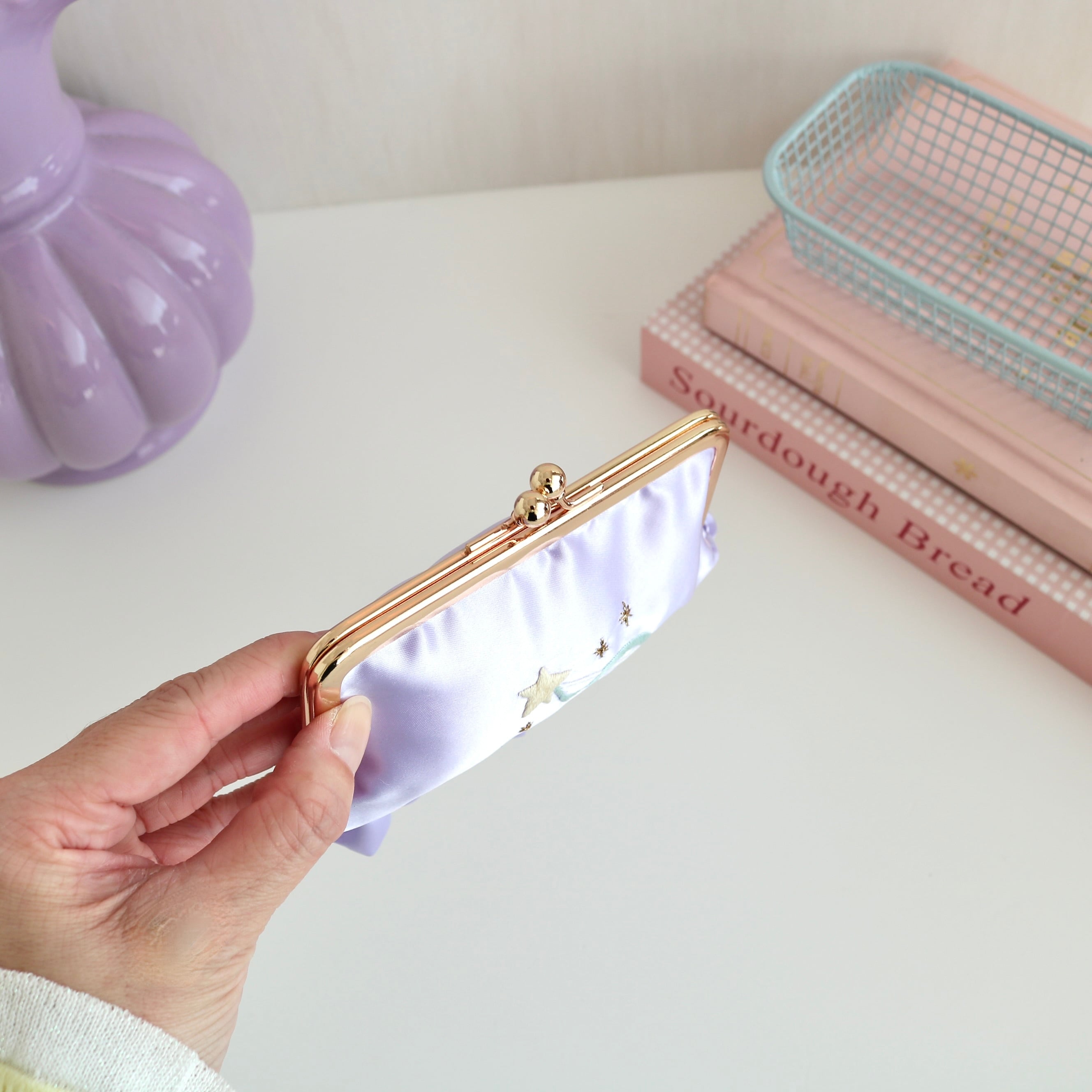 横長がま口コスメポーチ(むらさきサテン/星ステッキ刺繍)