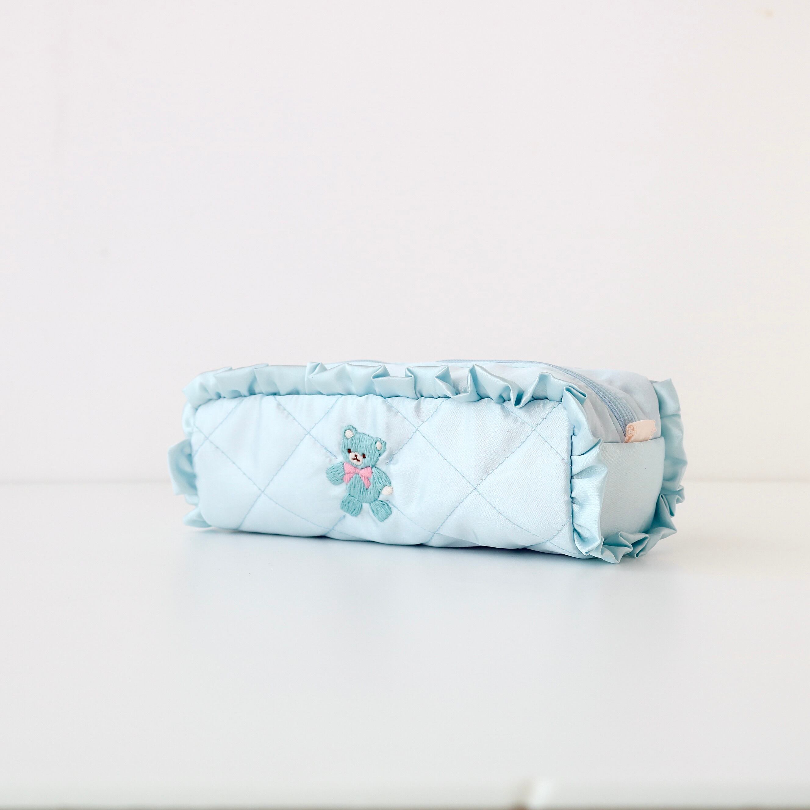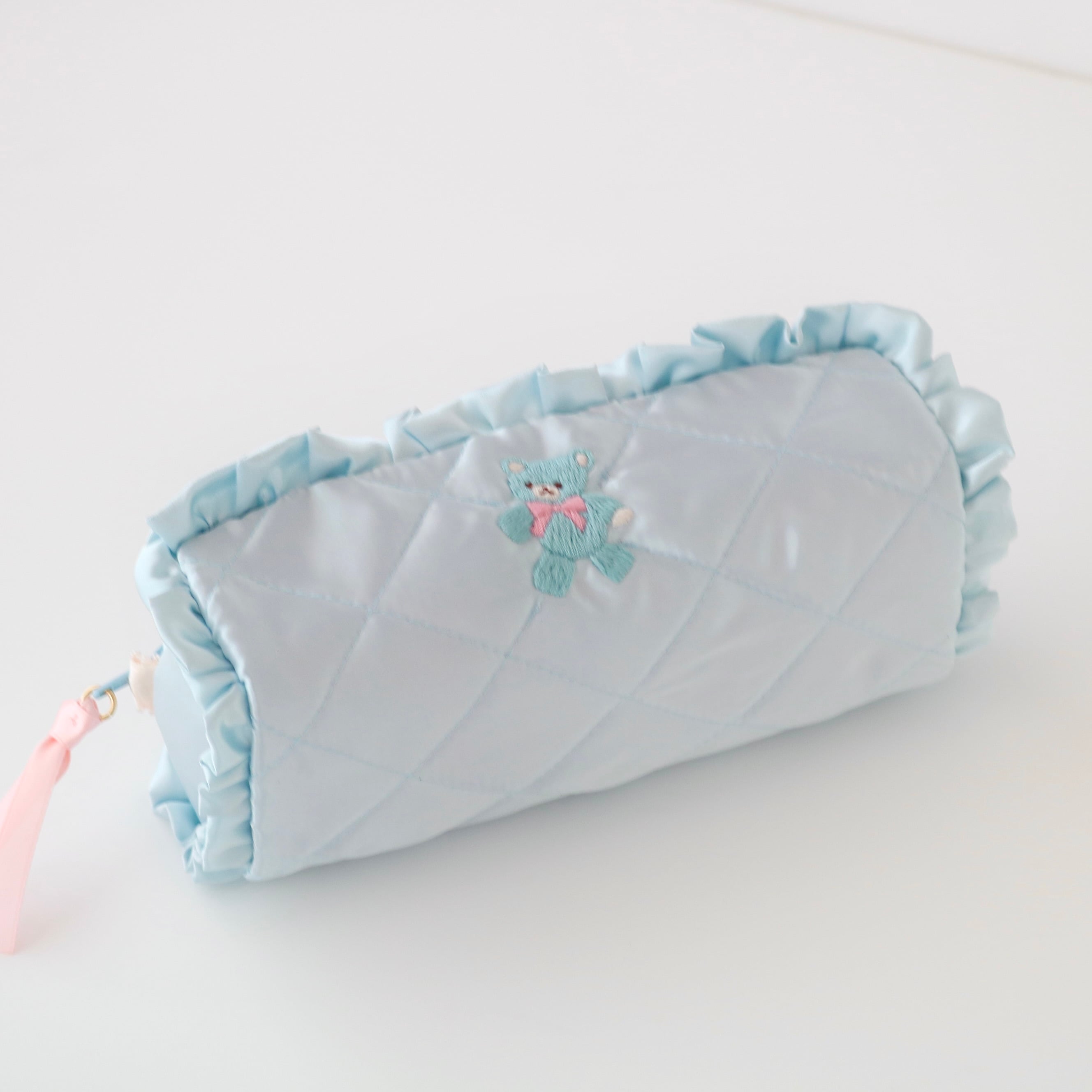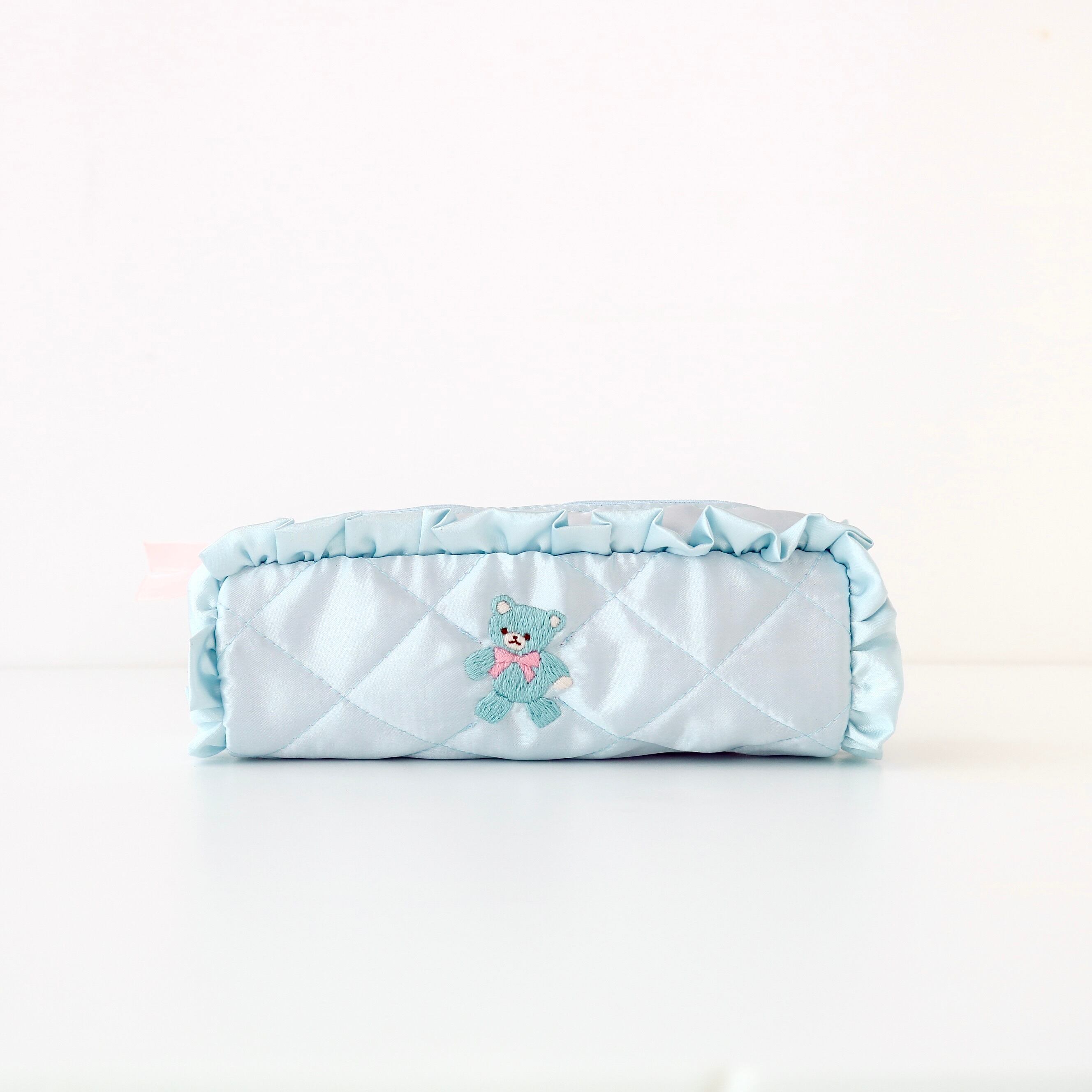 ペンケース(水色サテン/水色くま刺繍)