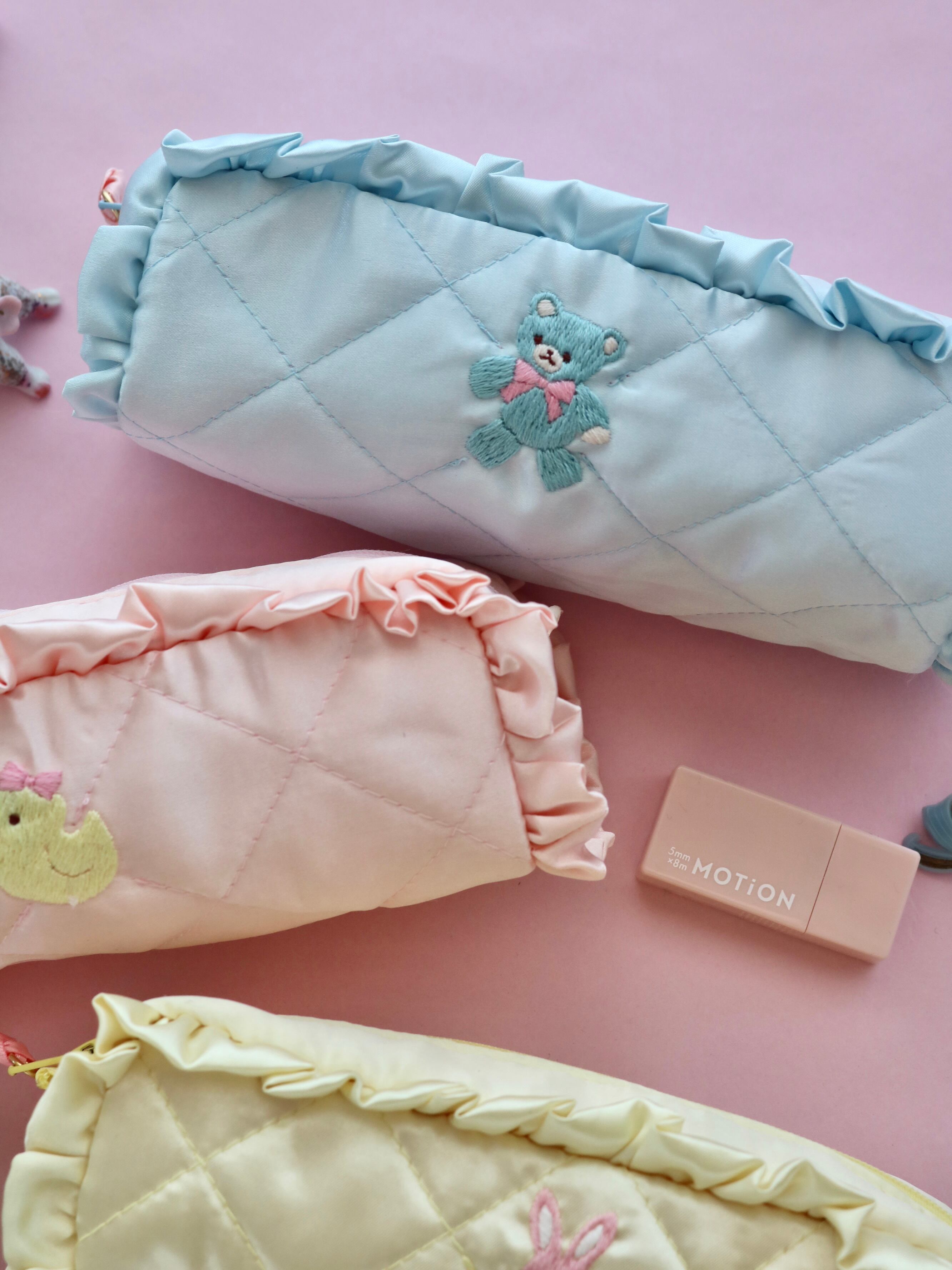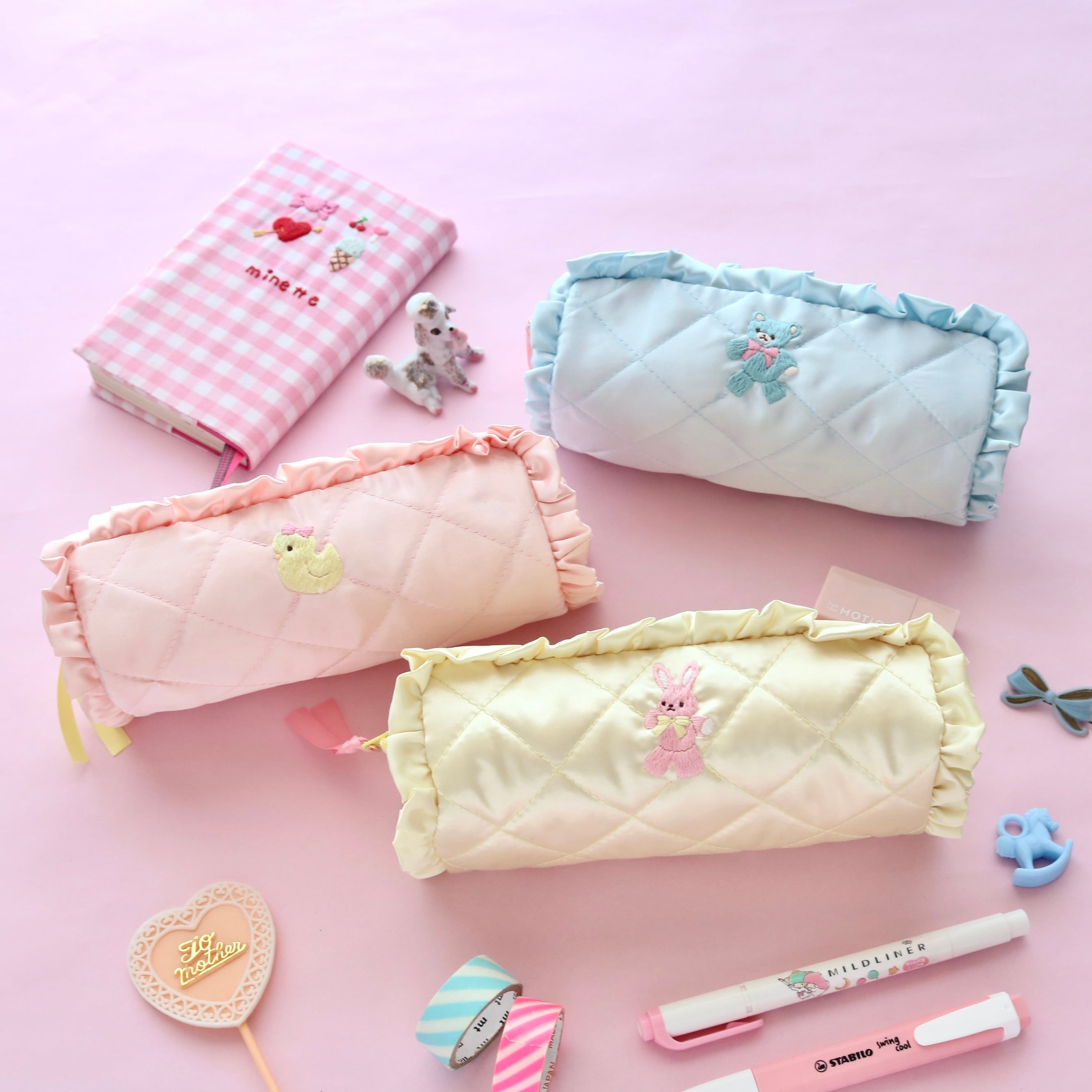 minette / ミネット刺繍 / ペンケース / キルティングポーチ / 刺繍ポーチ / ベビーカラー / ハンドメイド / ガーリー雑貨 / 新生活アイテム / プレゼントにおすすめ