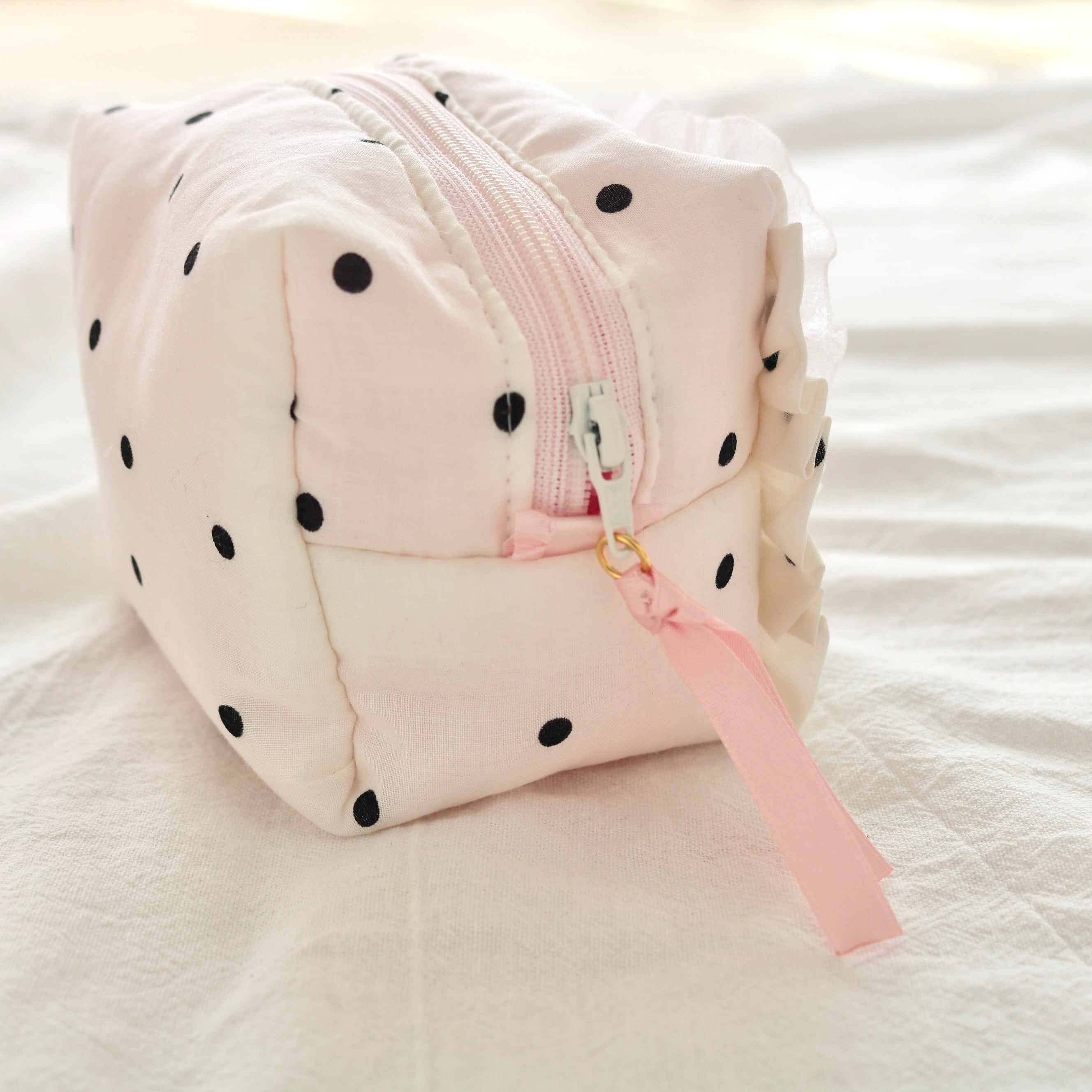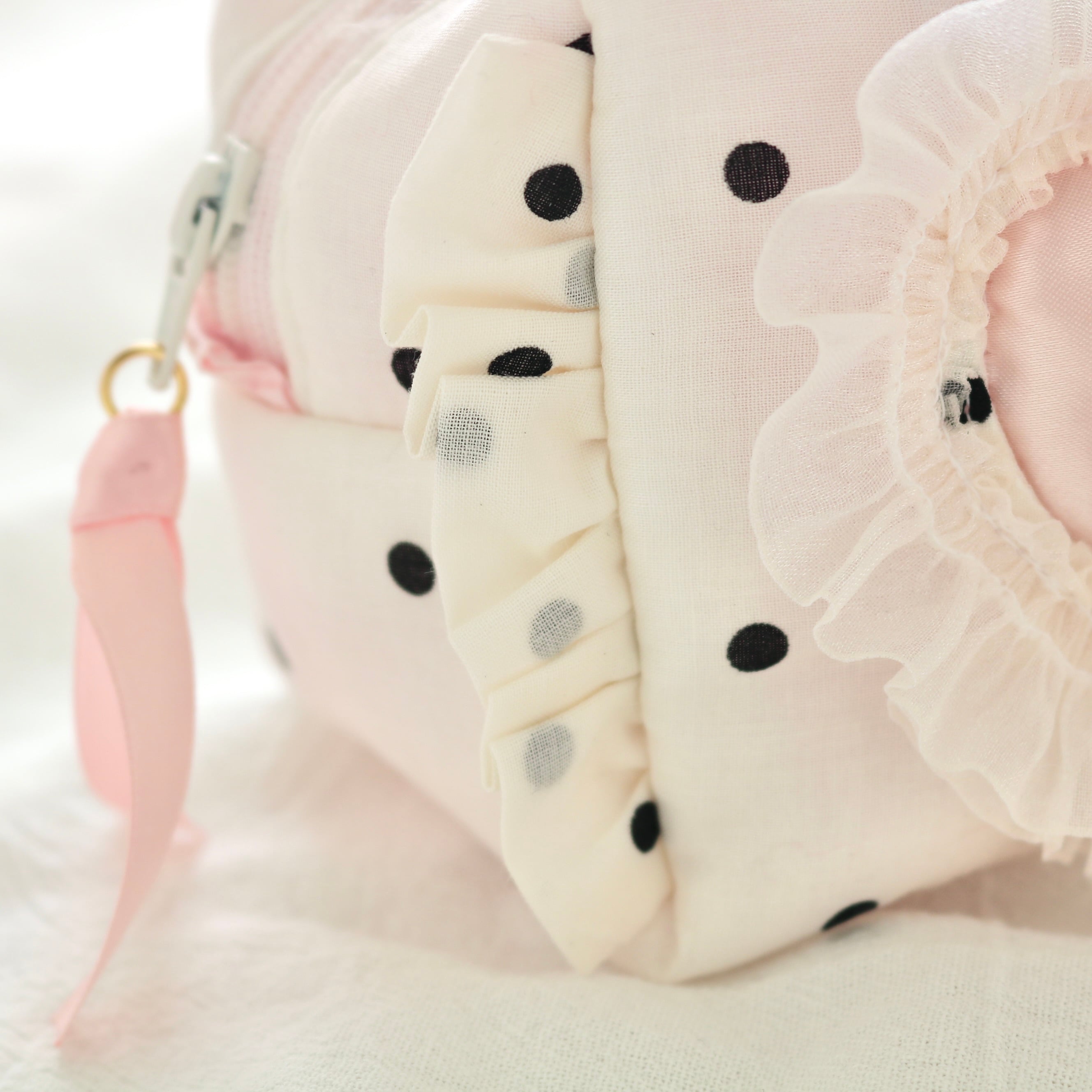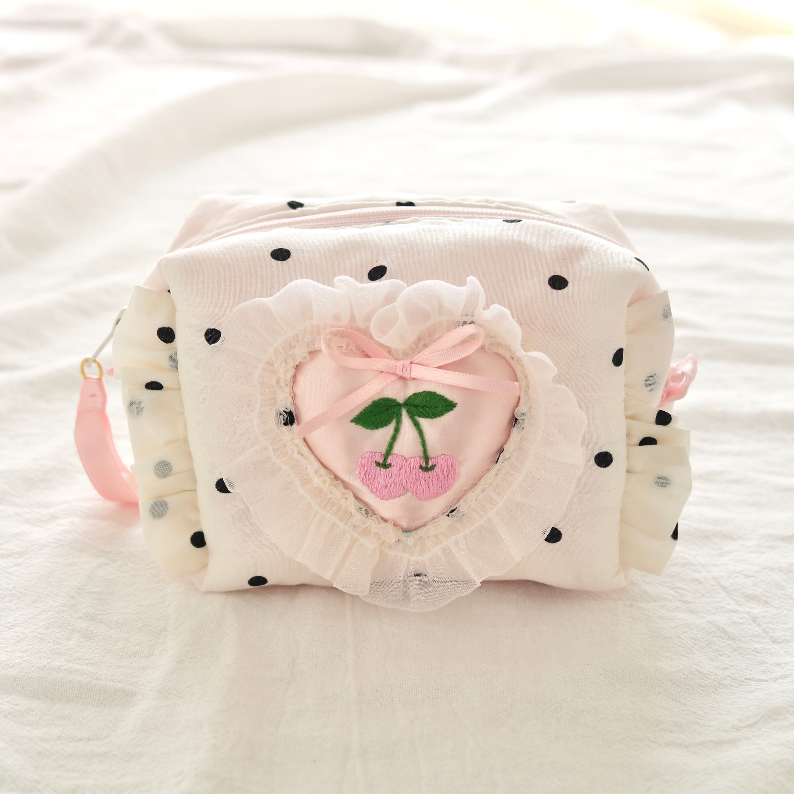 フレンチガーリー / 韓国雑貨 / チェリー / さくらんぼ柄 / ドット柄 / 水玉 / メイクポーチ / 化粧ポーチ / 小物入れ / 推し活 / サンリオ好き / ガーリーファッション / ハンドメイド風 / ハートモチーフ / リボン / チュールフリル