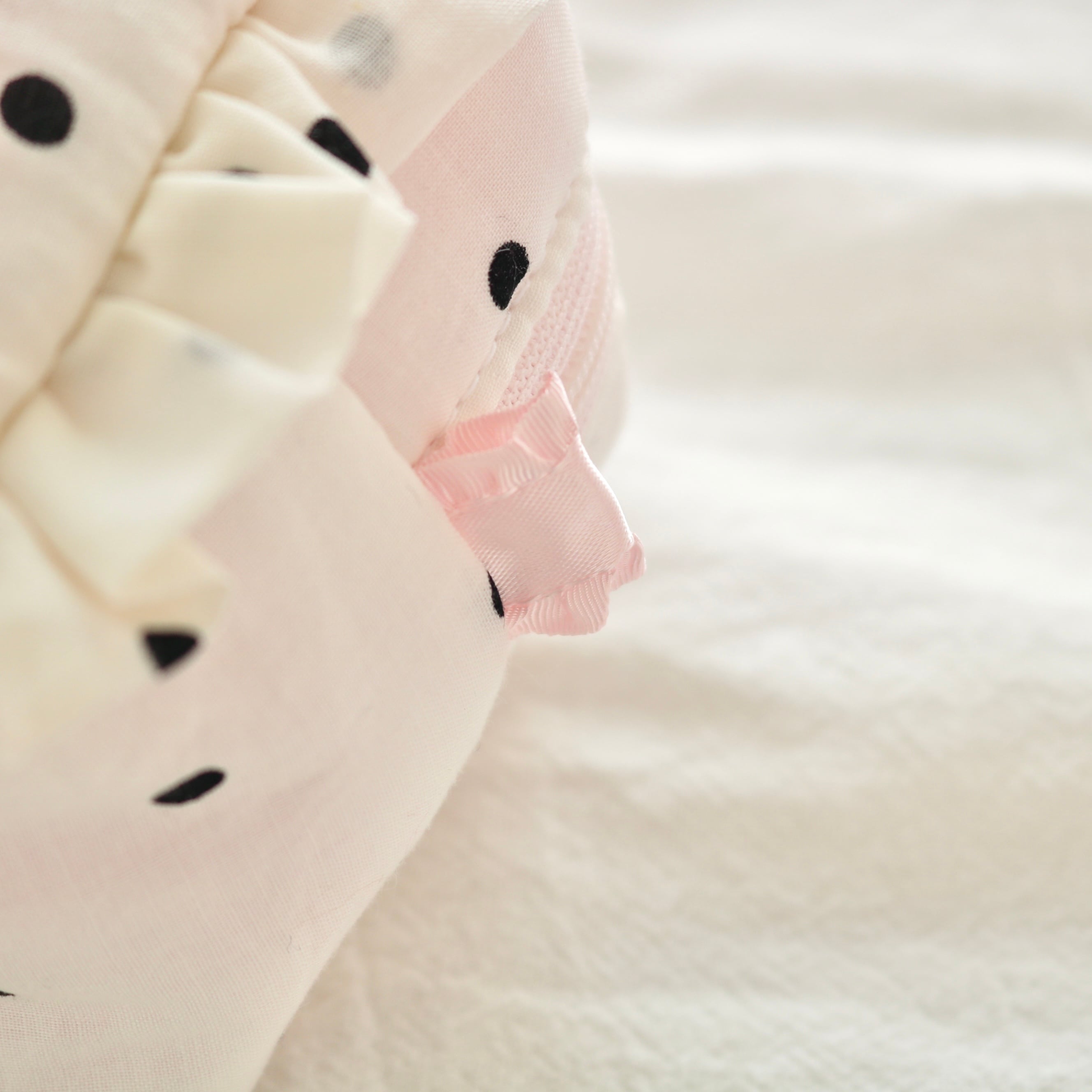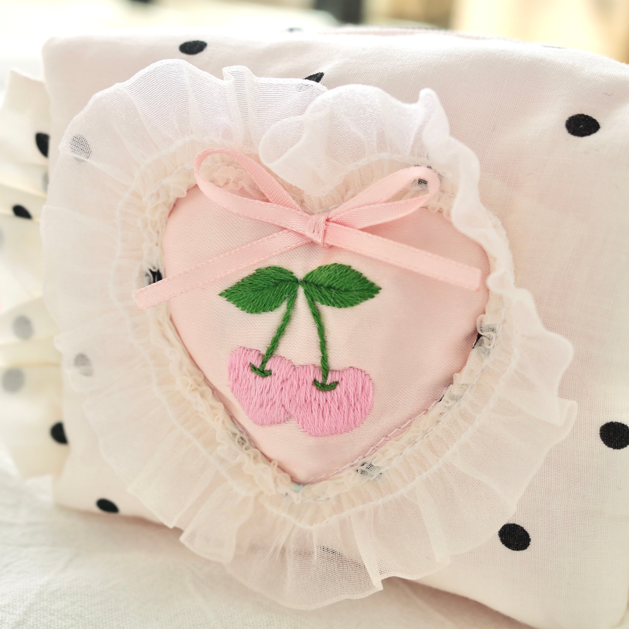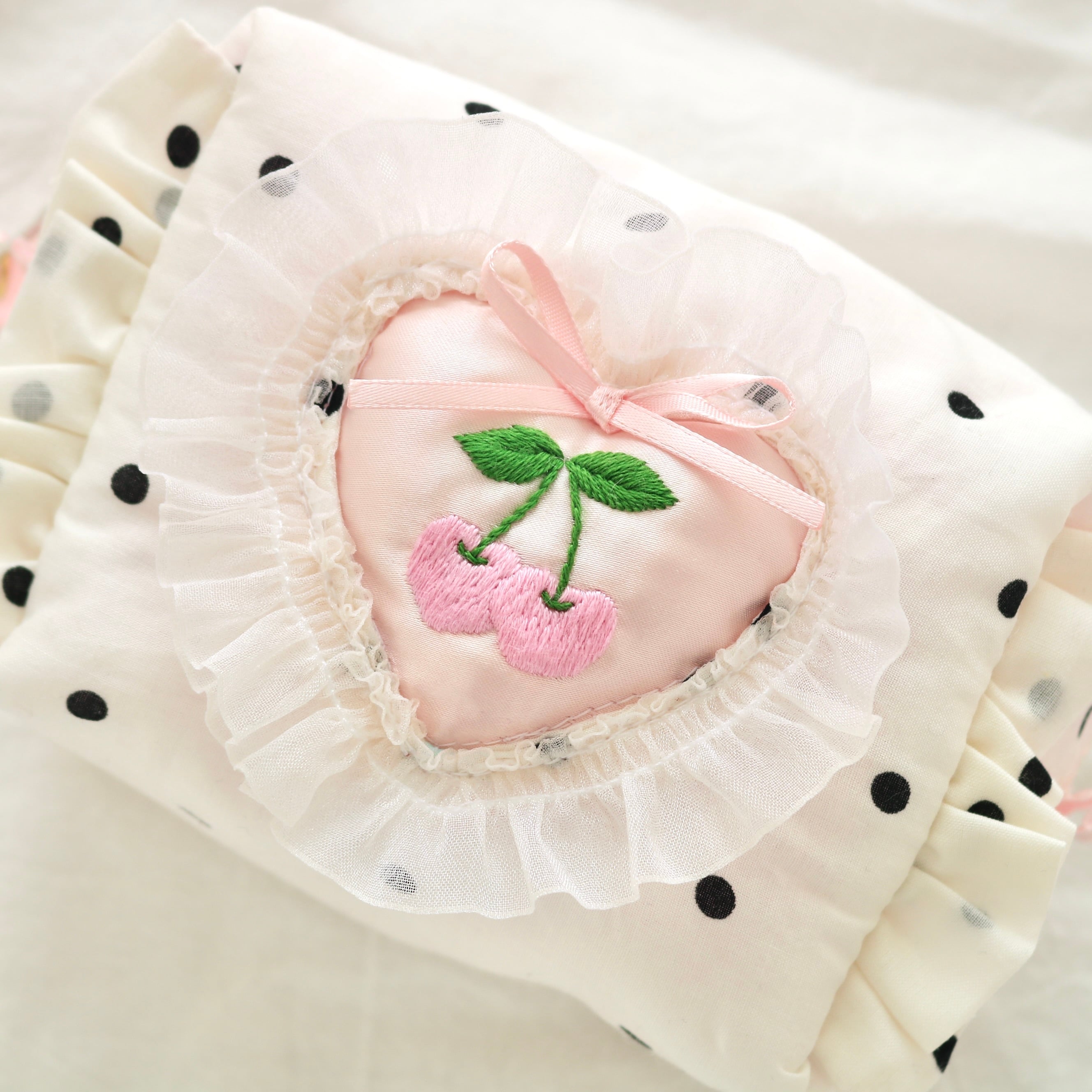 淡いピンクとホワイトを基調としたドット柄のボディに、目を惹くのは中央の立体的なオーガンジーフリルとハートの刺繍。ぷっくりとしたさくらんぼの刺繍と、ちょこんと添えられたサテンリボンがアクセントになり、フレンチガーリーな世界観を演出します。
