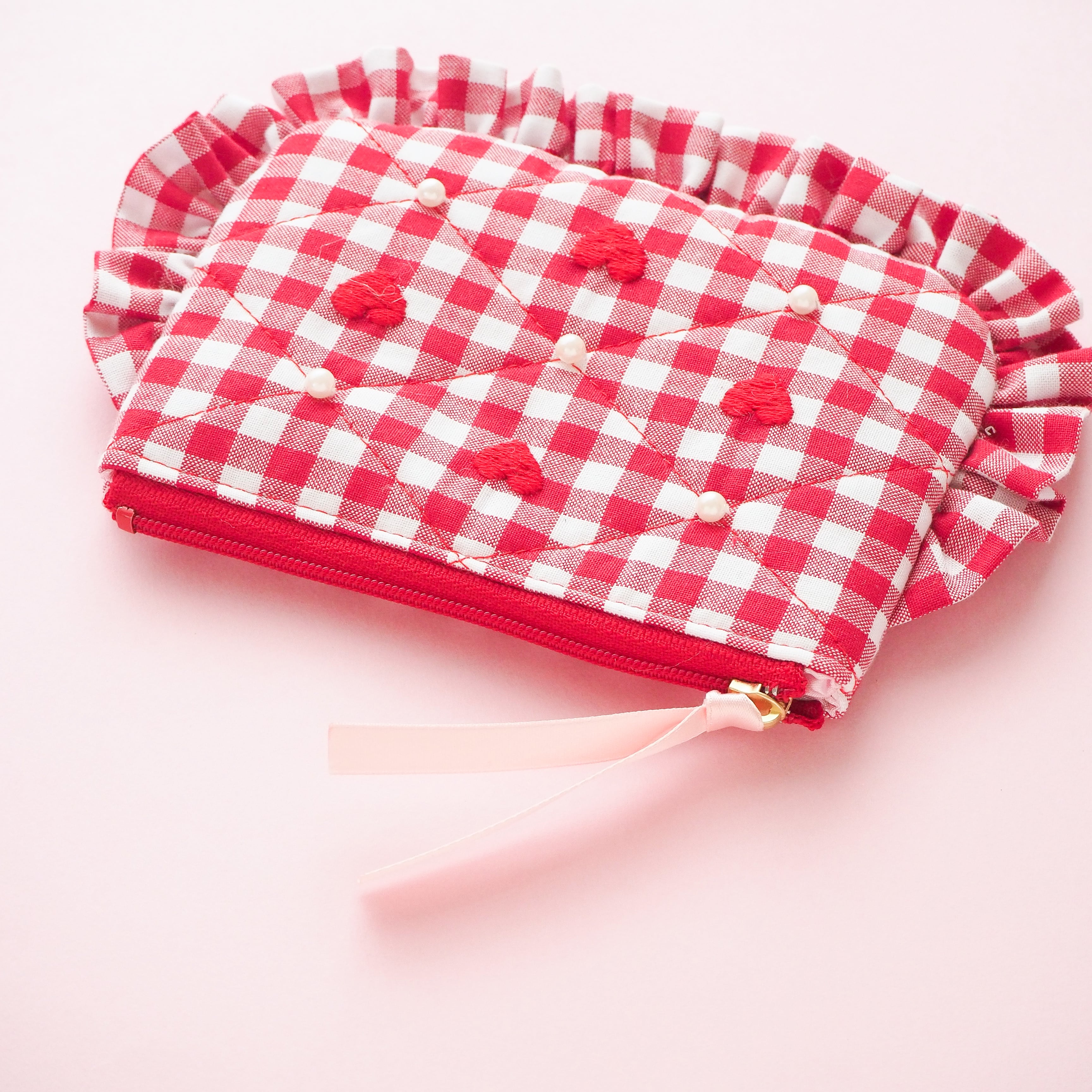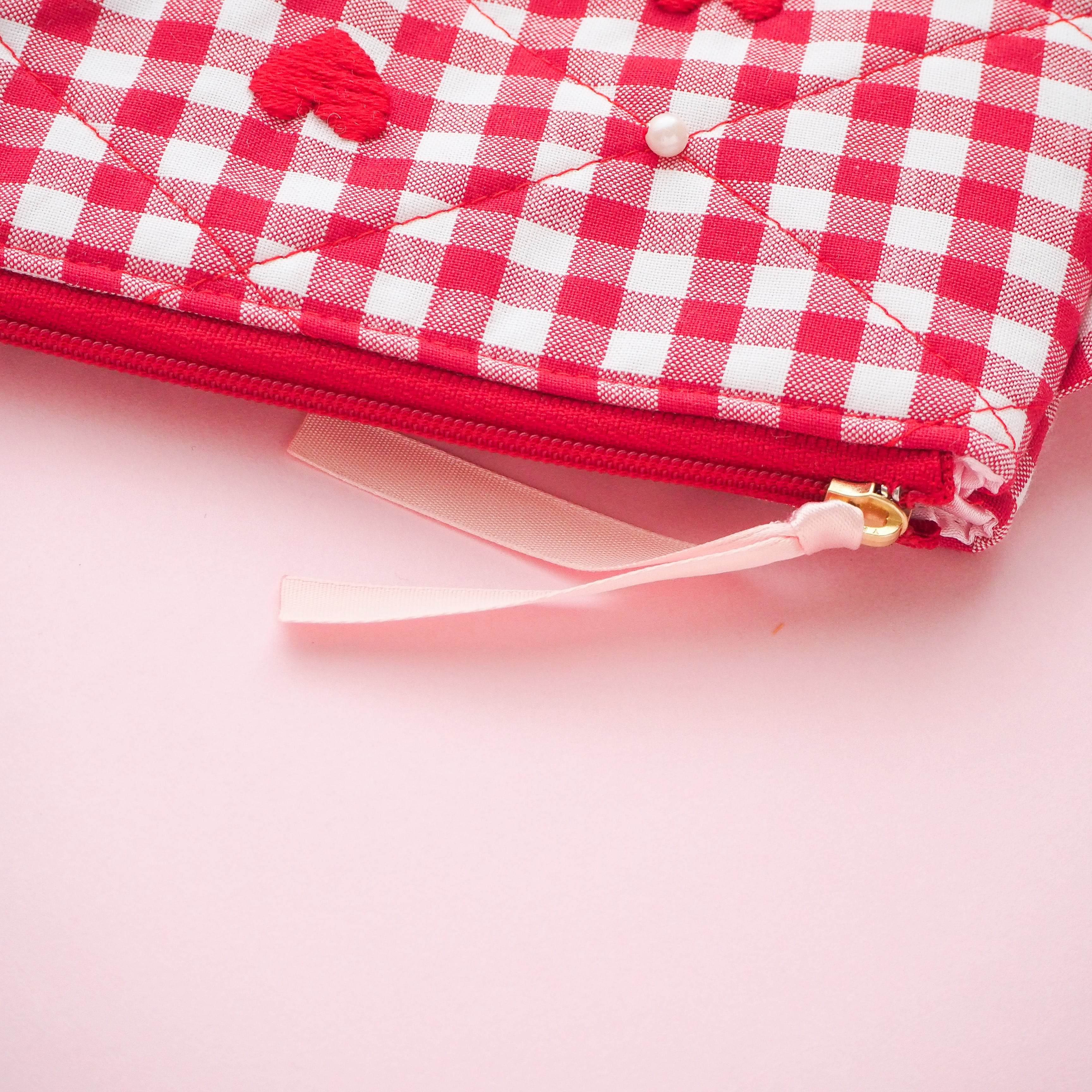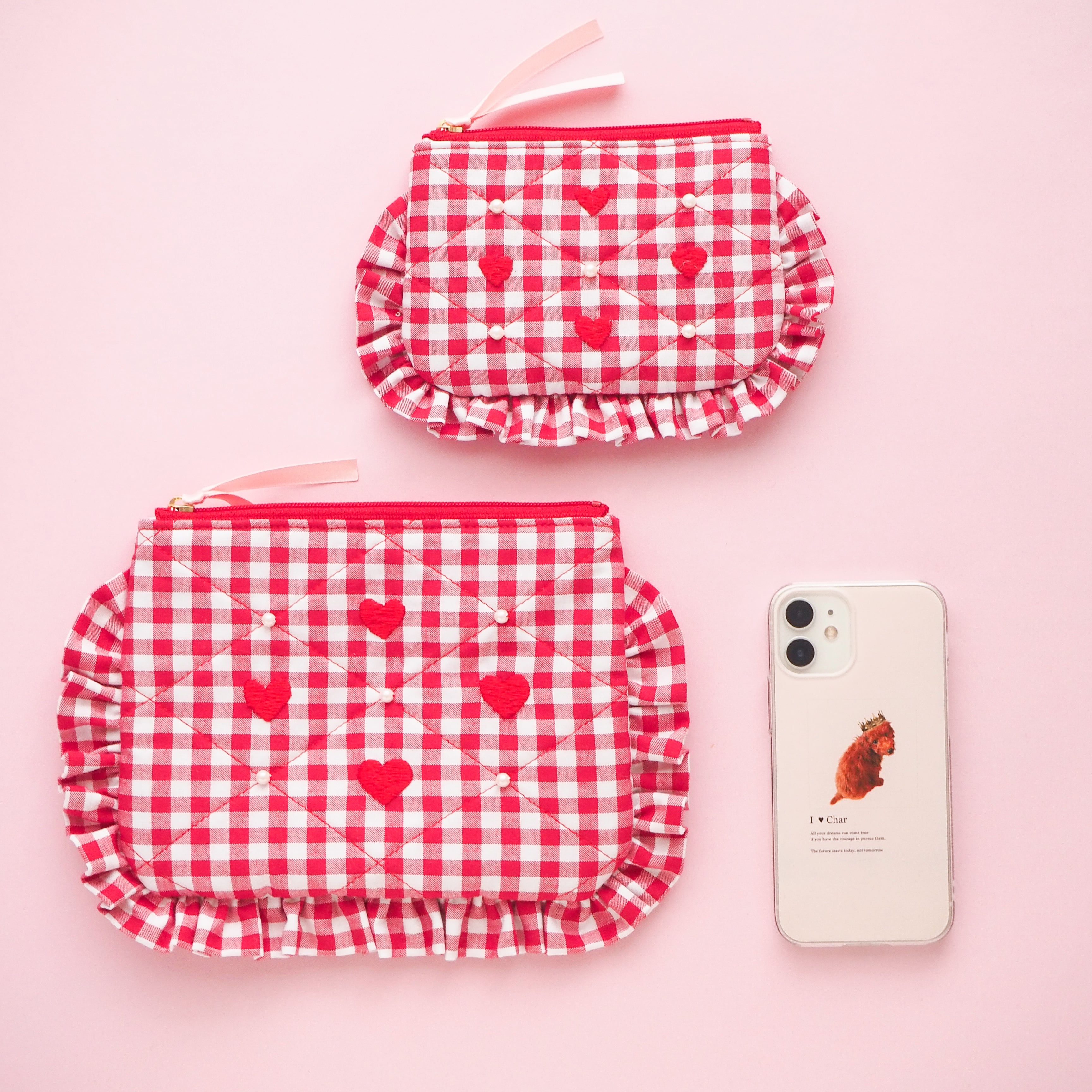ぺたんこポーチ(S)(赤ギンガム/キルティング刺繍)