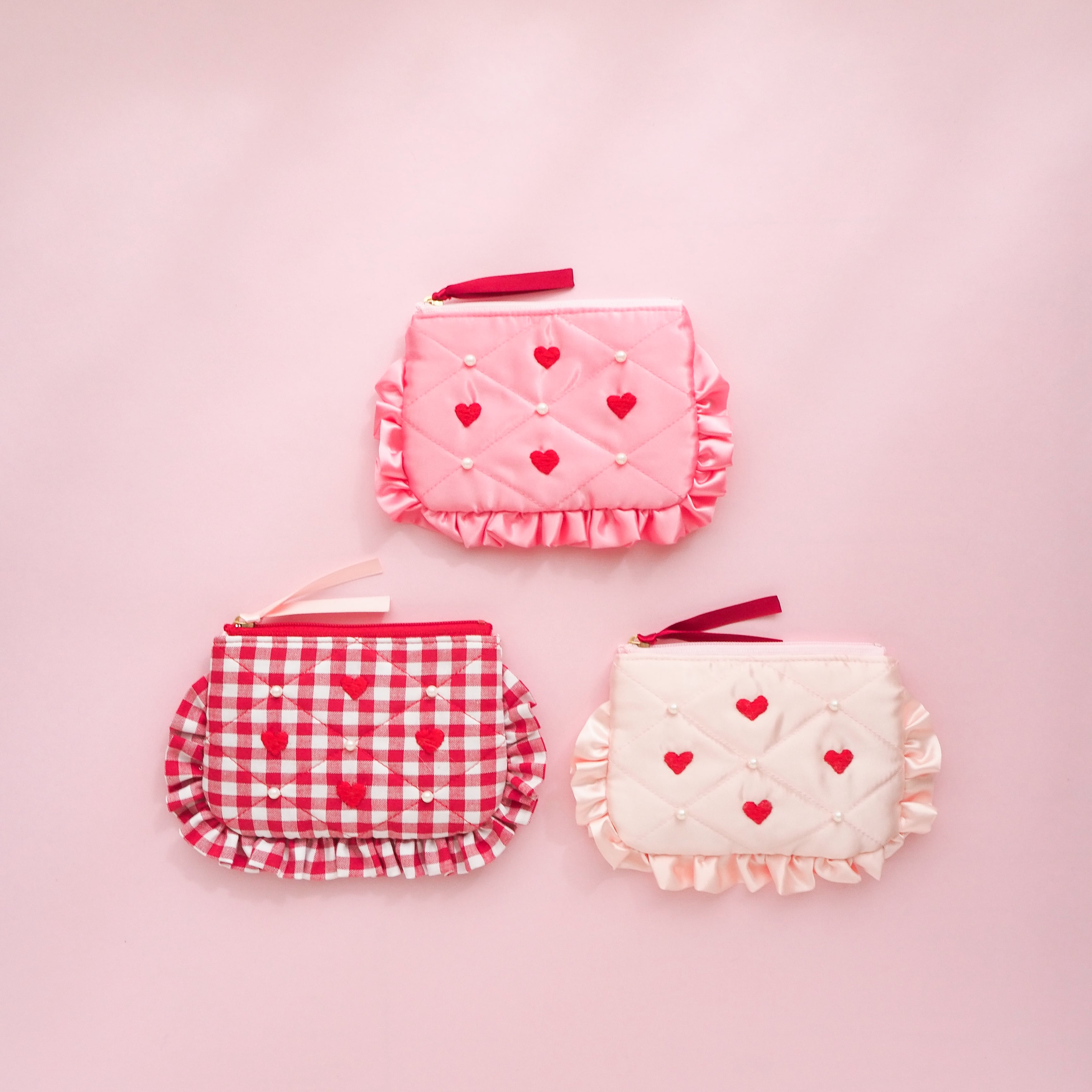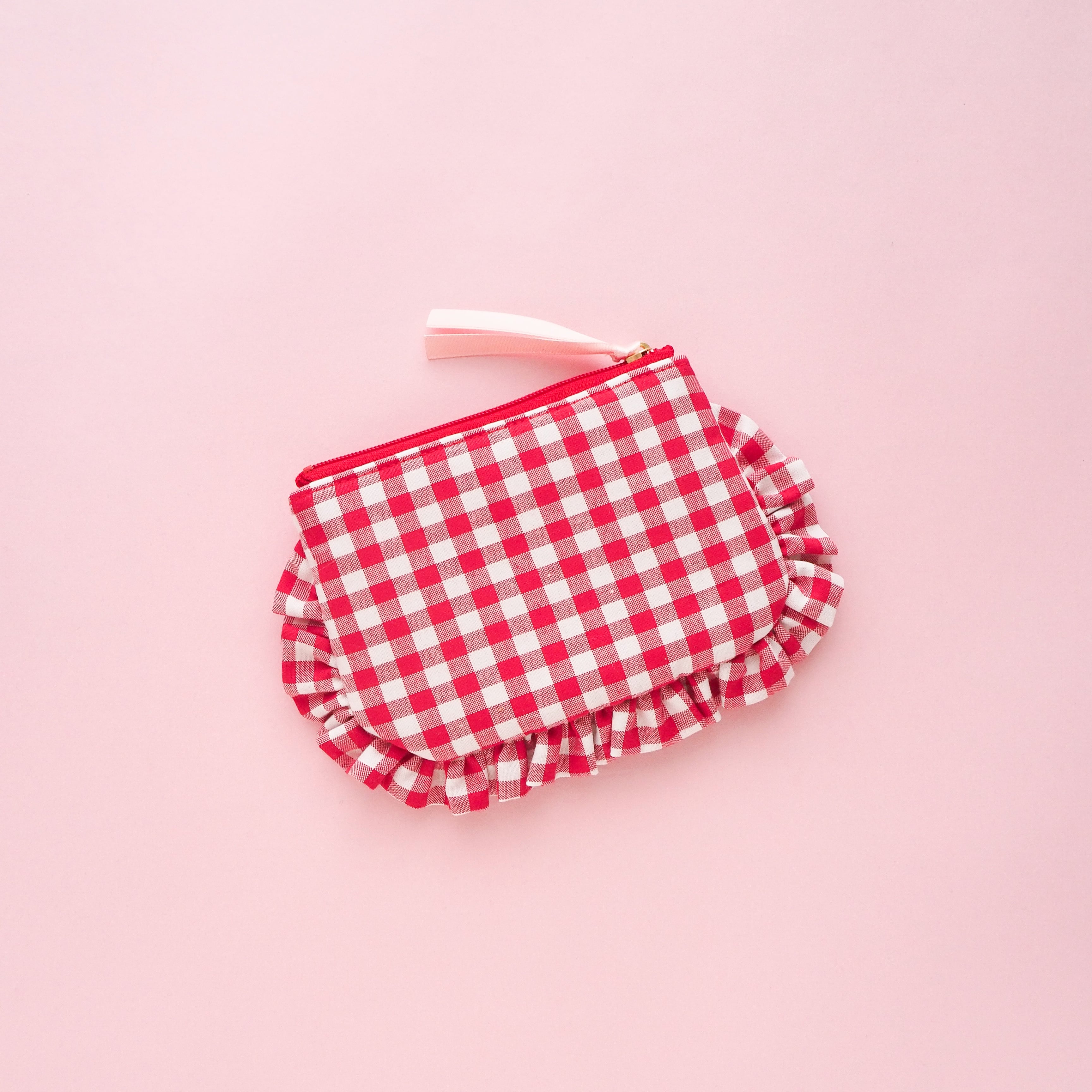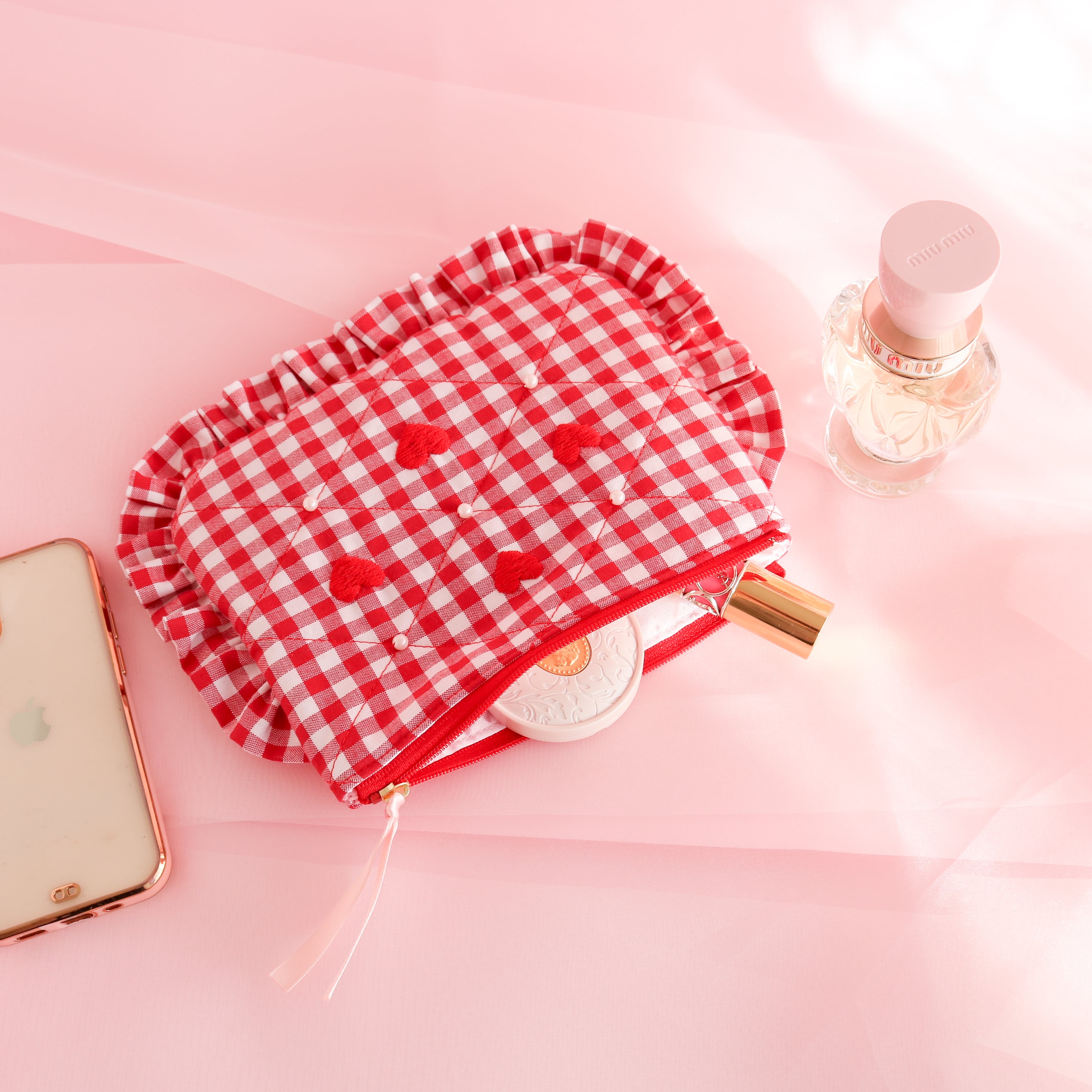 ぺたんこポーチ(S)(赤ギンガム/キルティング刺繍)