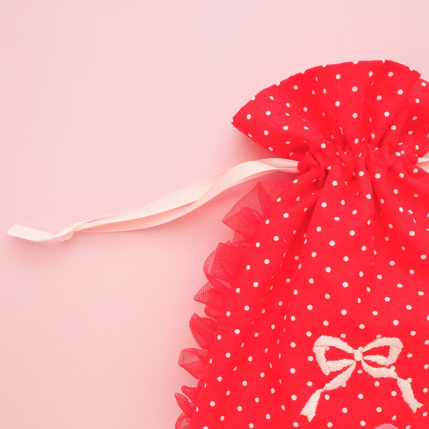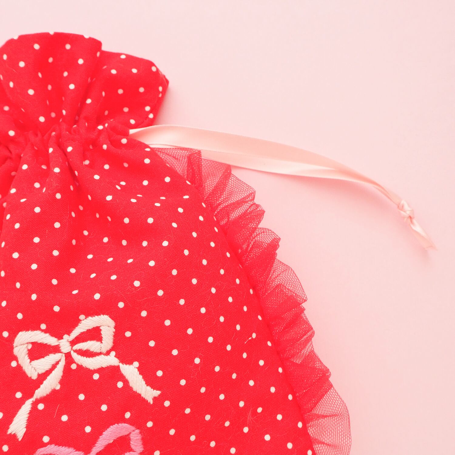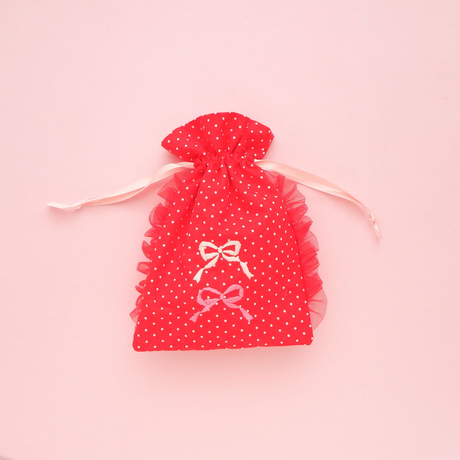 巾着ポーチ(赤ドット/リボン刺繍)