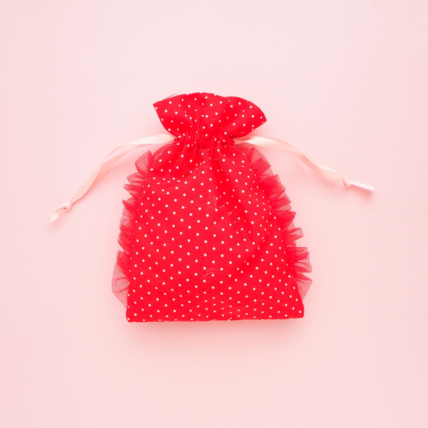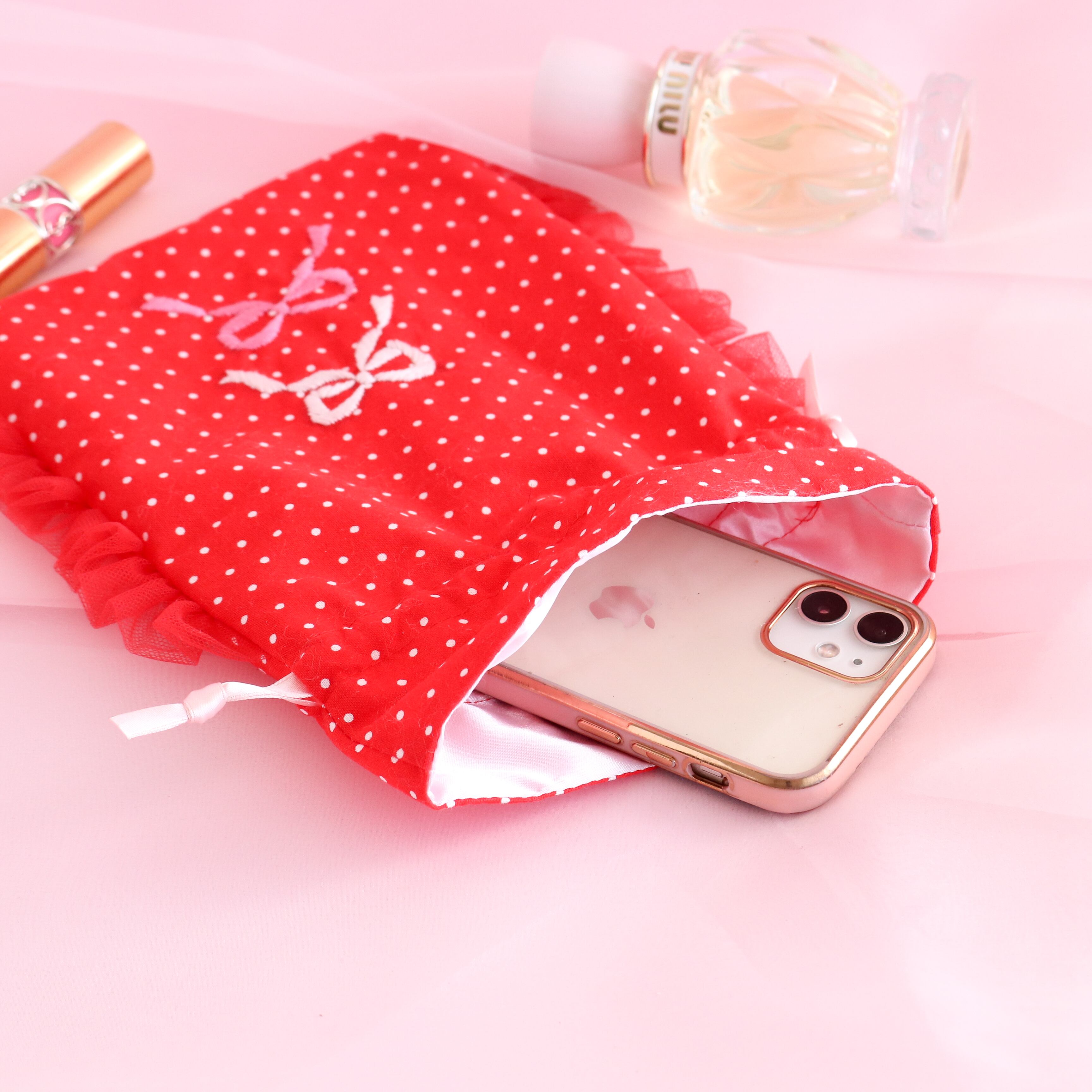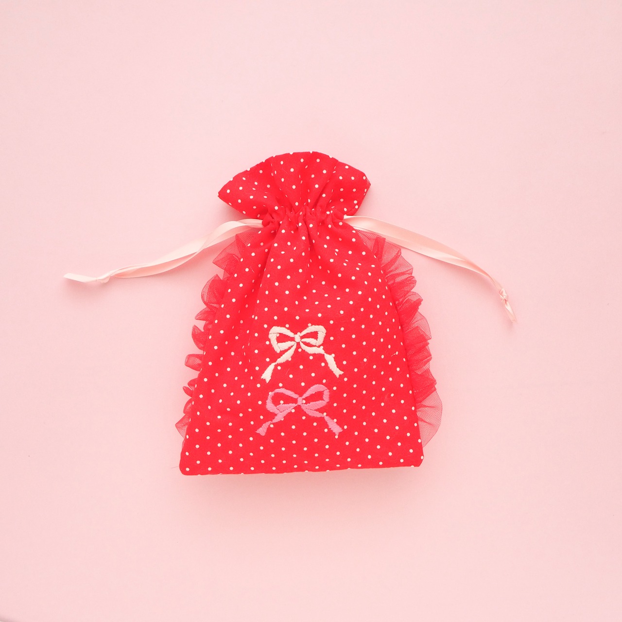 巾着ポーチ(赤ドット/リボン刺繍)