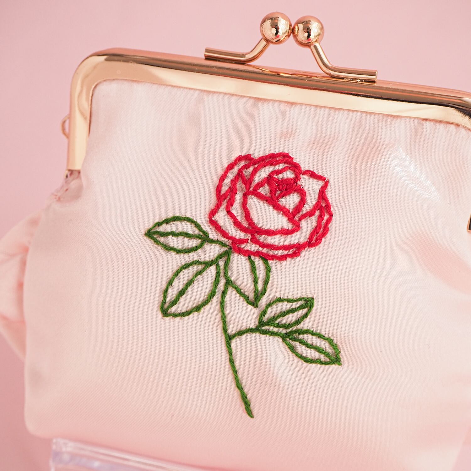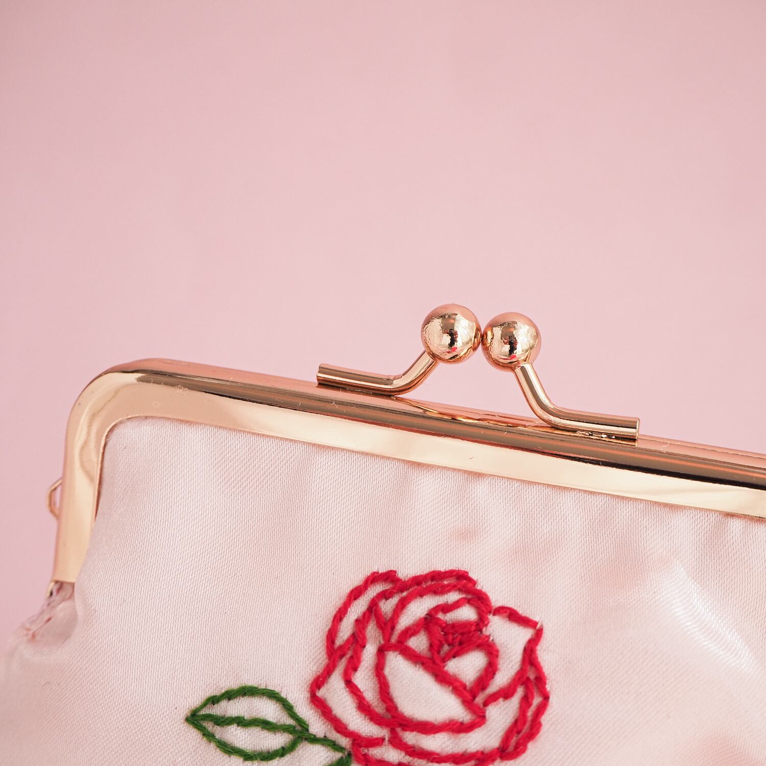 角型がま口ポーチ(ピンク/バラ刺繍)