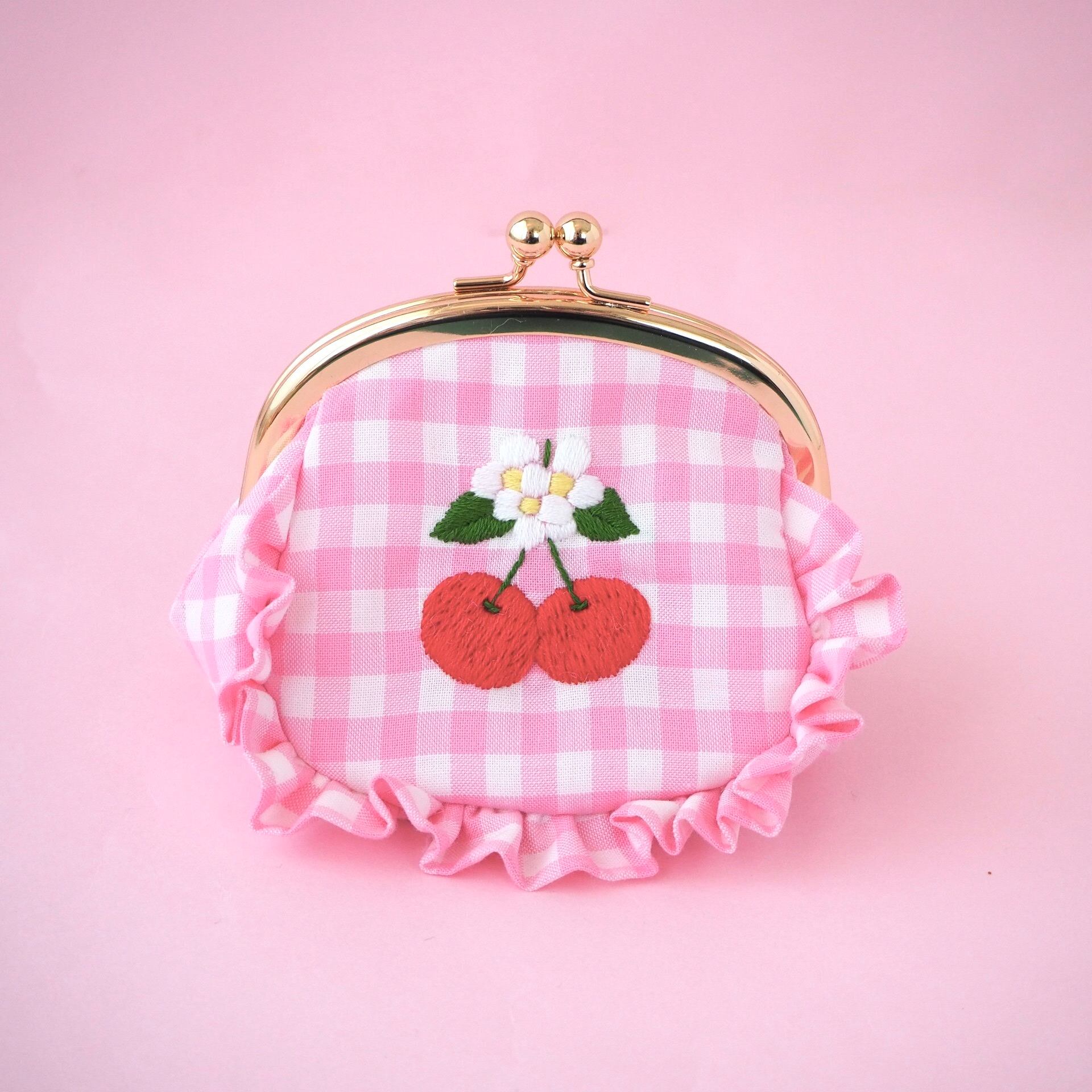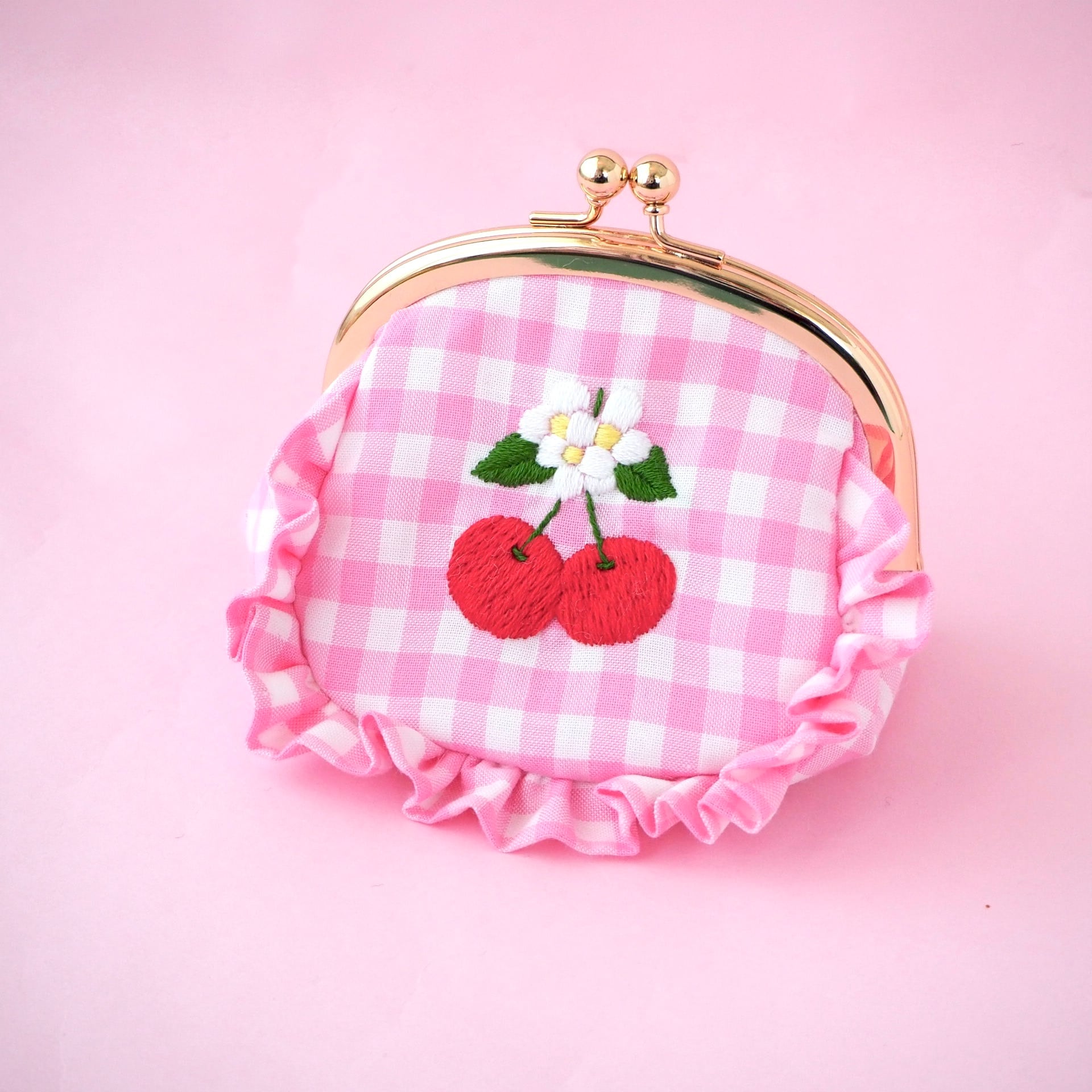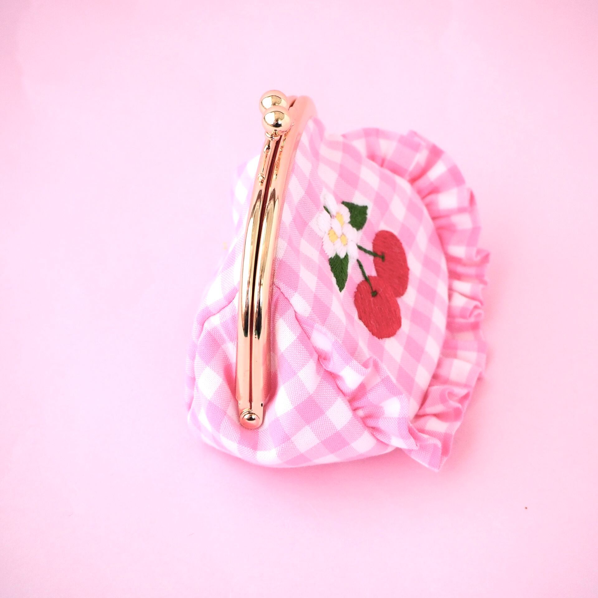 がま口ポーチ(ギンガムピンク/チェリーと花刺繍)