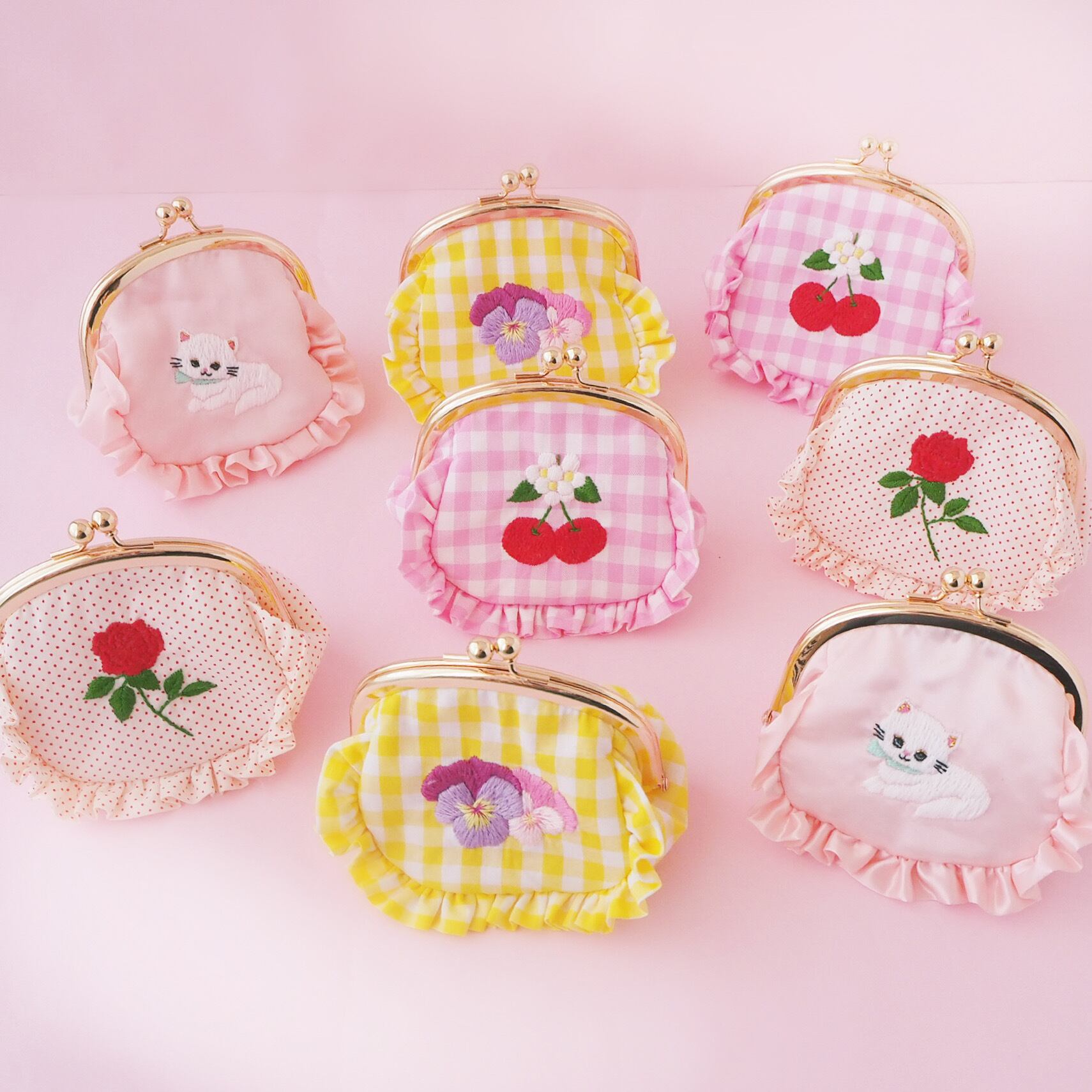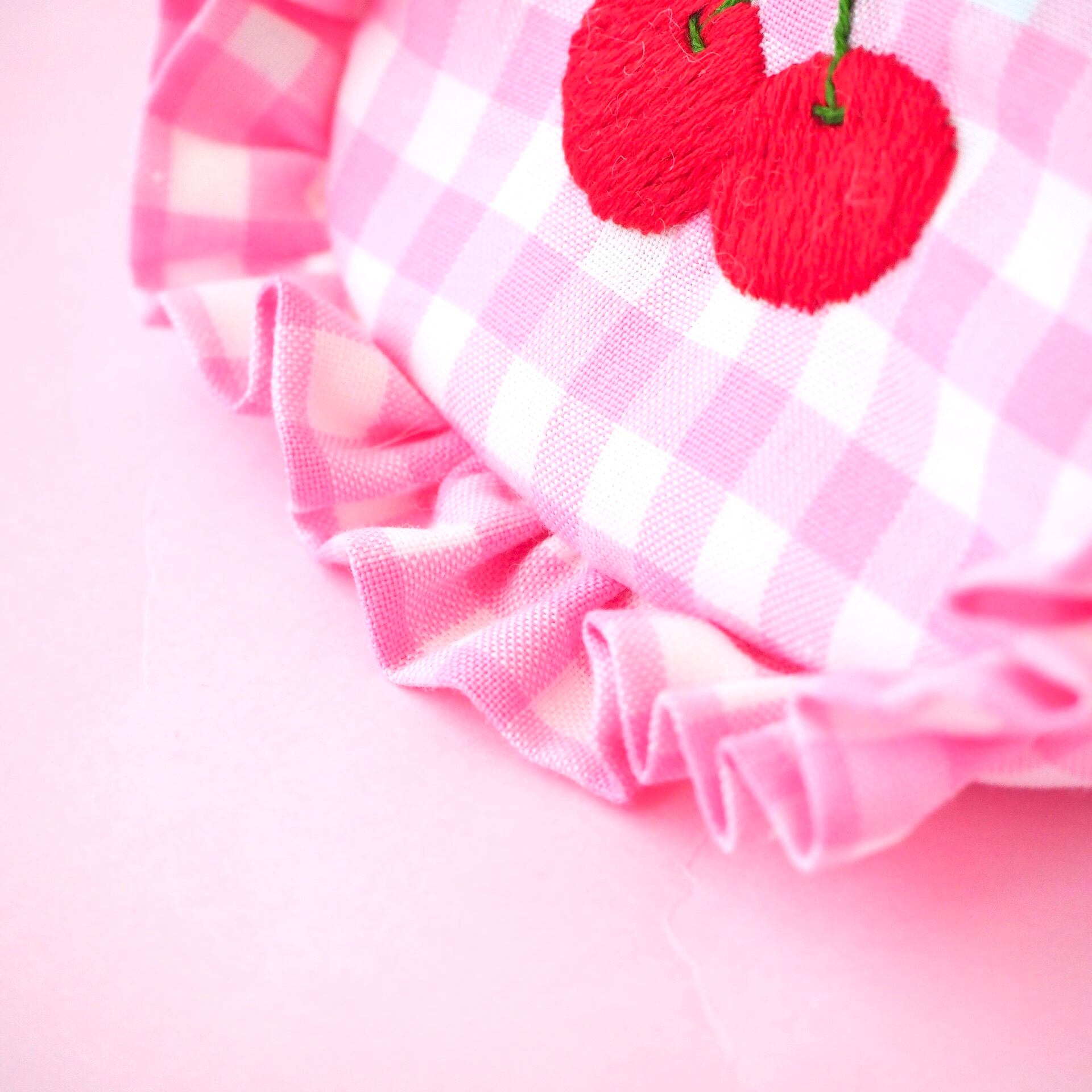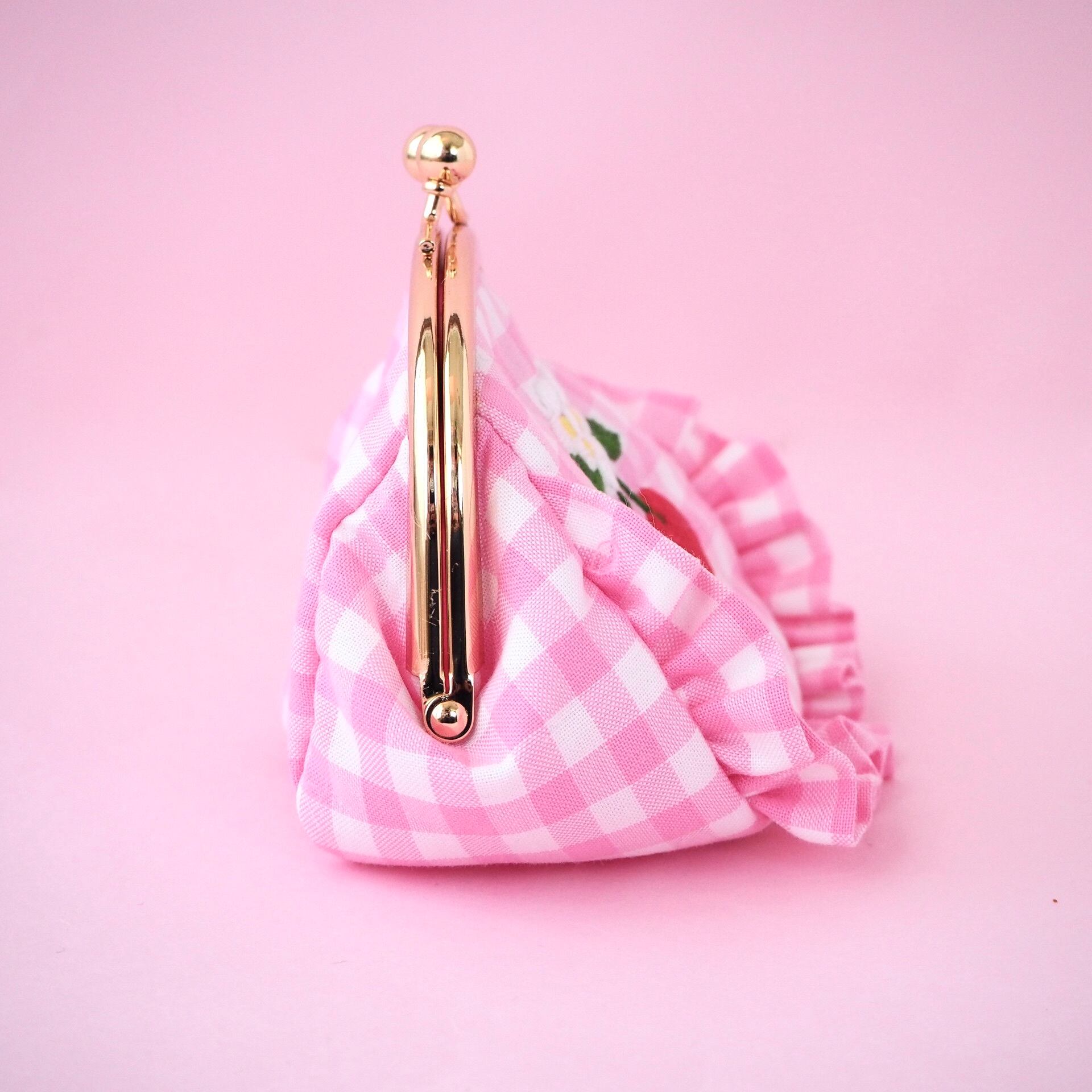 がま口ポーチ(ギンガムピンク/チェリーと花刺繍)