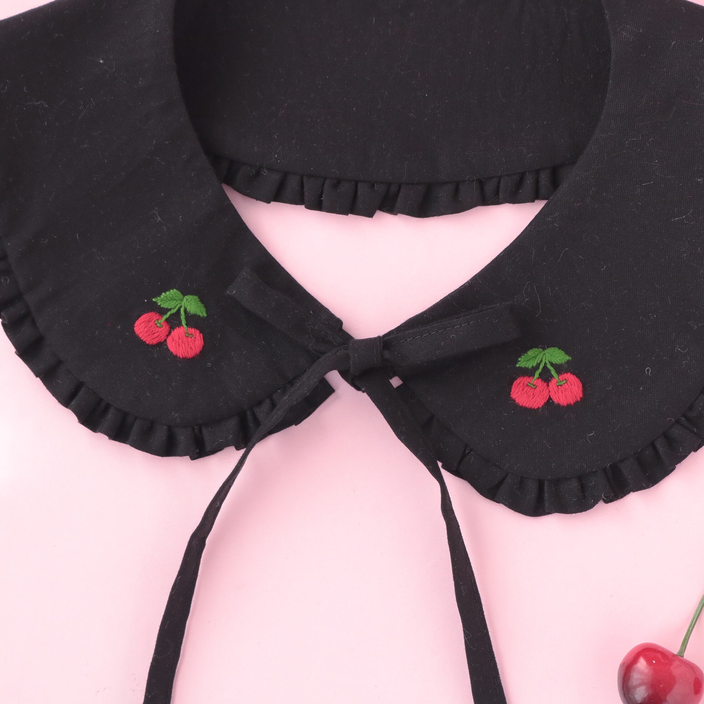 チェリー刺繍で可愛く仕上げたベーシックな形のつけ襟です。