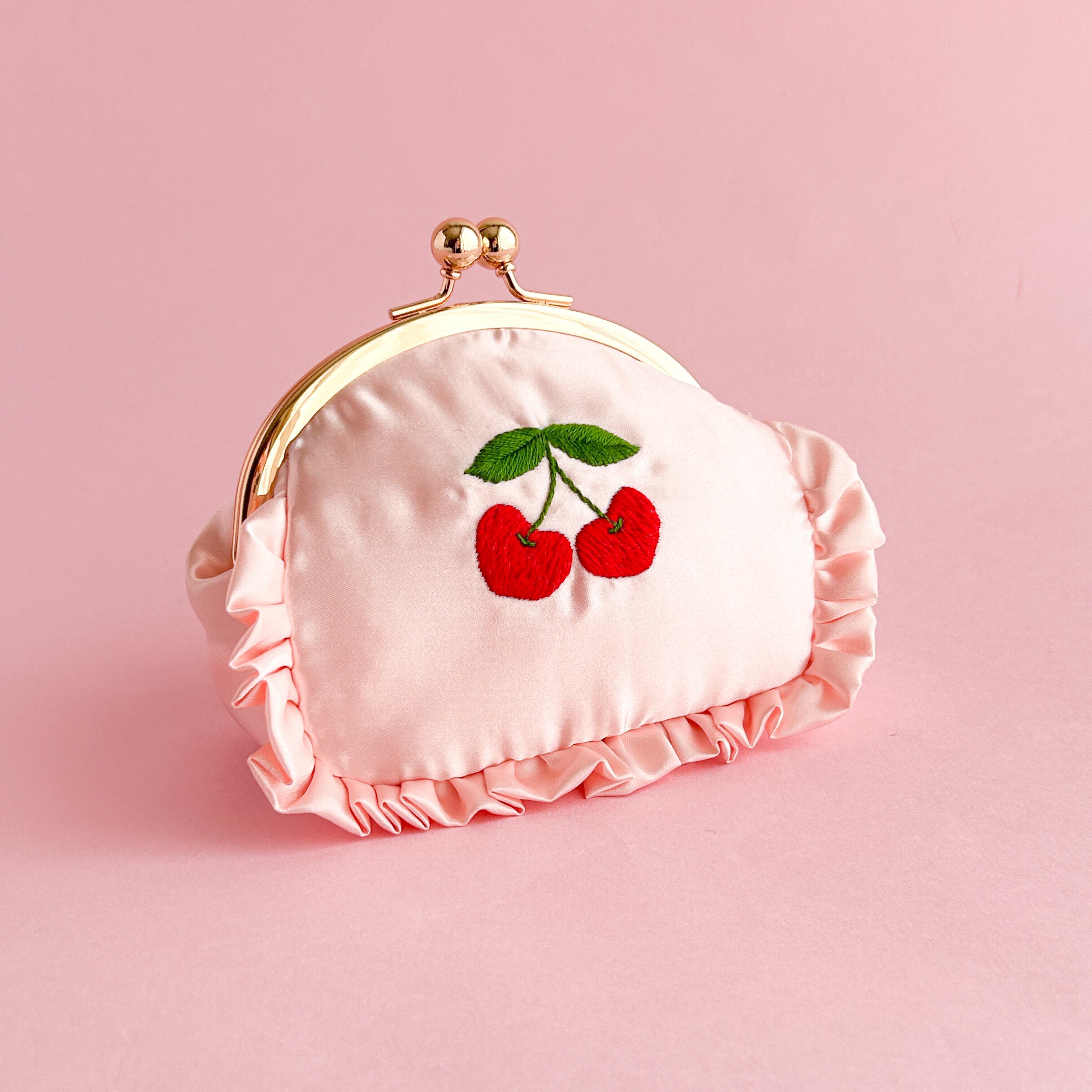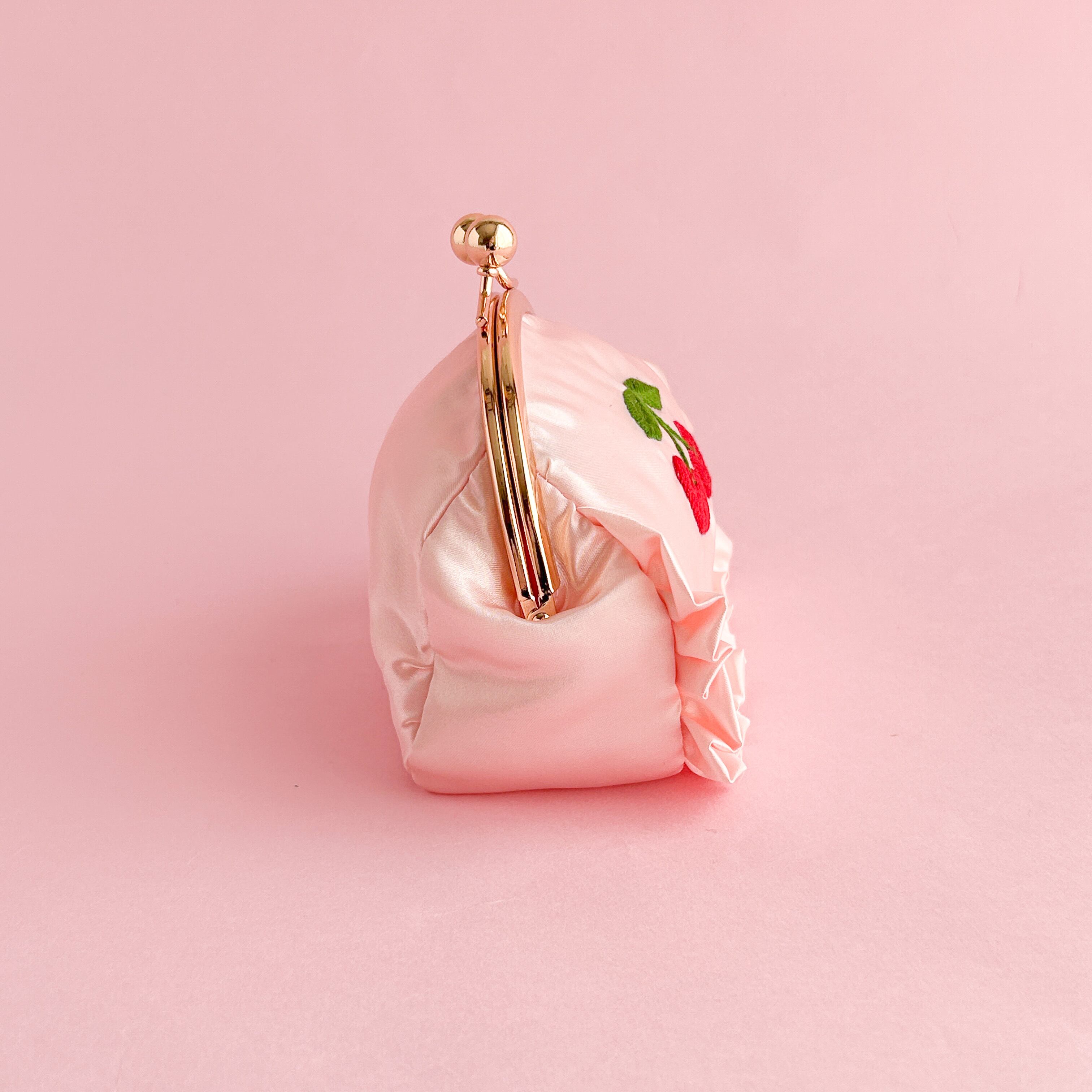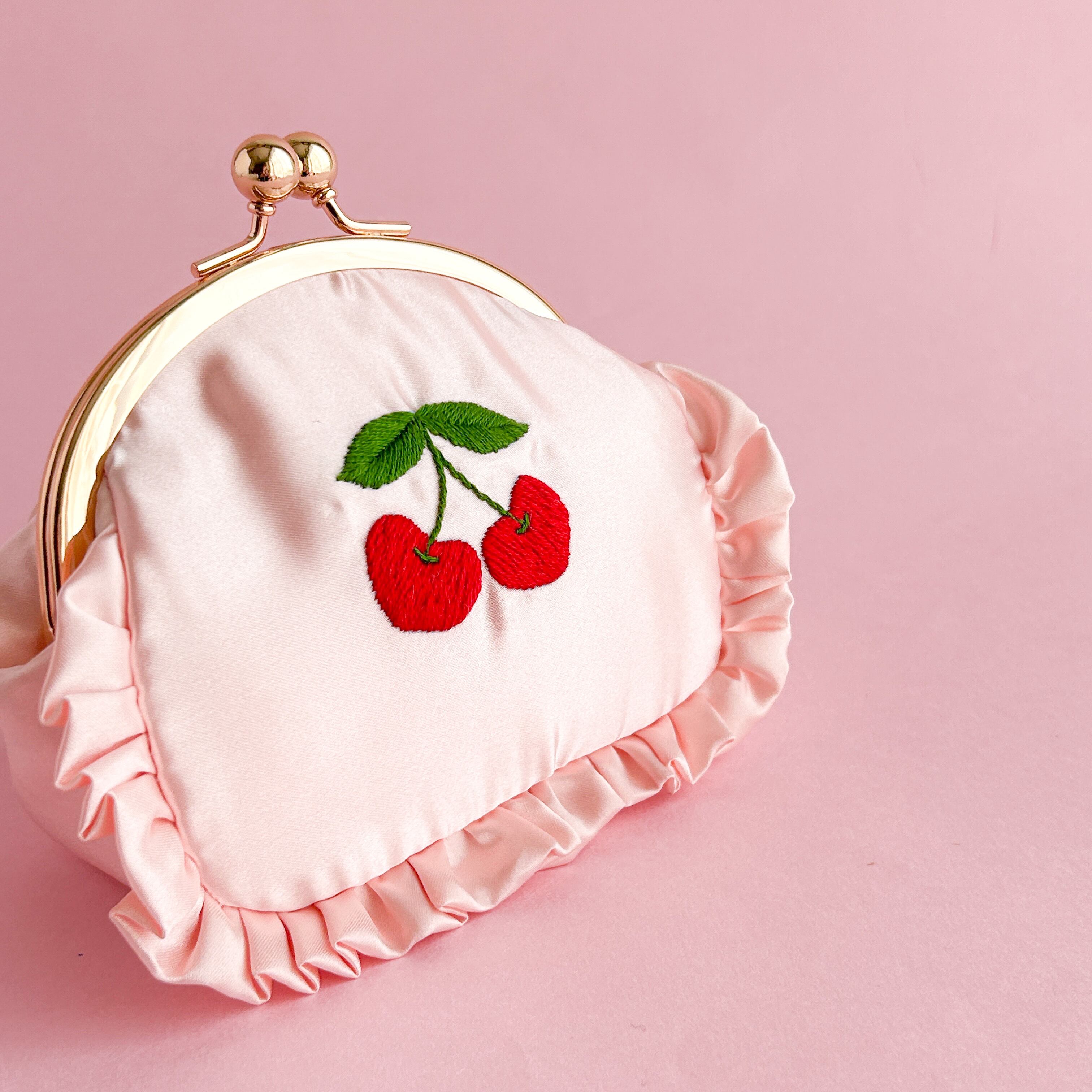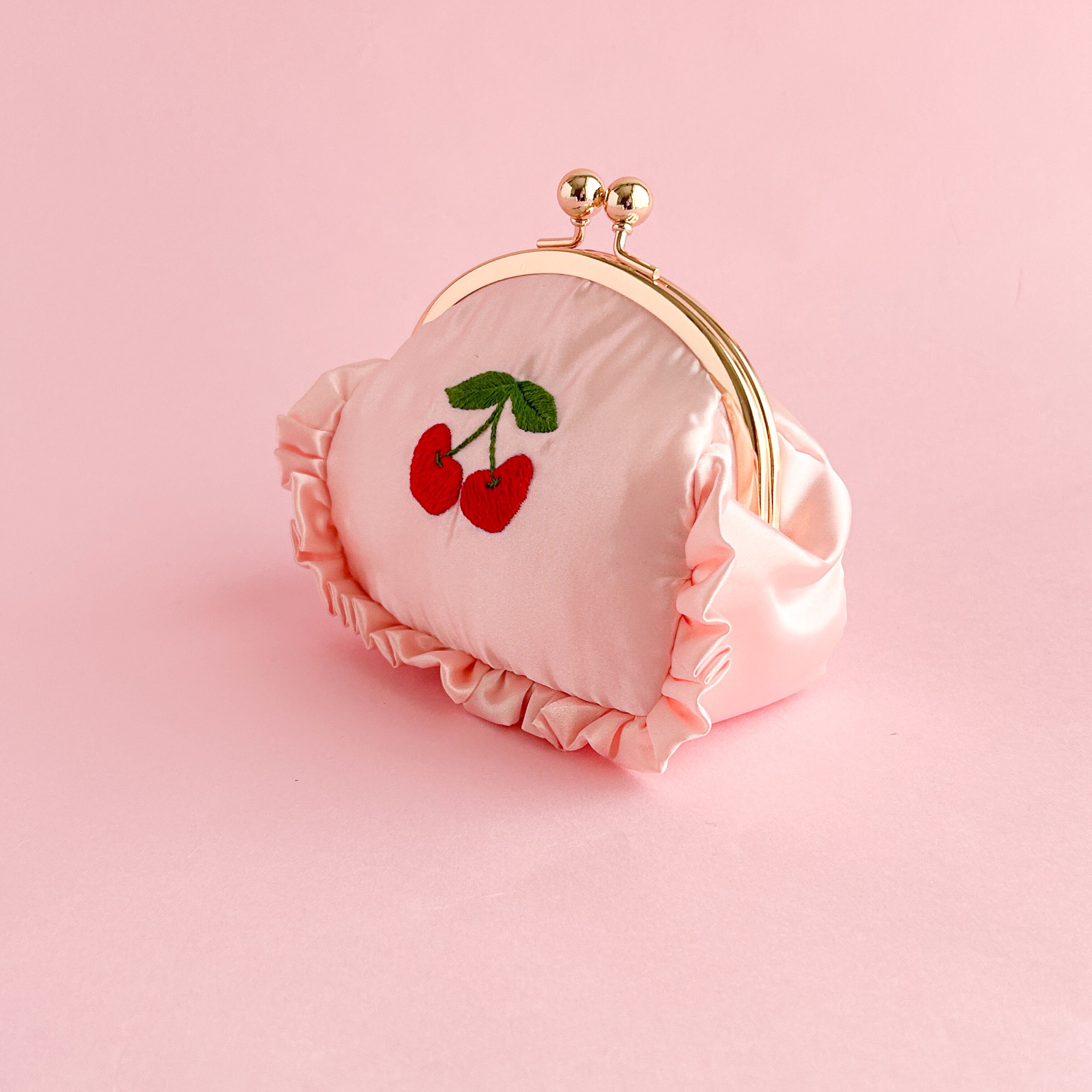 がま口ポーチ(L)(シェルピンク/ハートチェリー刺繍)