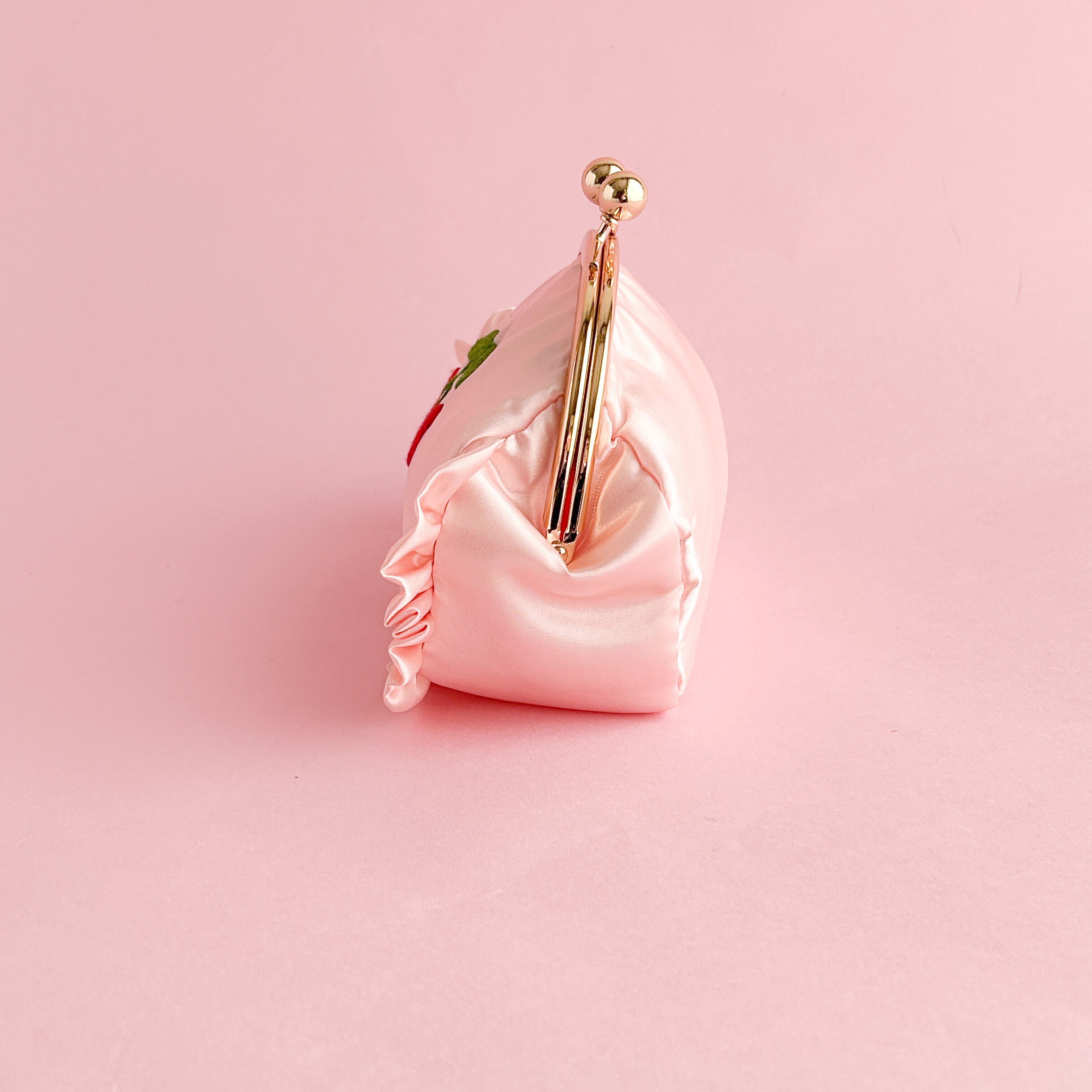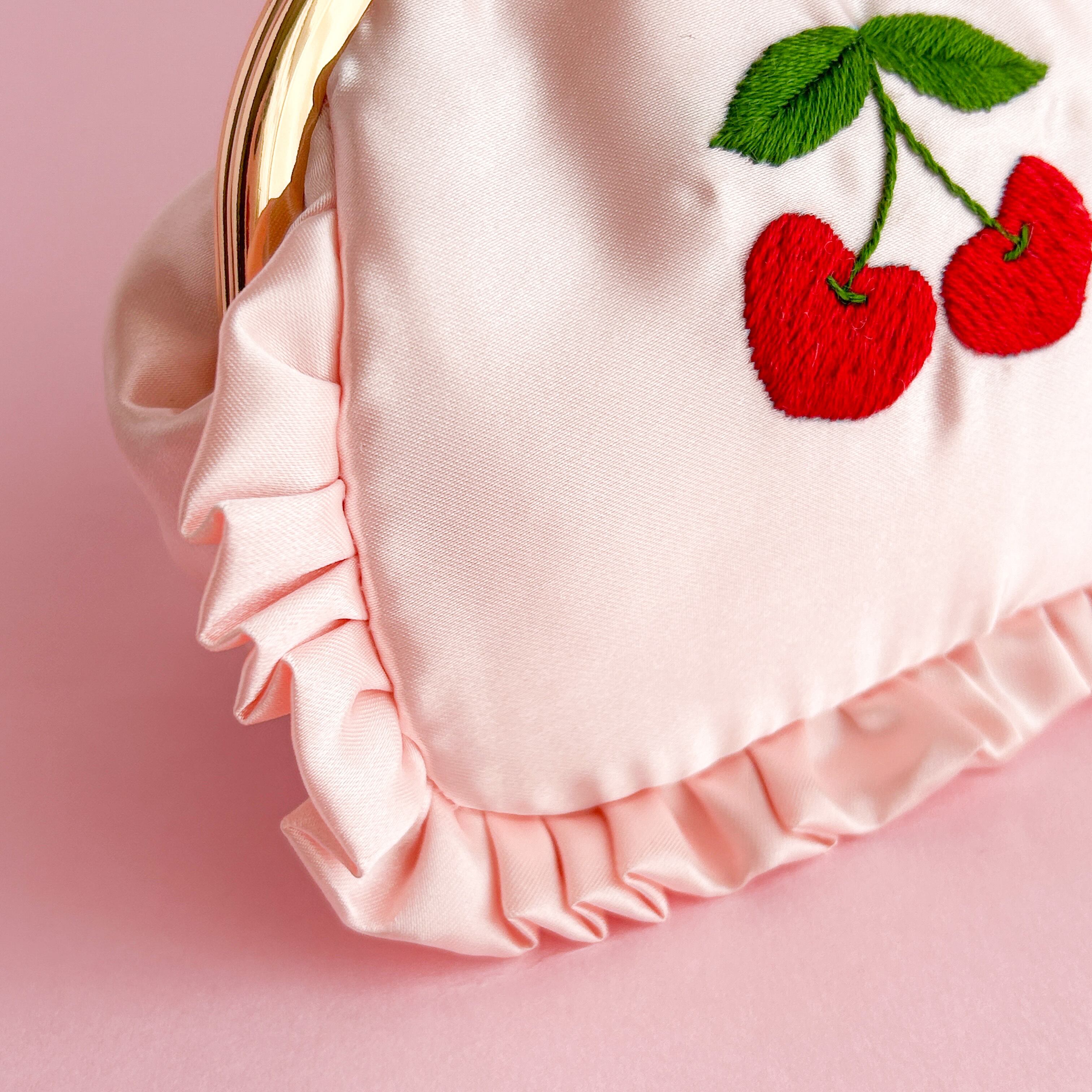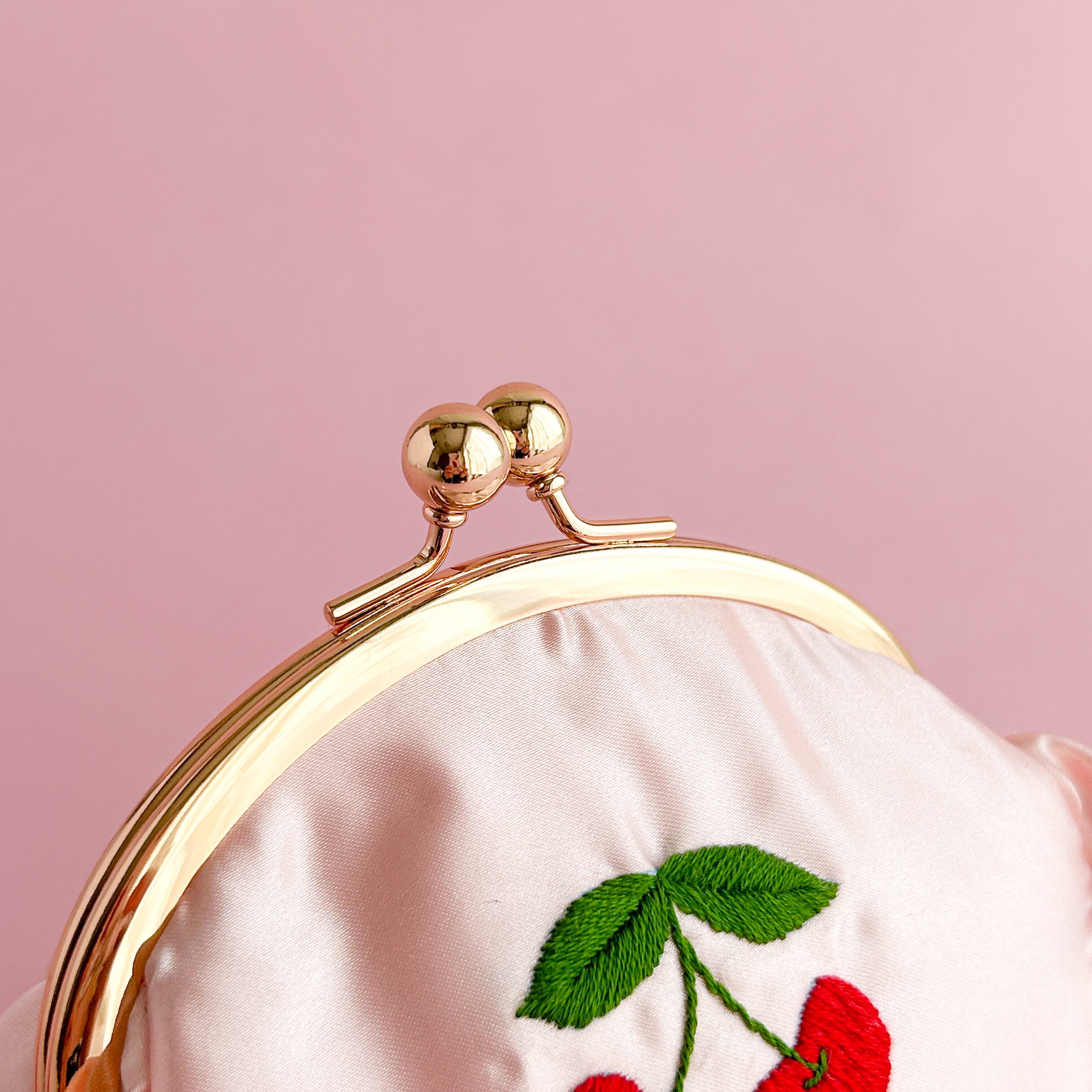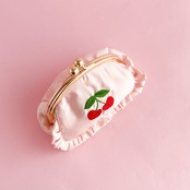 がま口ポーチ(L)(シェルピンク/ハートチェリー刺繍)