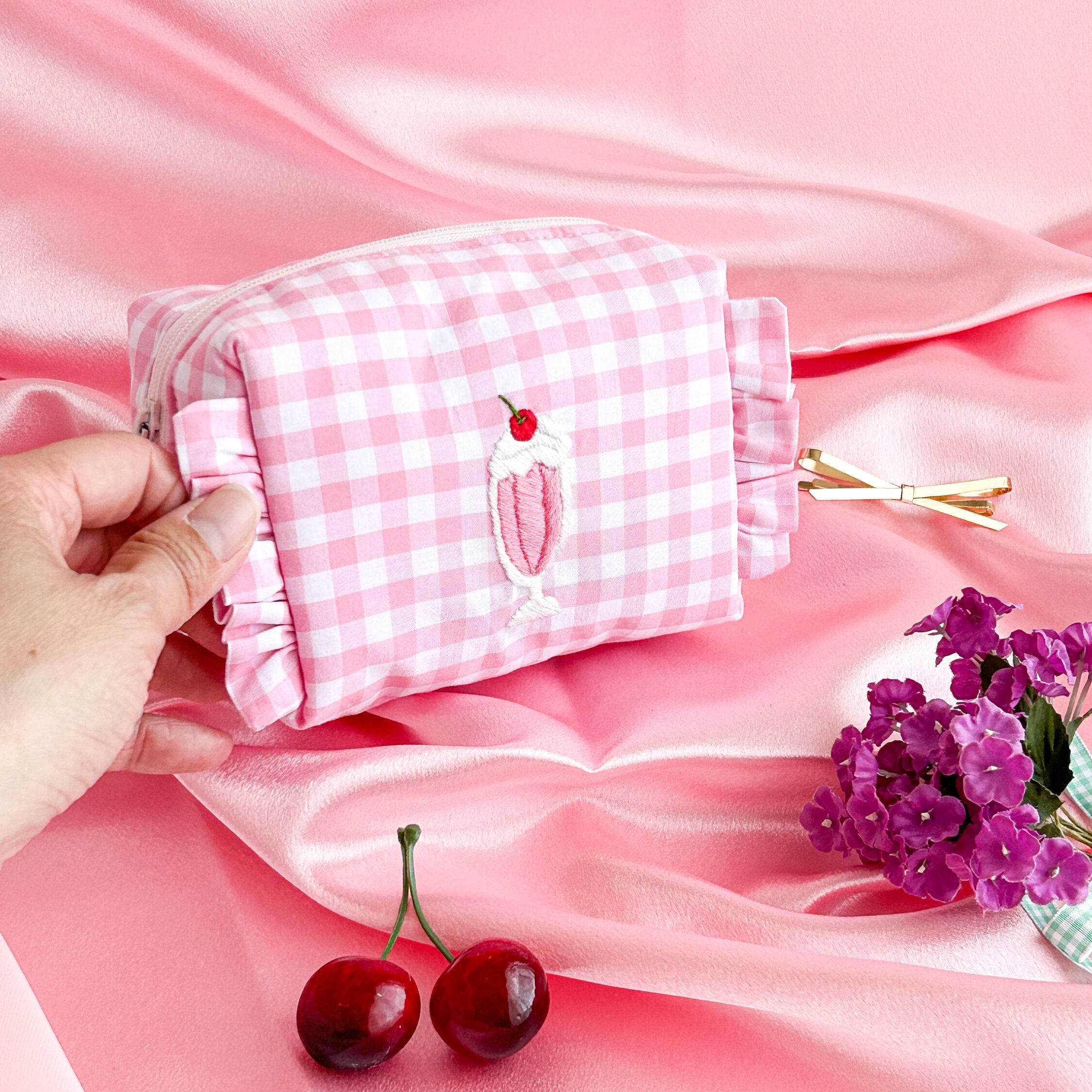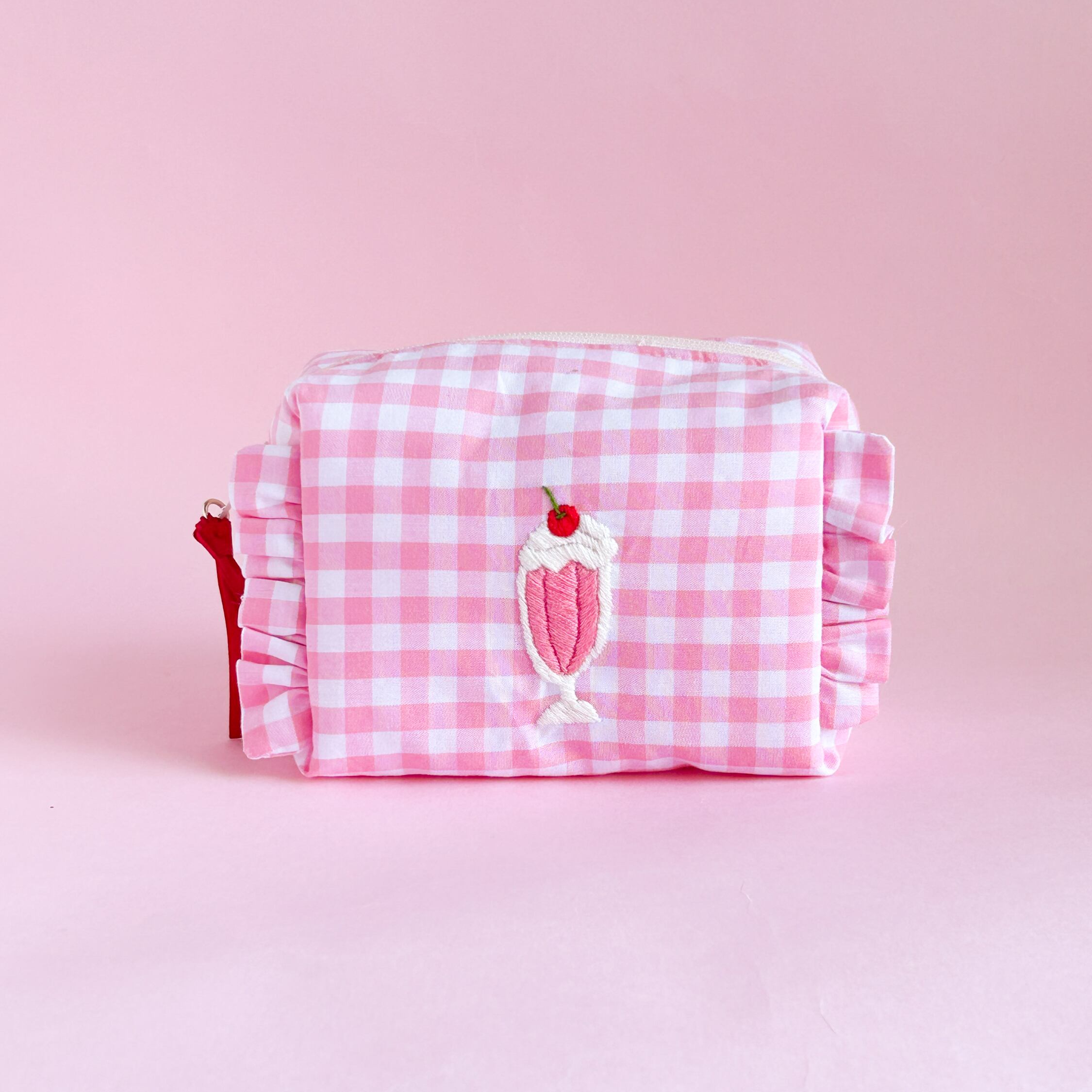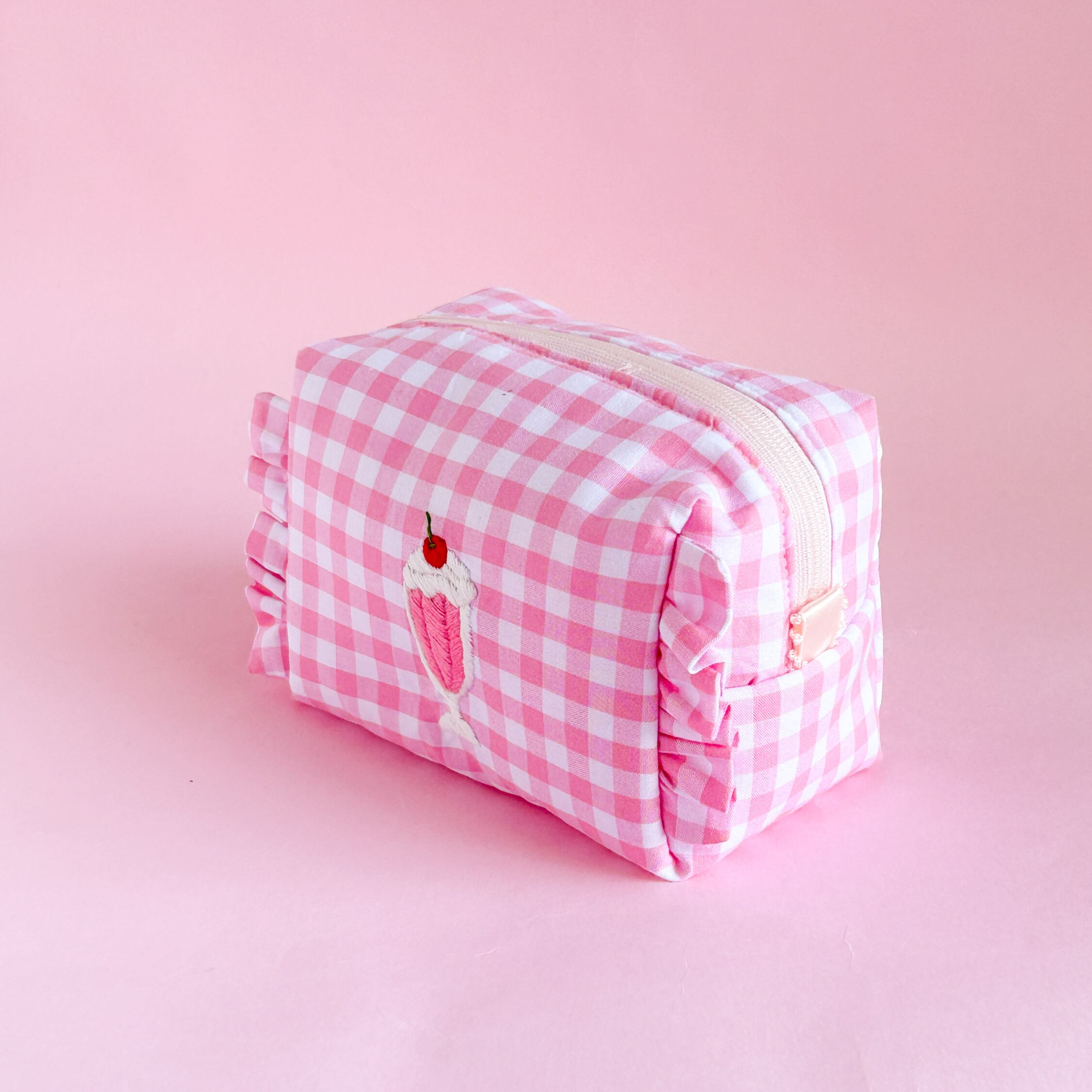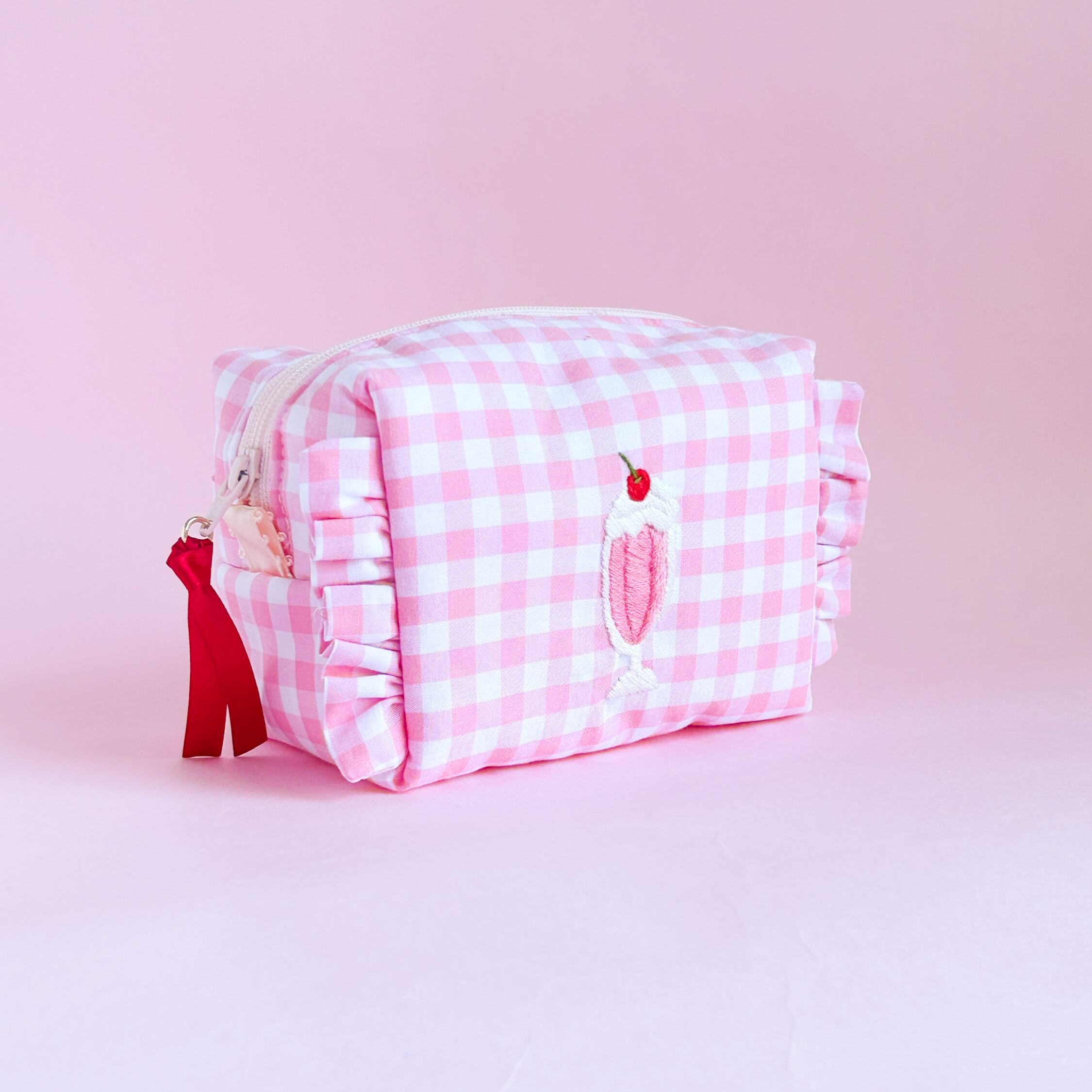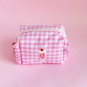 ボックスポーチ(ピンクギンガム/イチゴミルクシェイク刺繍)minetteハンドメイド