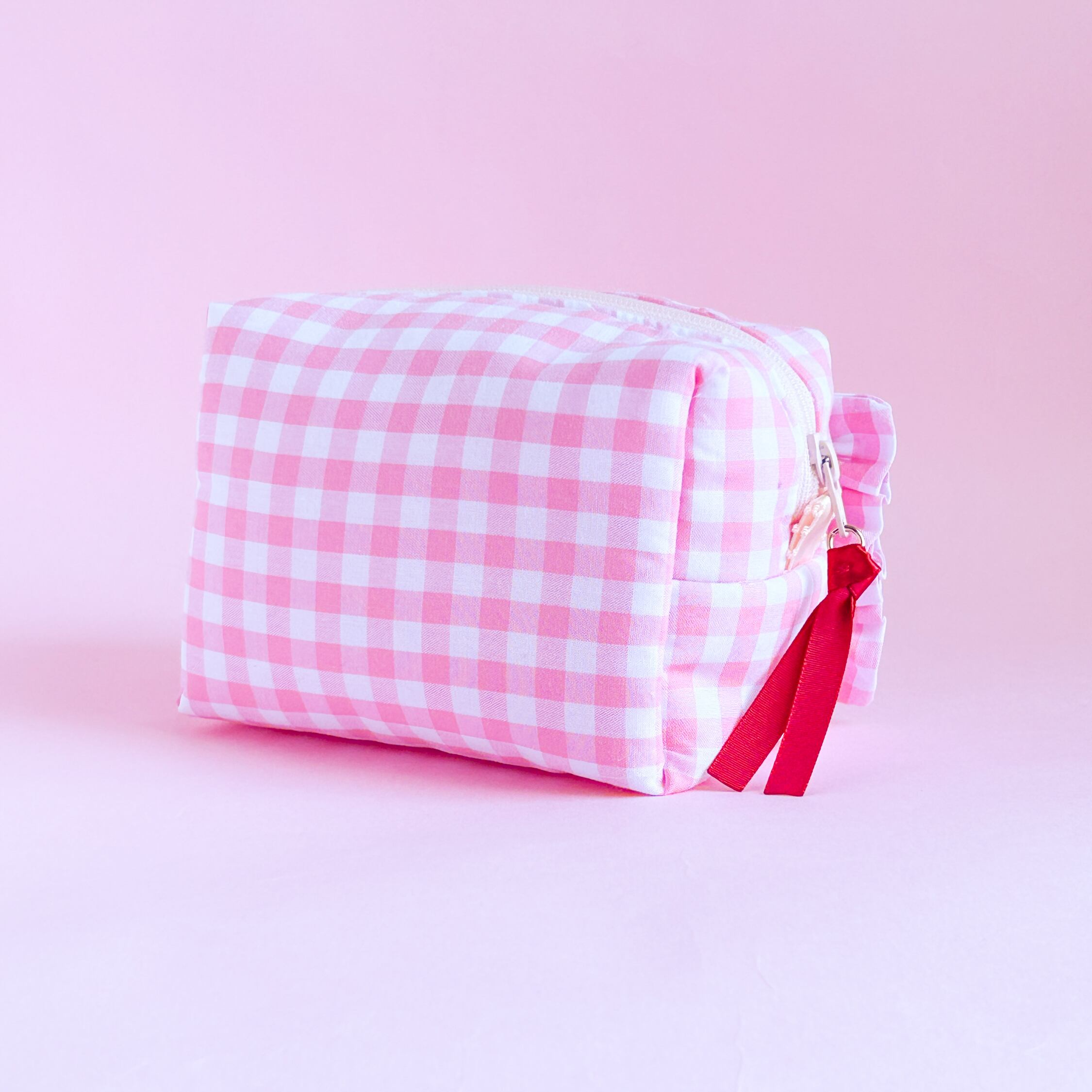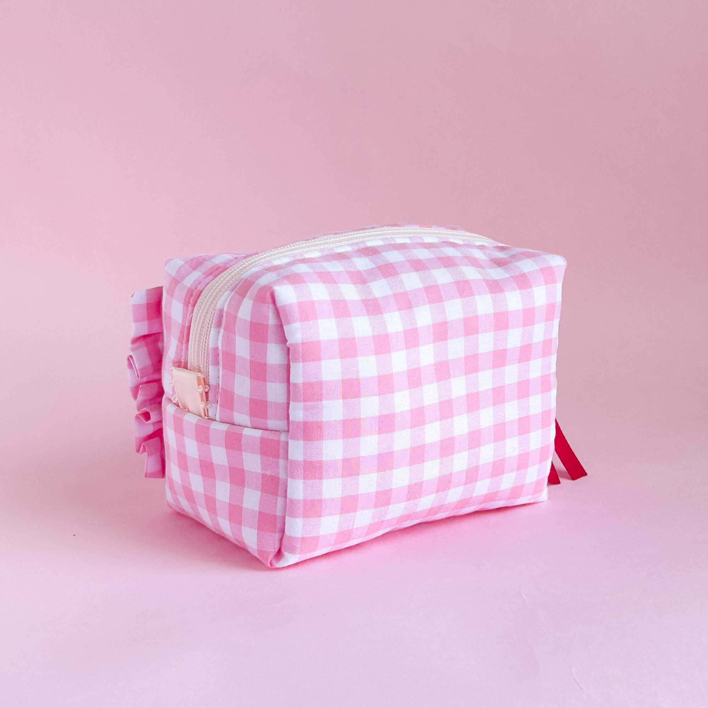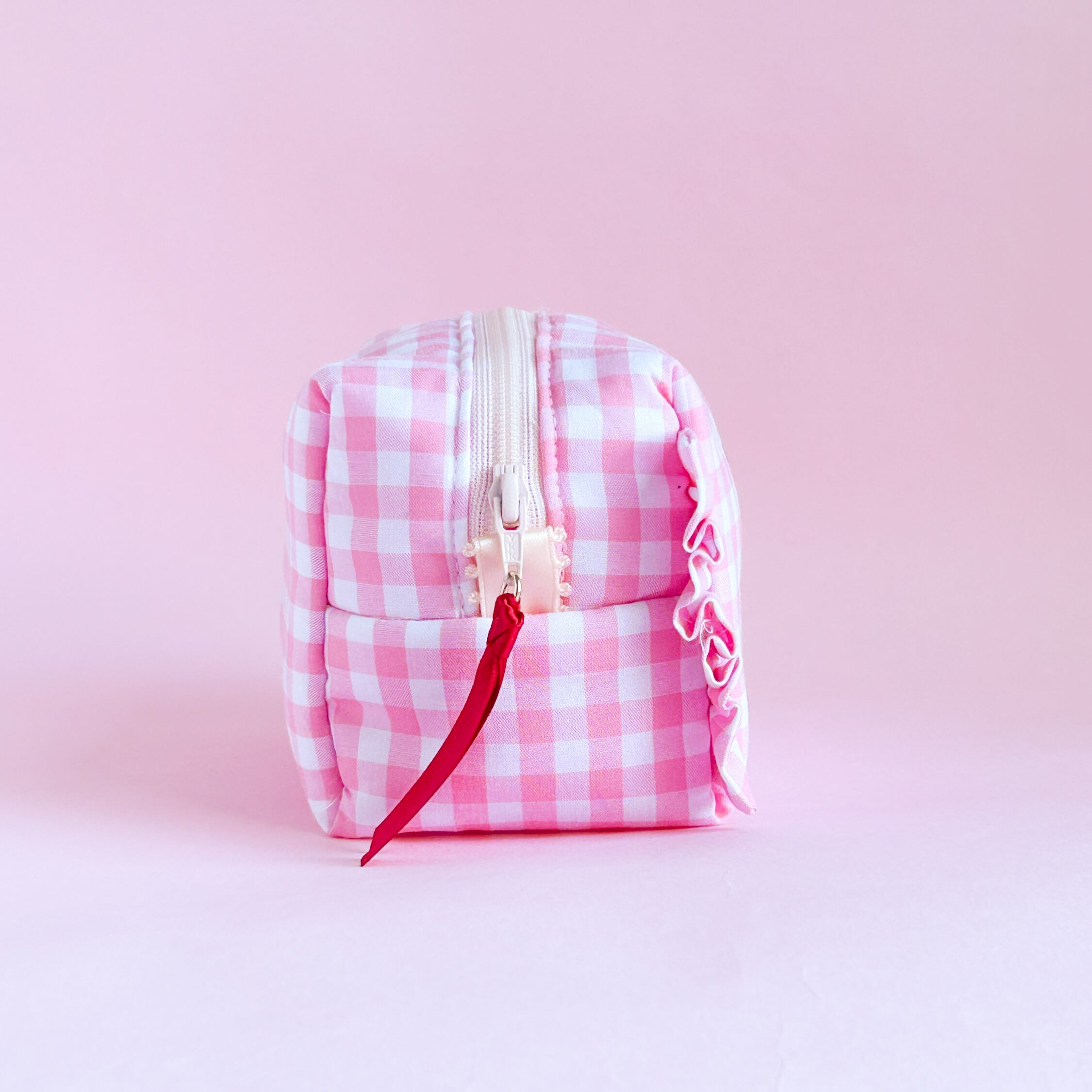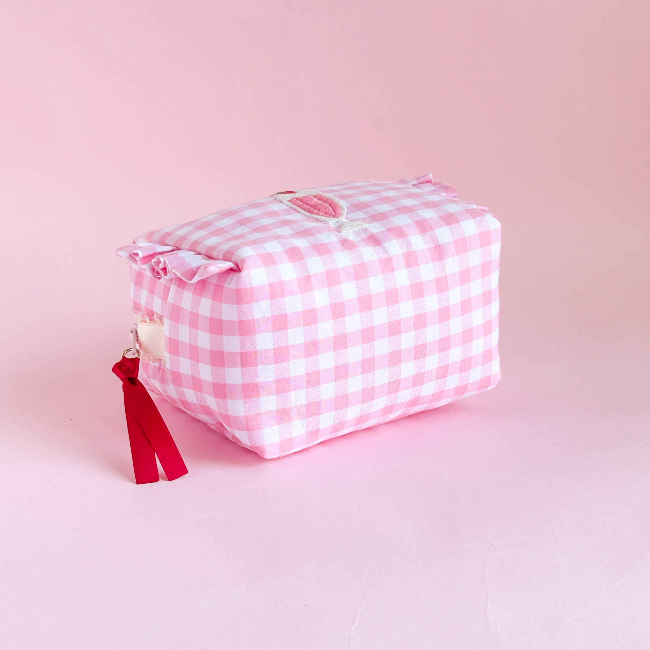 ボックスポーチ(ピンクギンガム/イチゴミルクシェイク刺繍)minetteハンドメイド