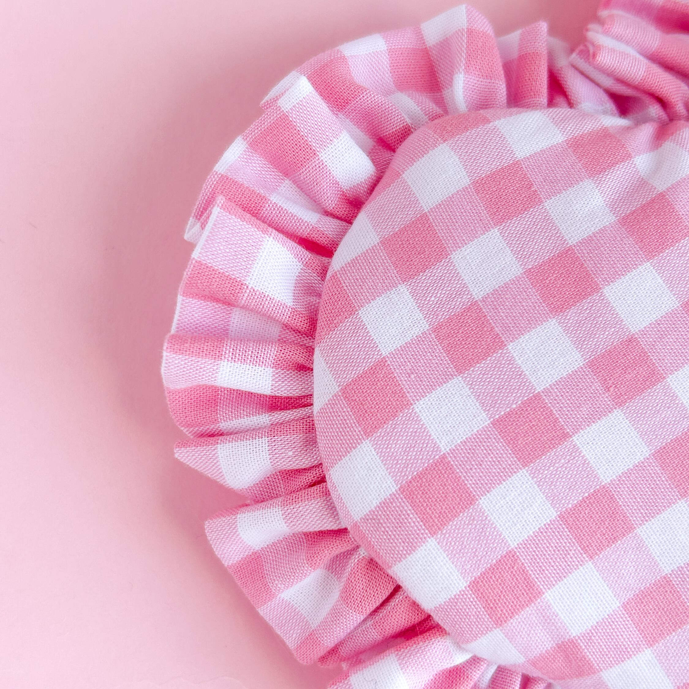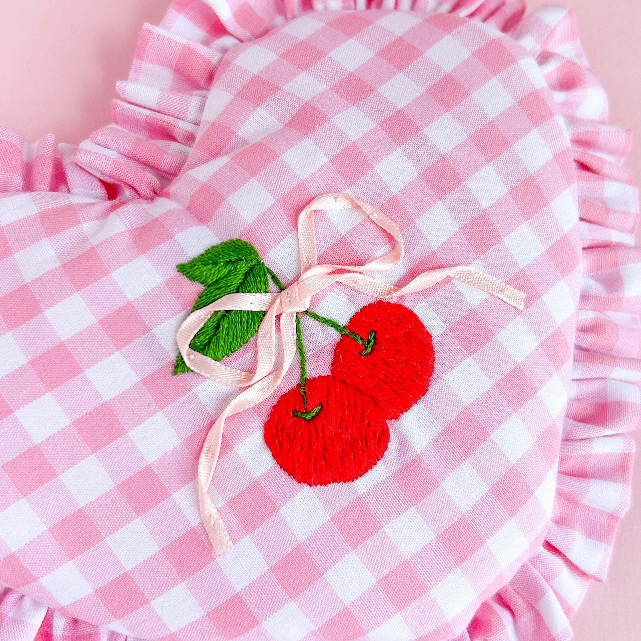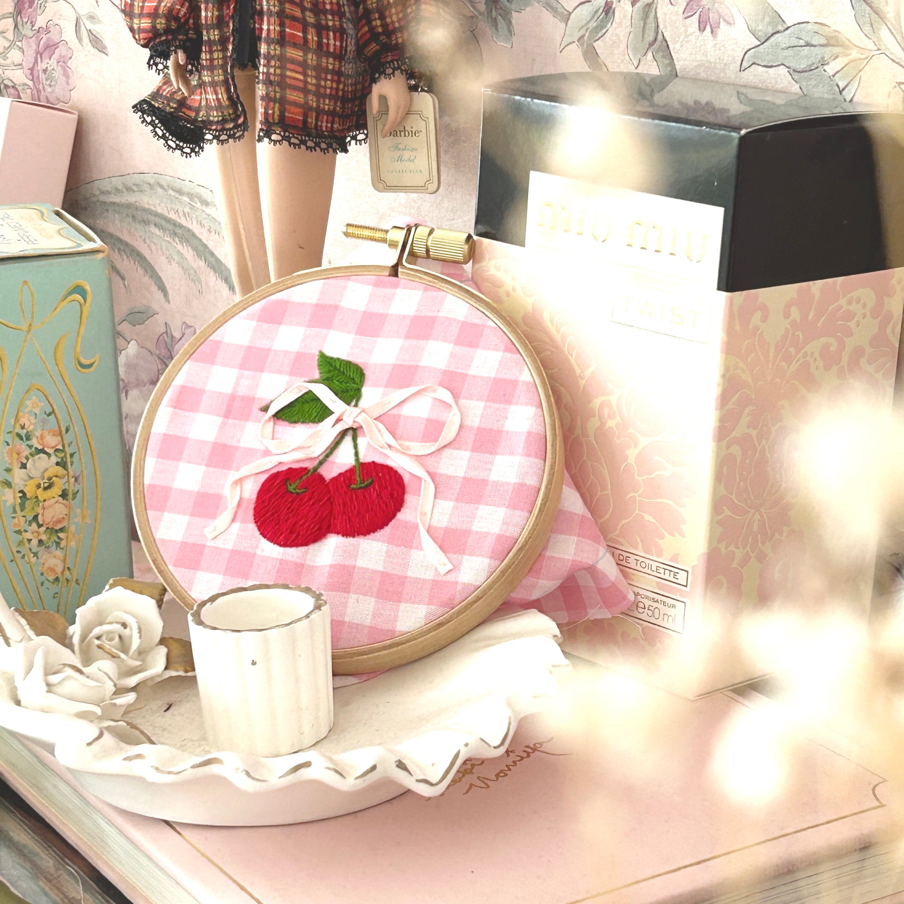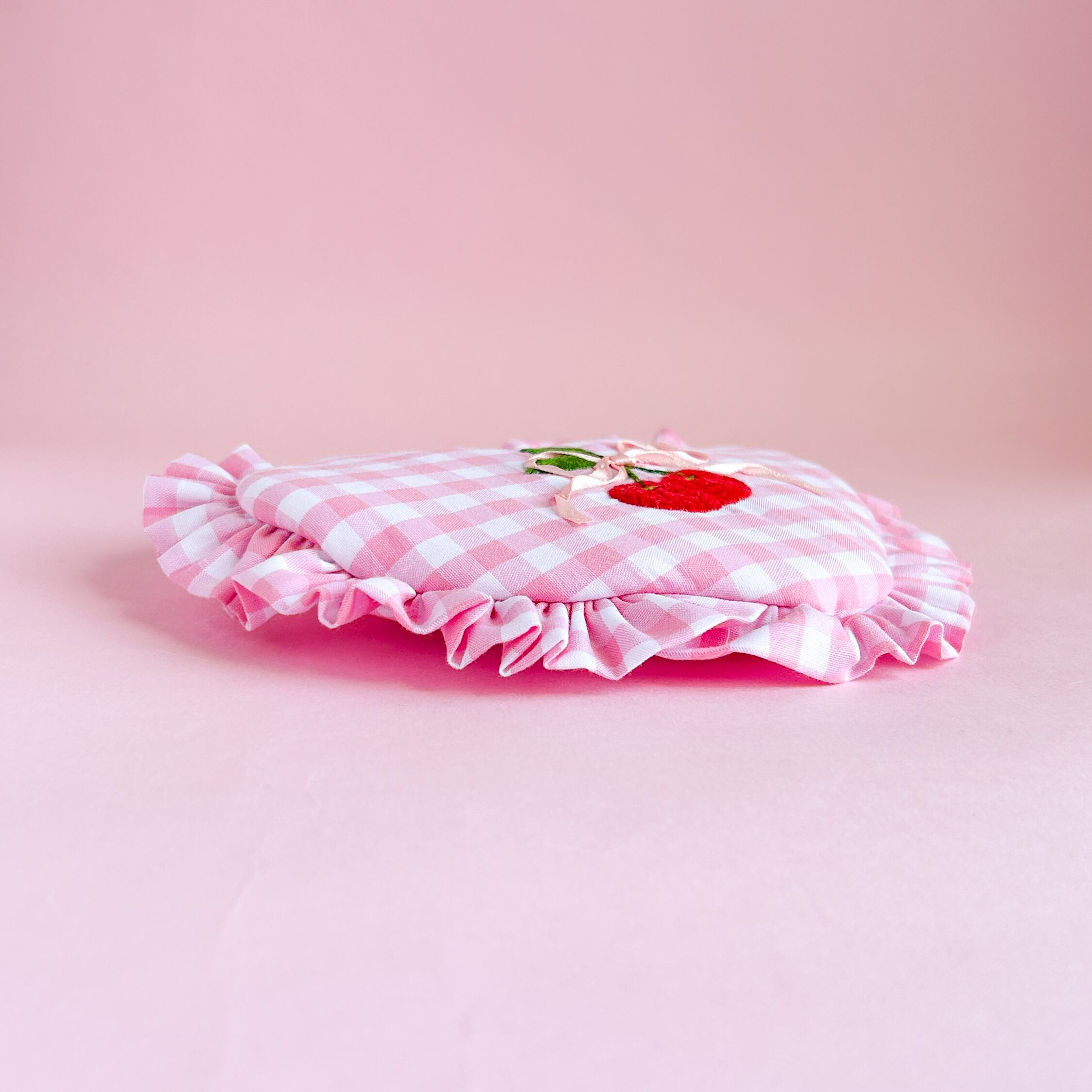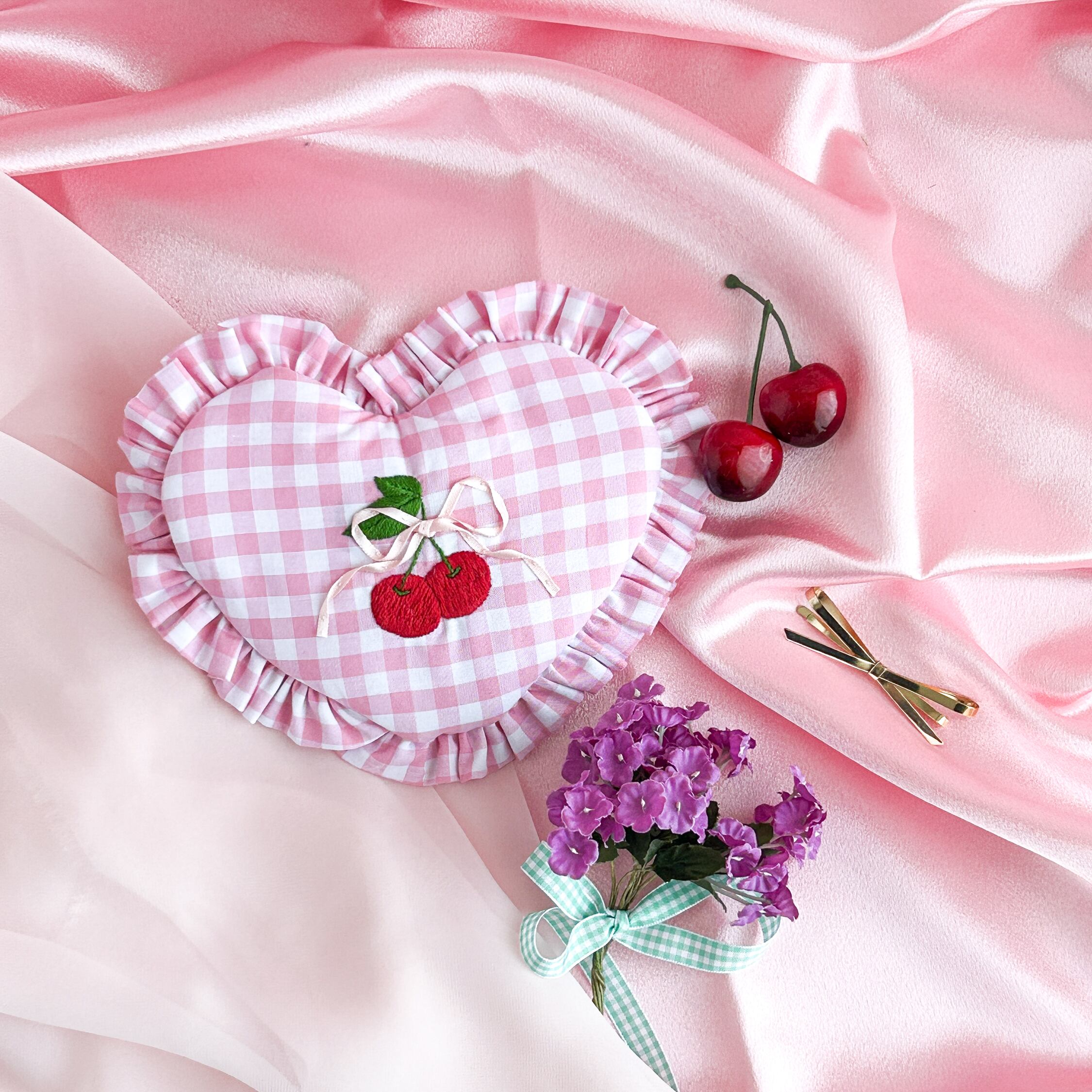 ハートぺたんこポーチ(ピンクギンガム/リボンチェリー刺繍)minette刺繍ハンドメイド