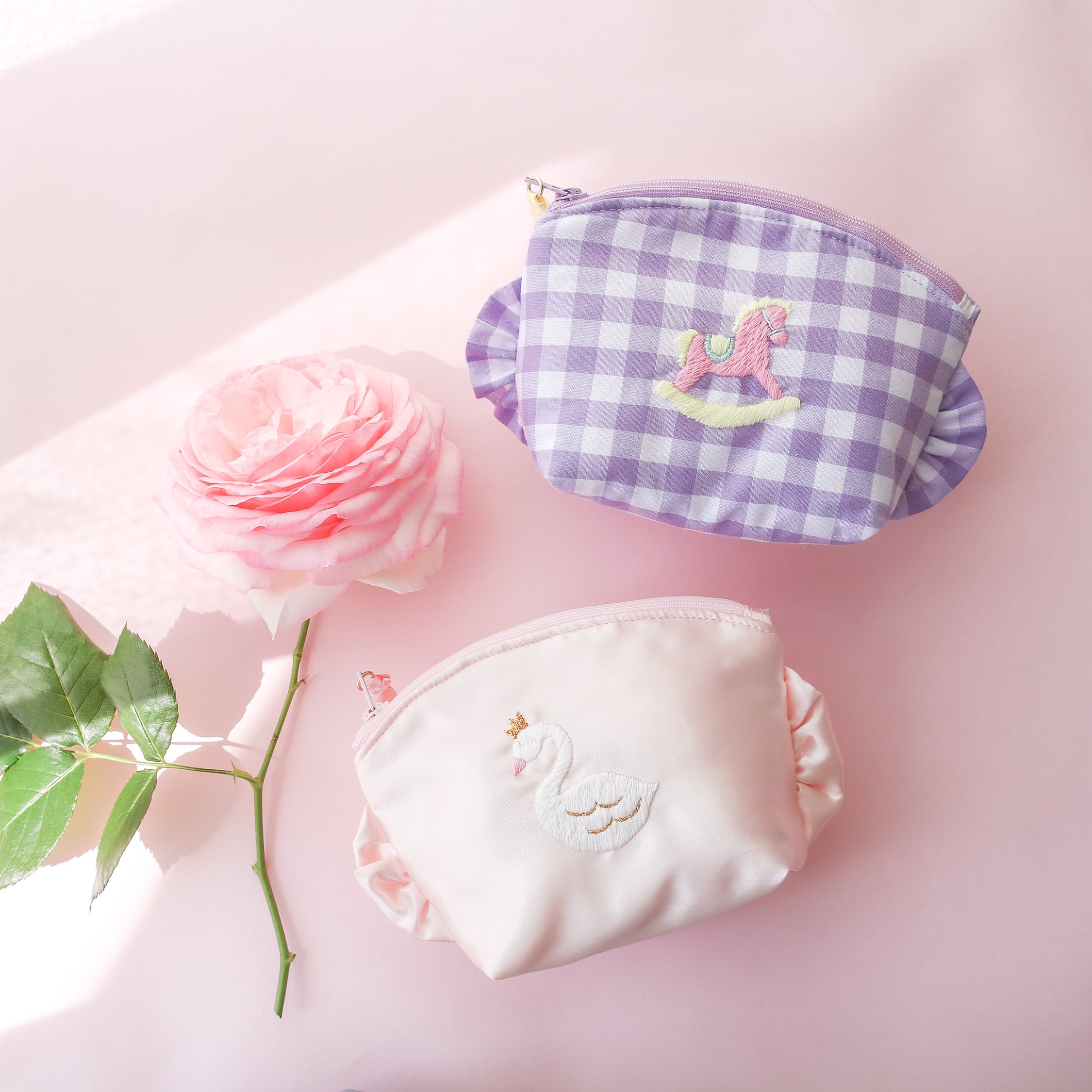 トップラウンドポーチ(シェルピンク/スワン刺繍)ミネット手作りポーチ