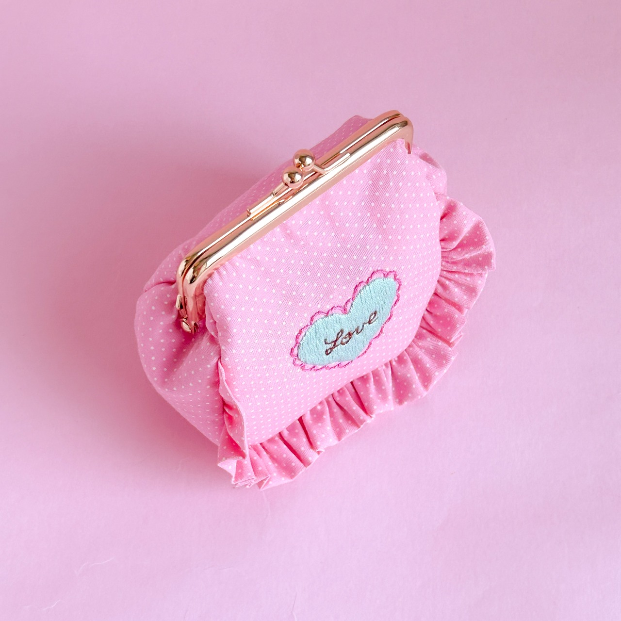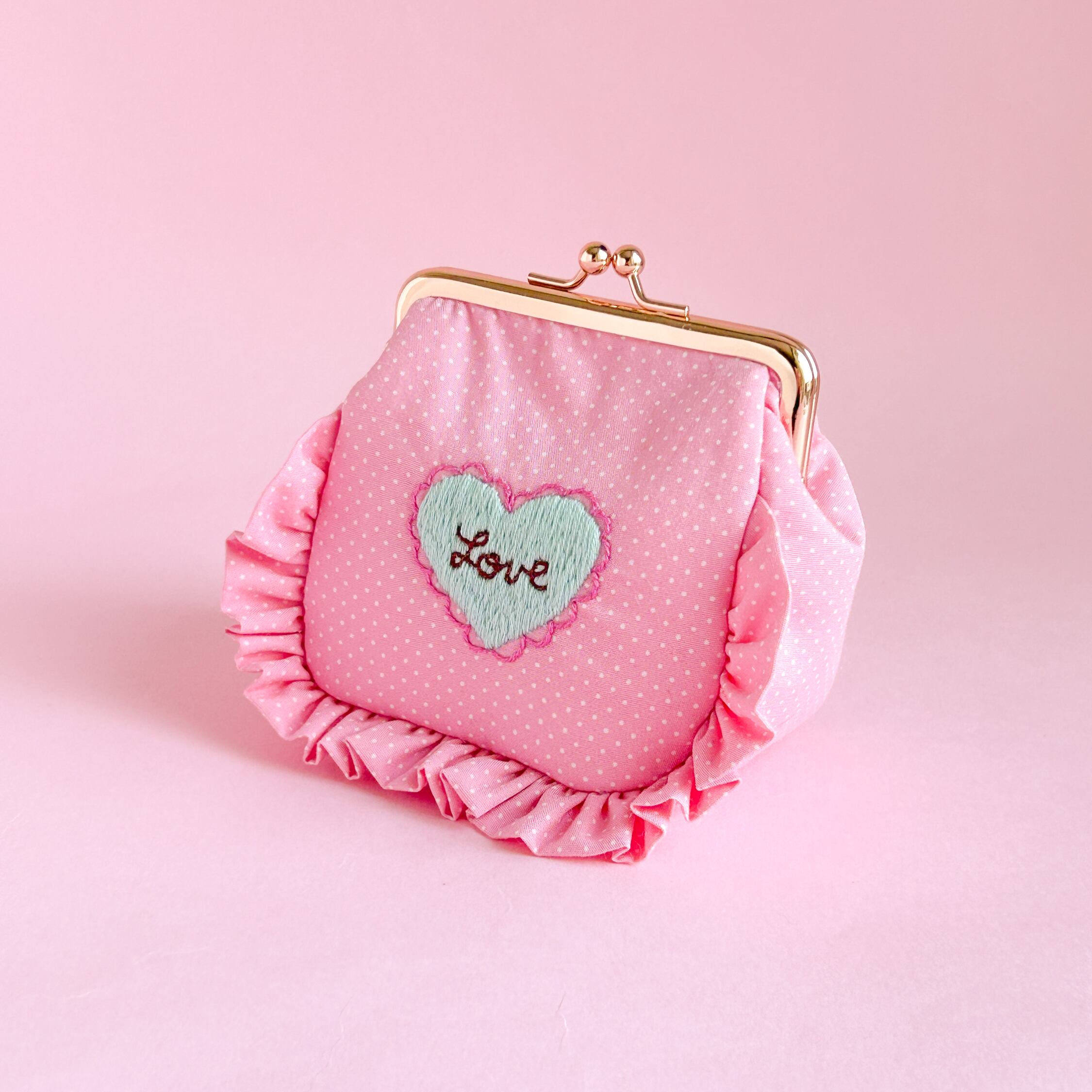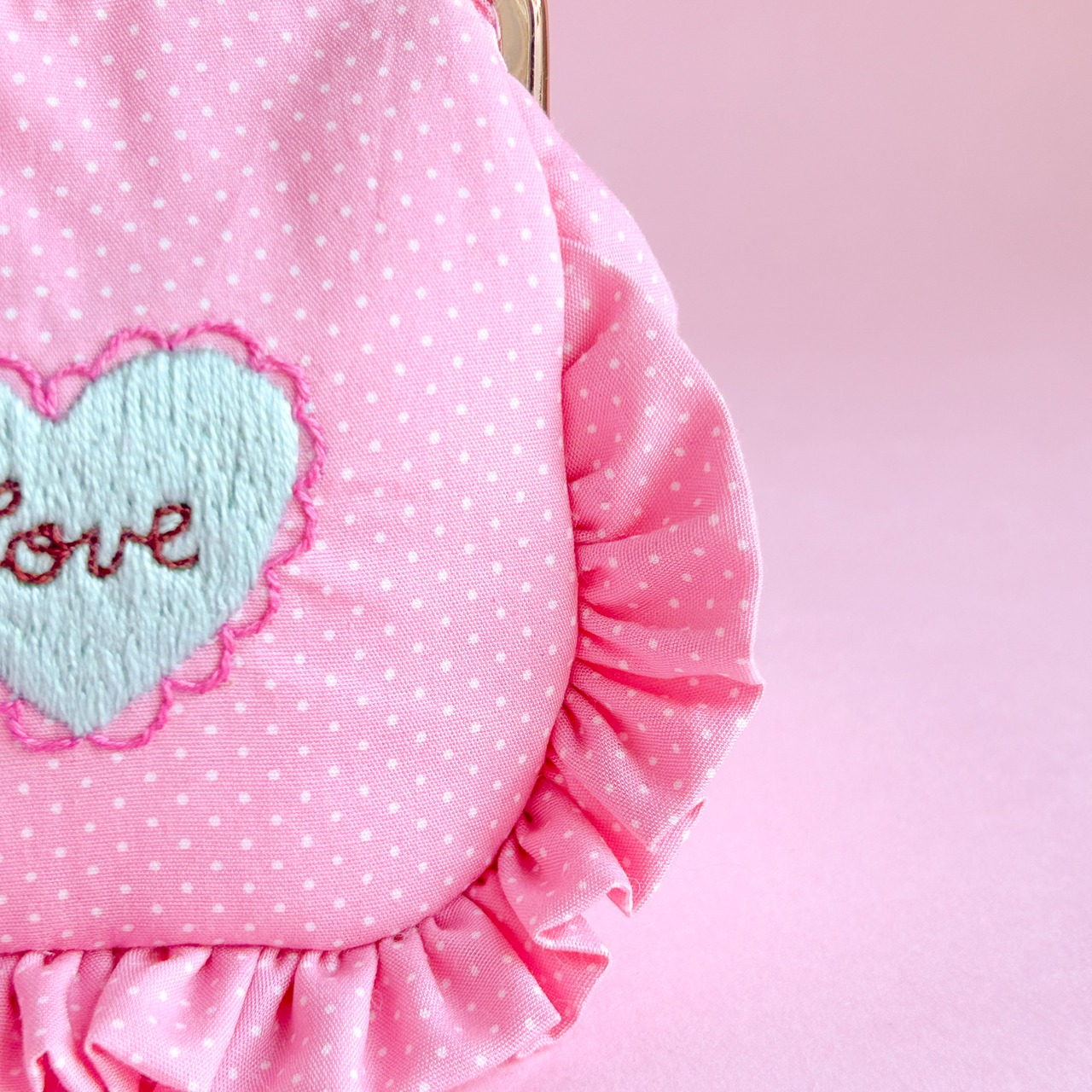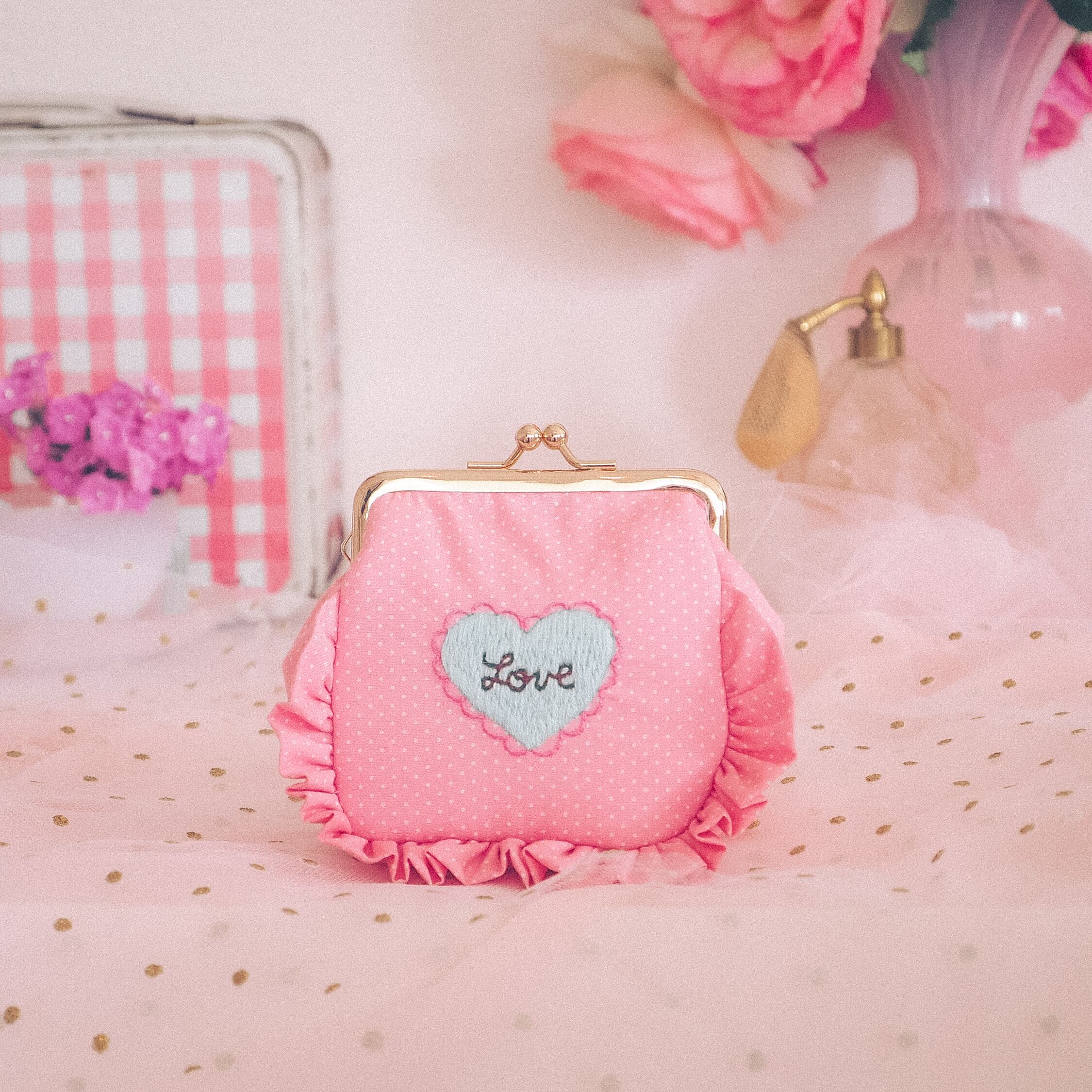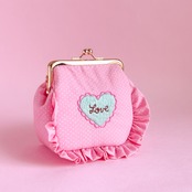 角がま口ポーチマチ付(ピンクドット/LOVEハート刺繍)ミネット
