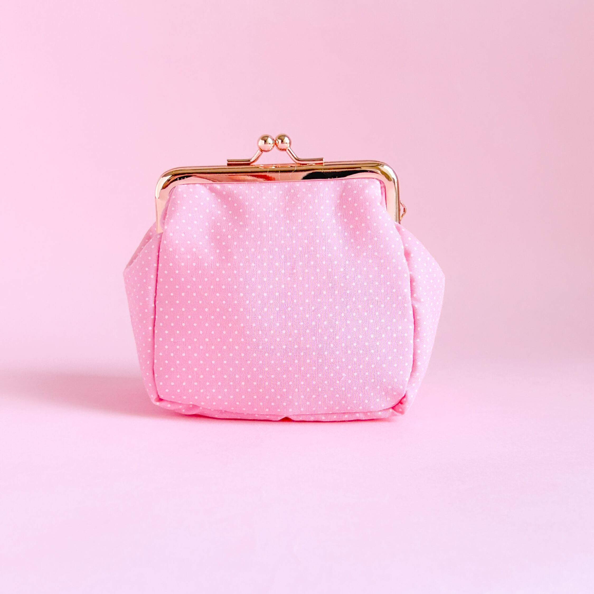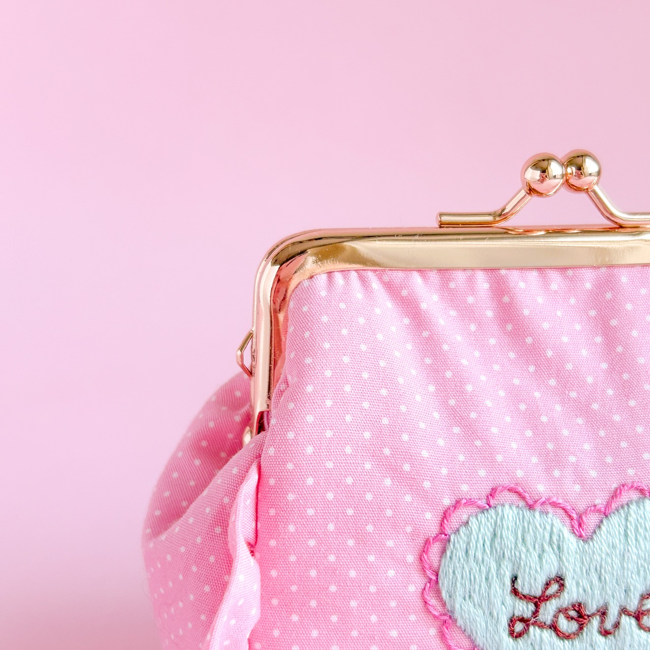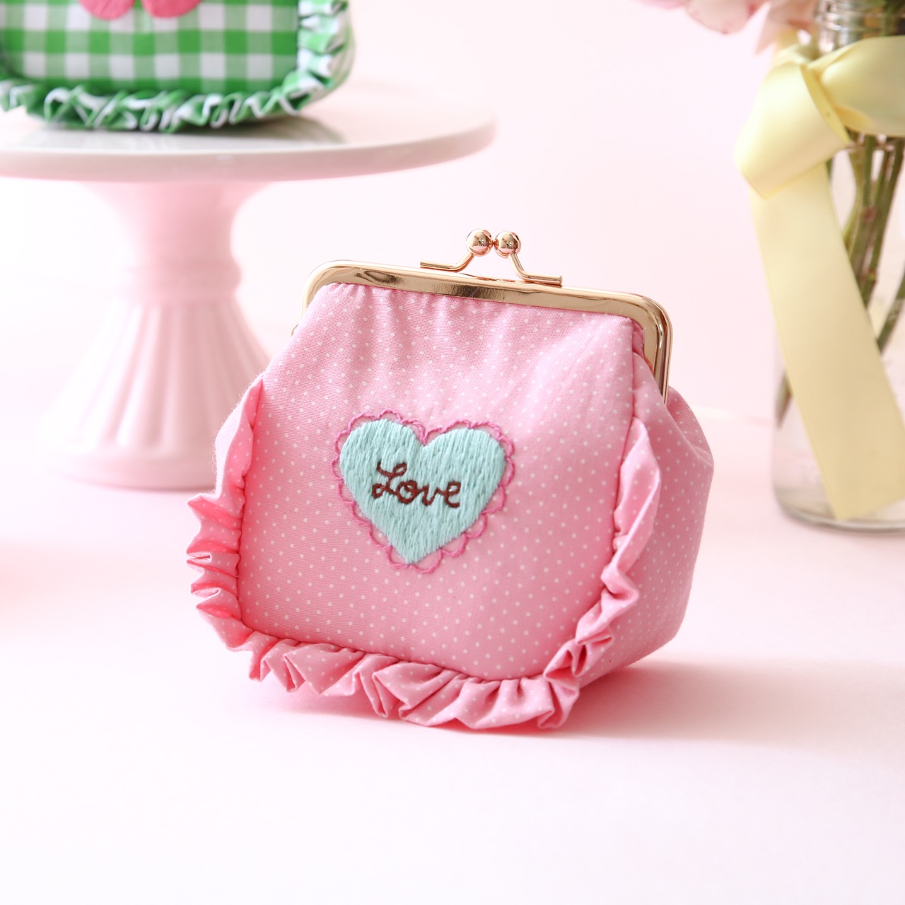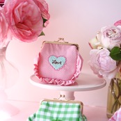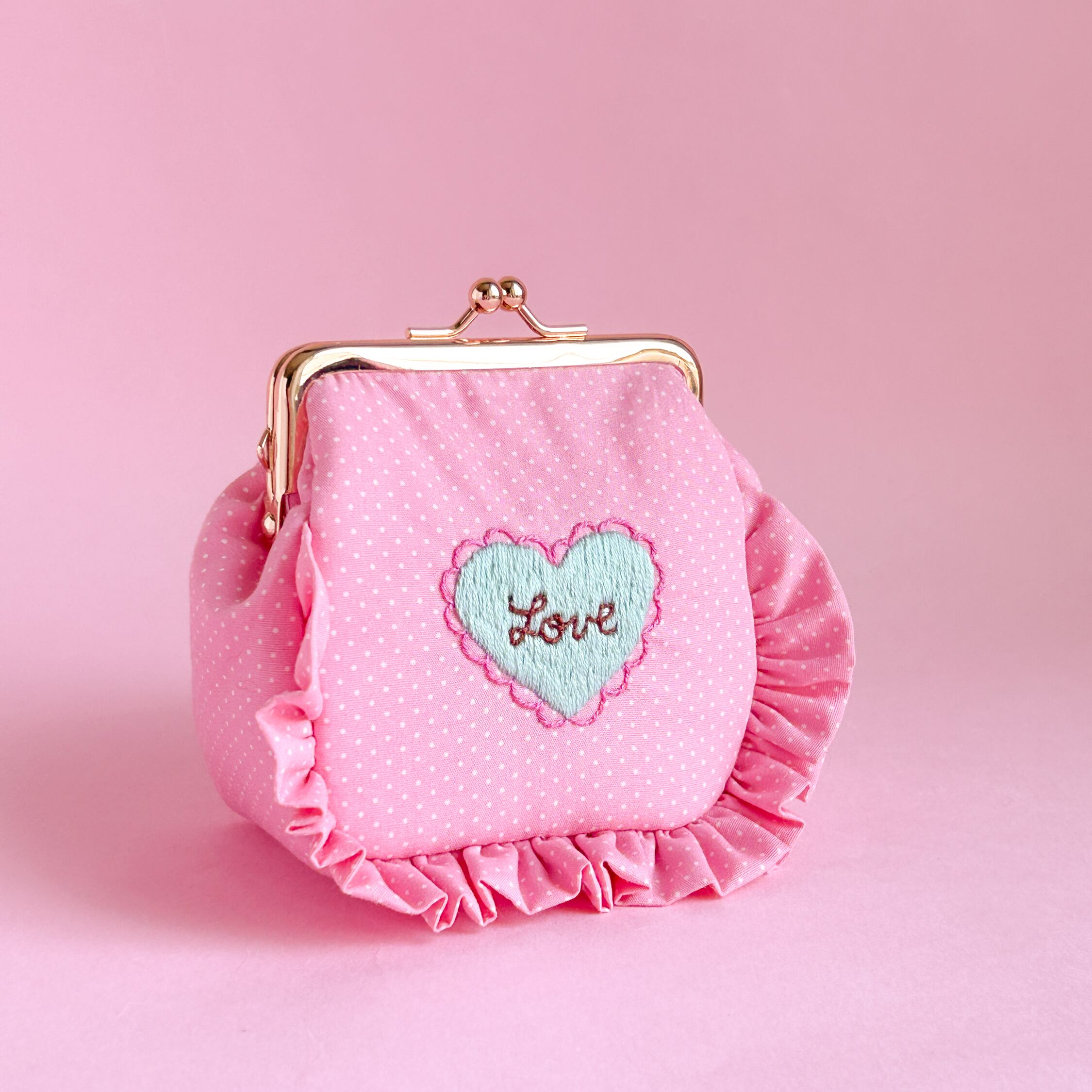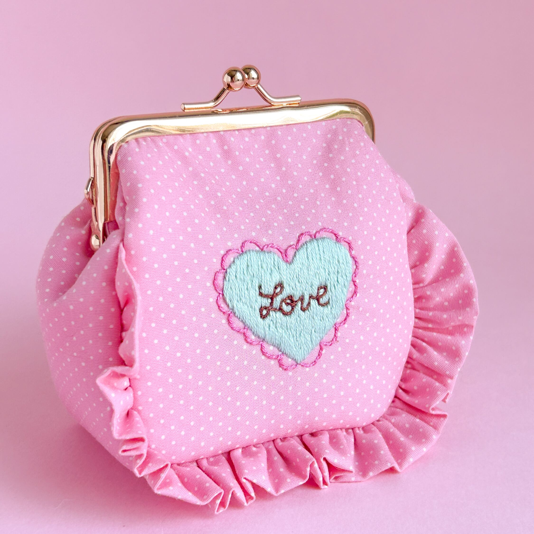 角がま口ポーチマチ付(ピンクドット/LOVEハート刺繍)ミネット