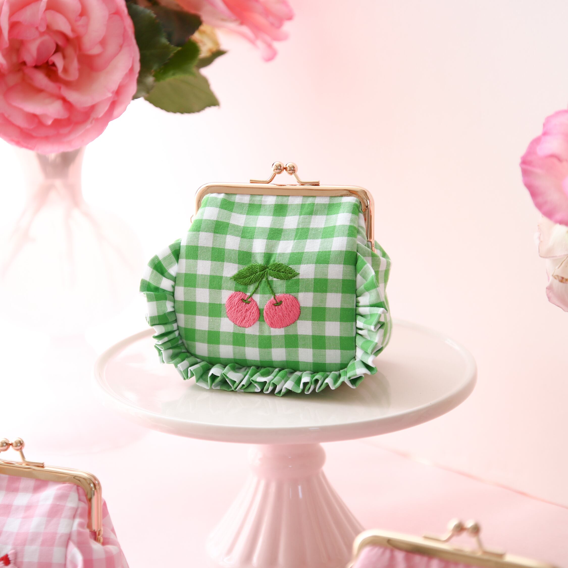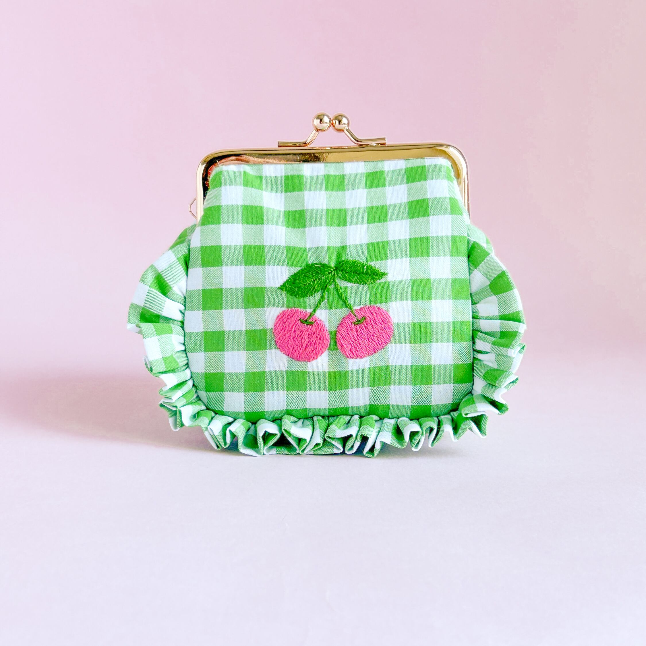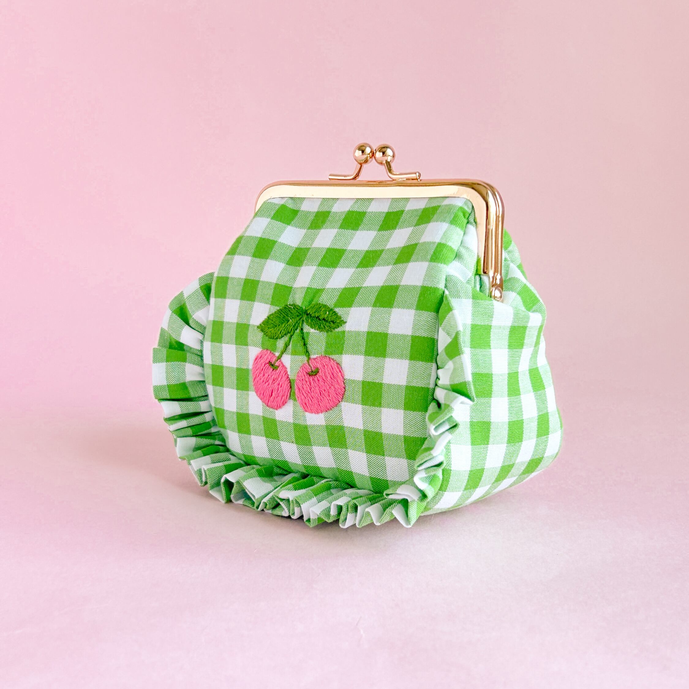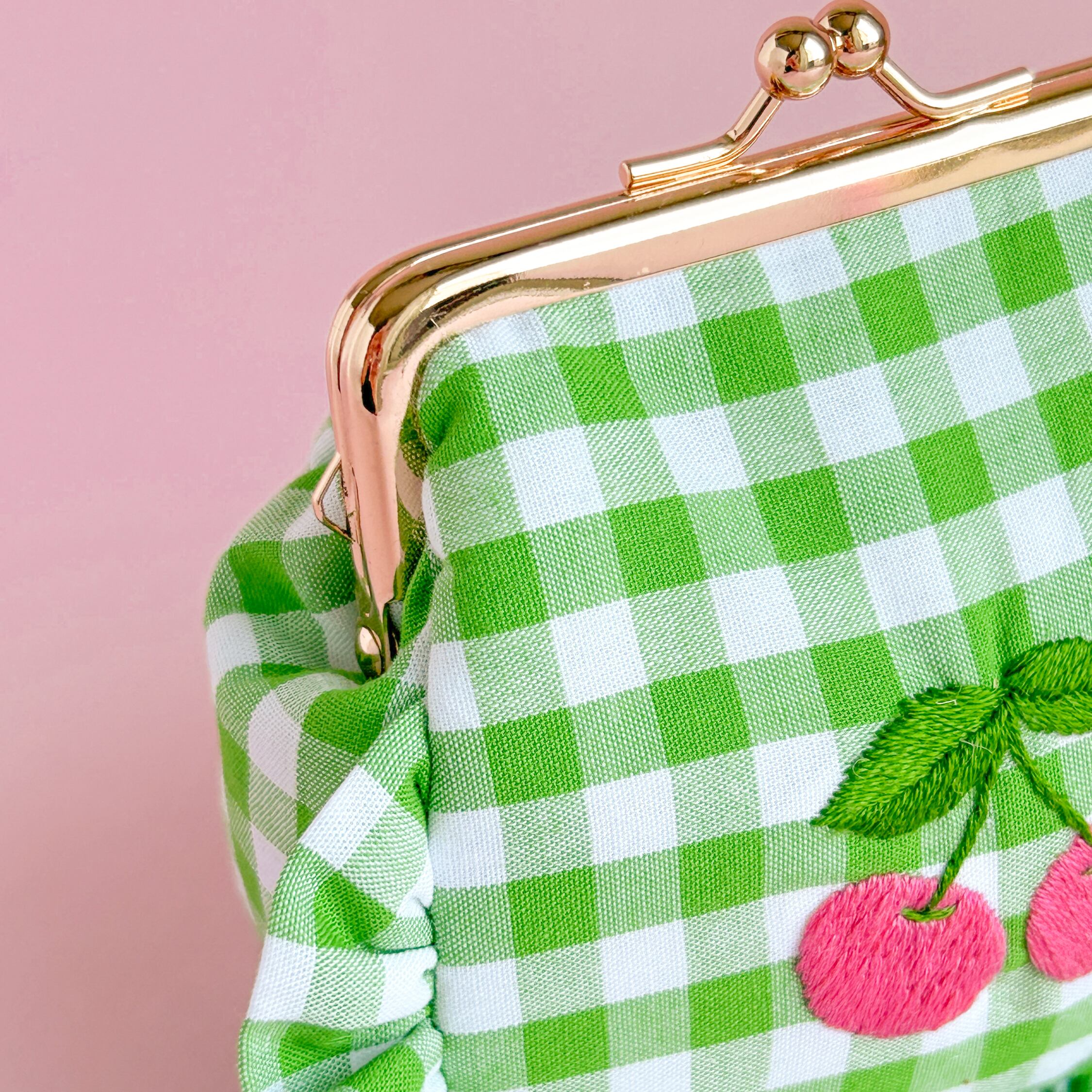 角がま口ポーチマチ付(グリーンギンガム/ピンクチェリー刺繍)ミネット