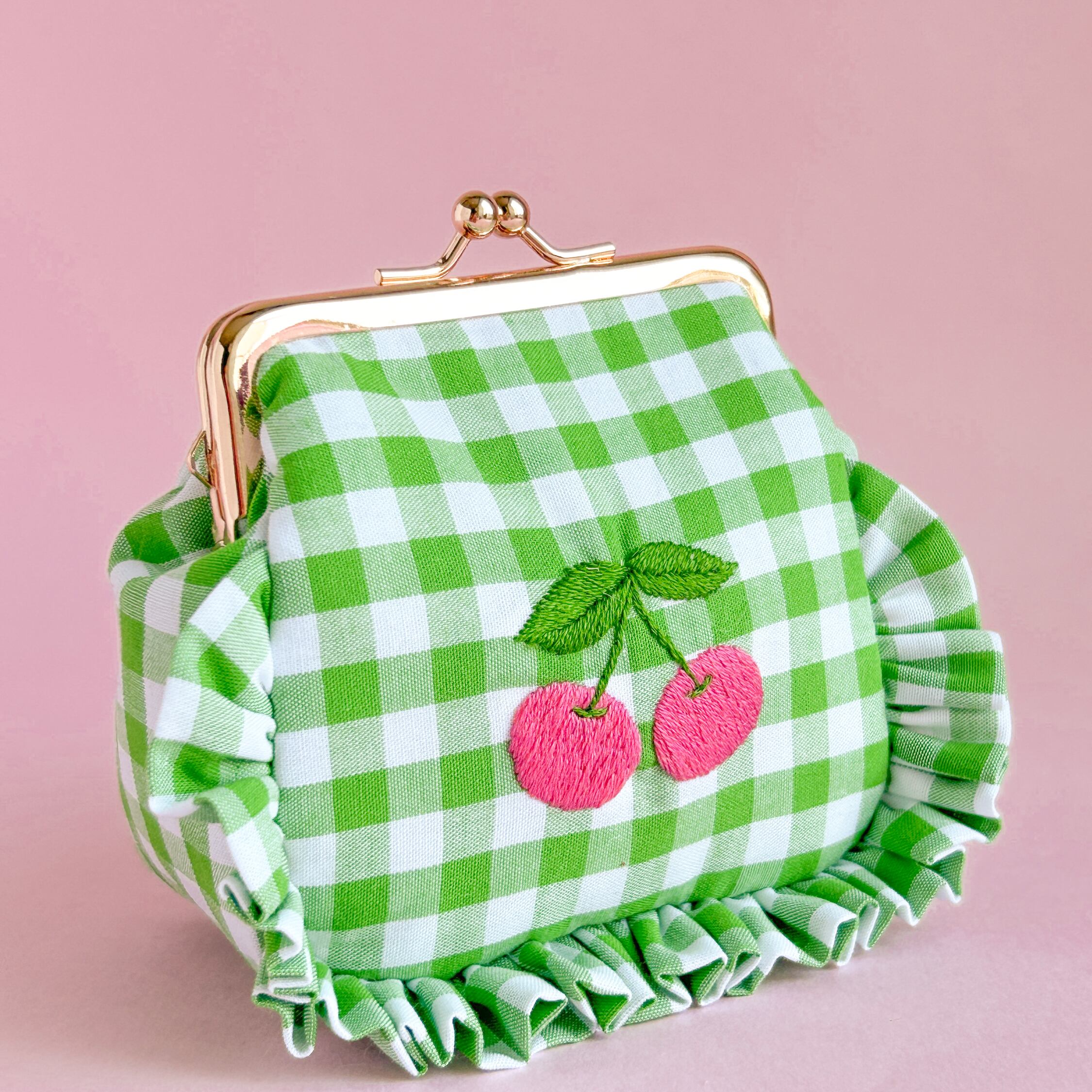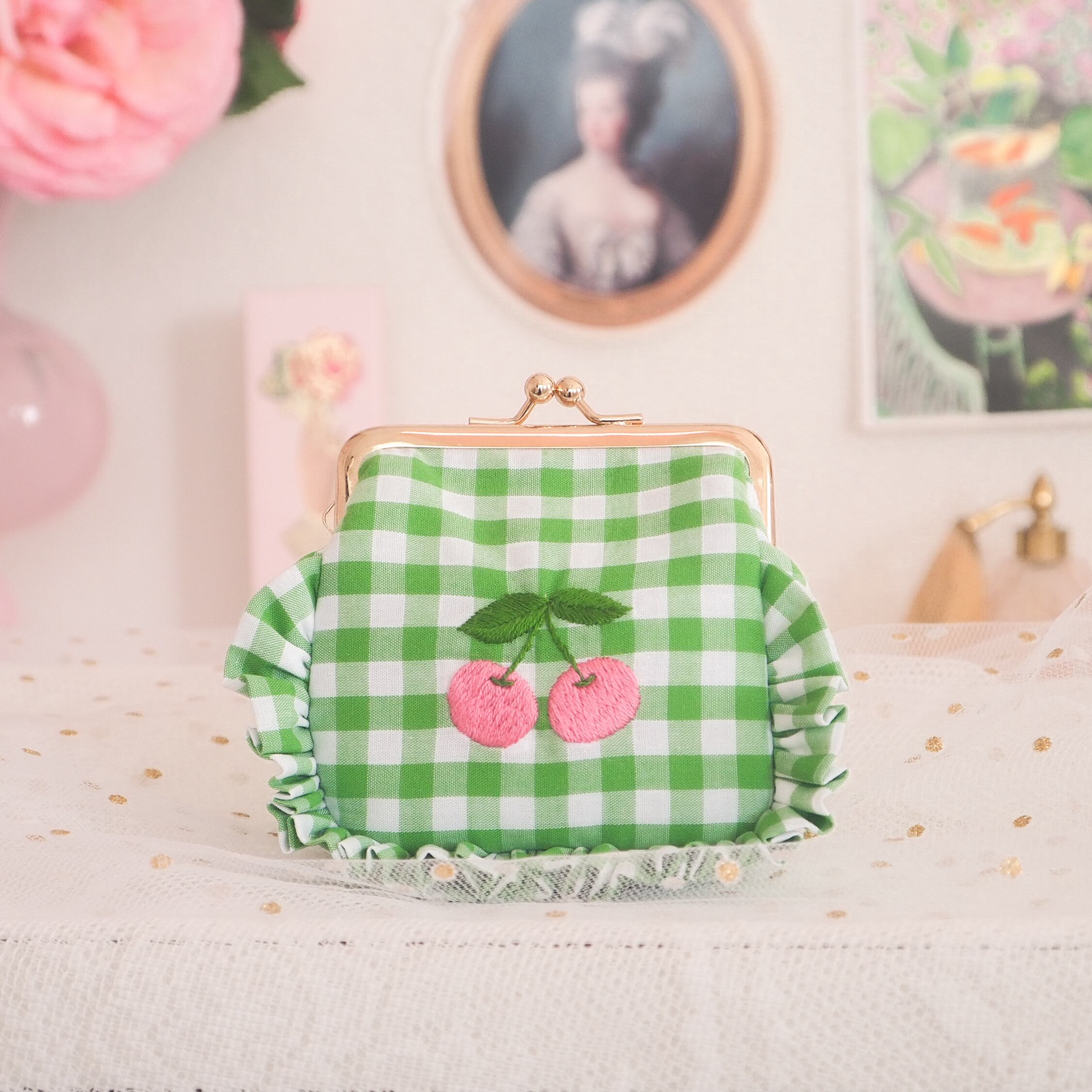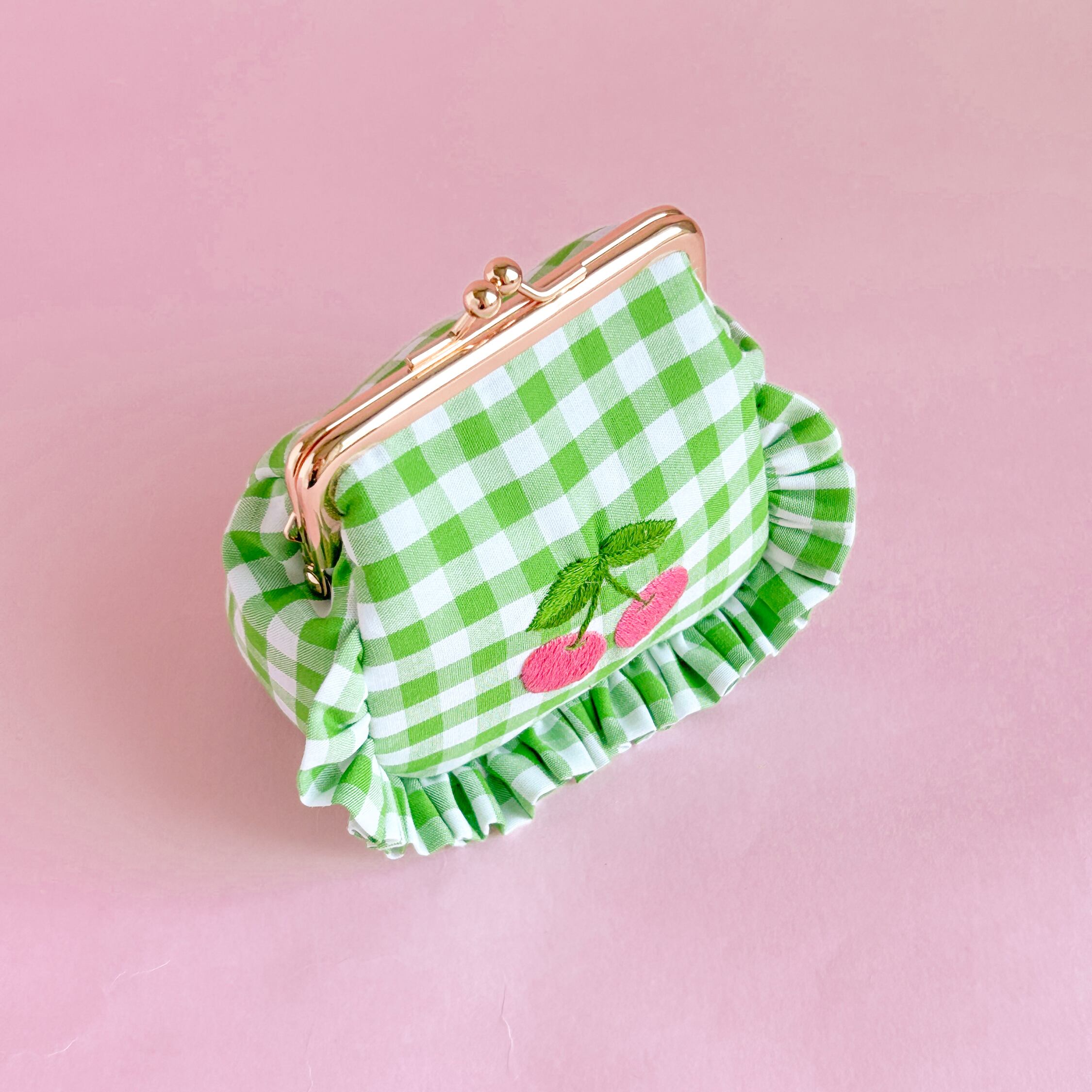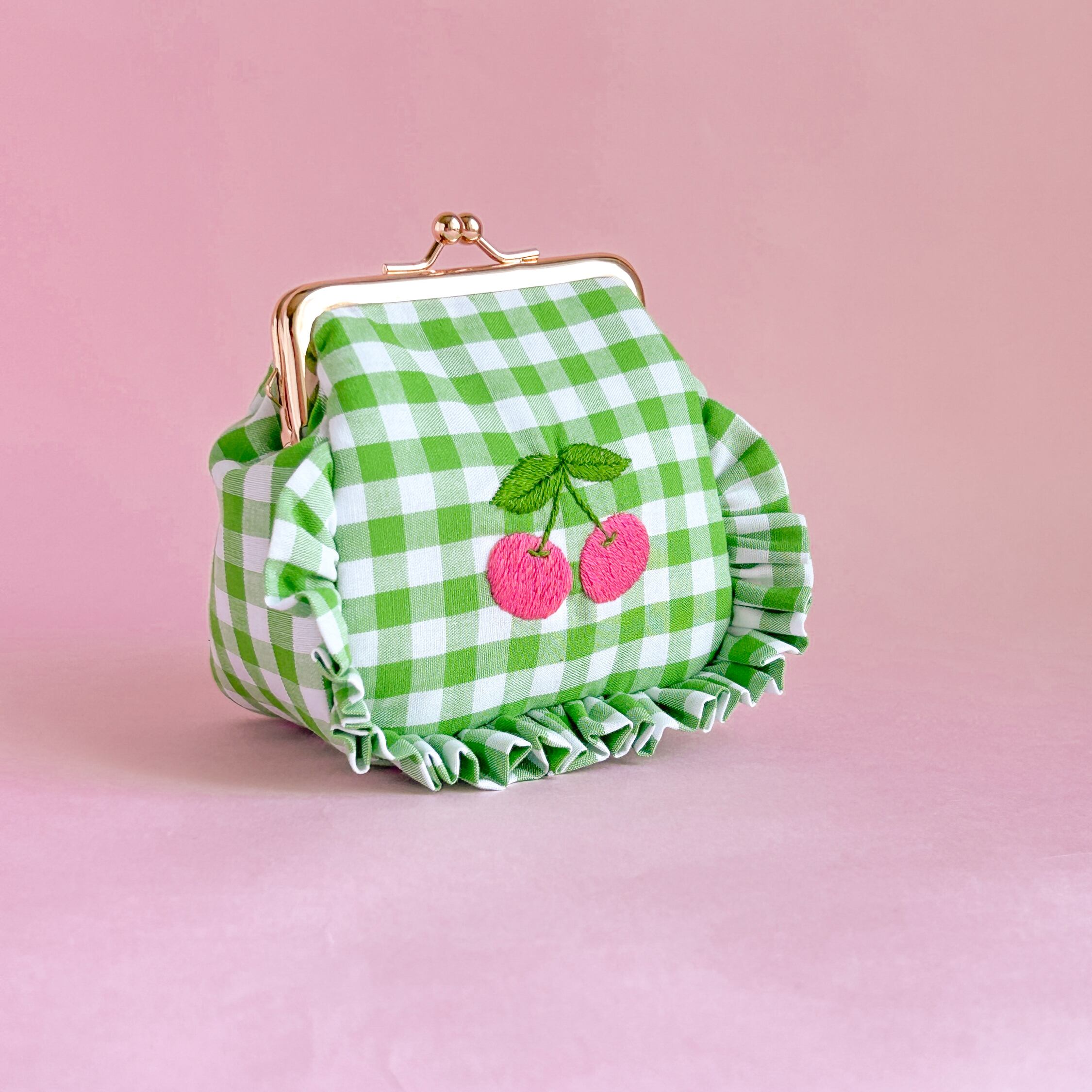 角がま口ポーチマチ付(グリーンギンガム/ピンクチェリー刺繍)ミネット