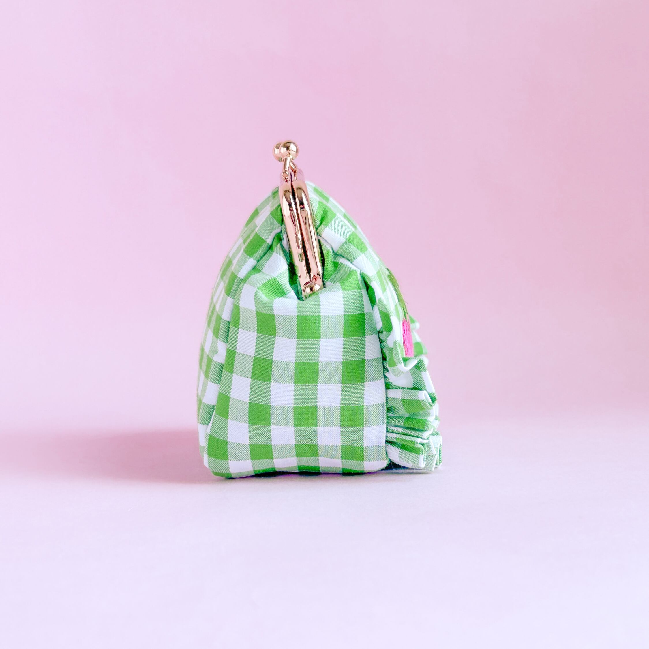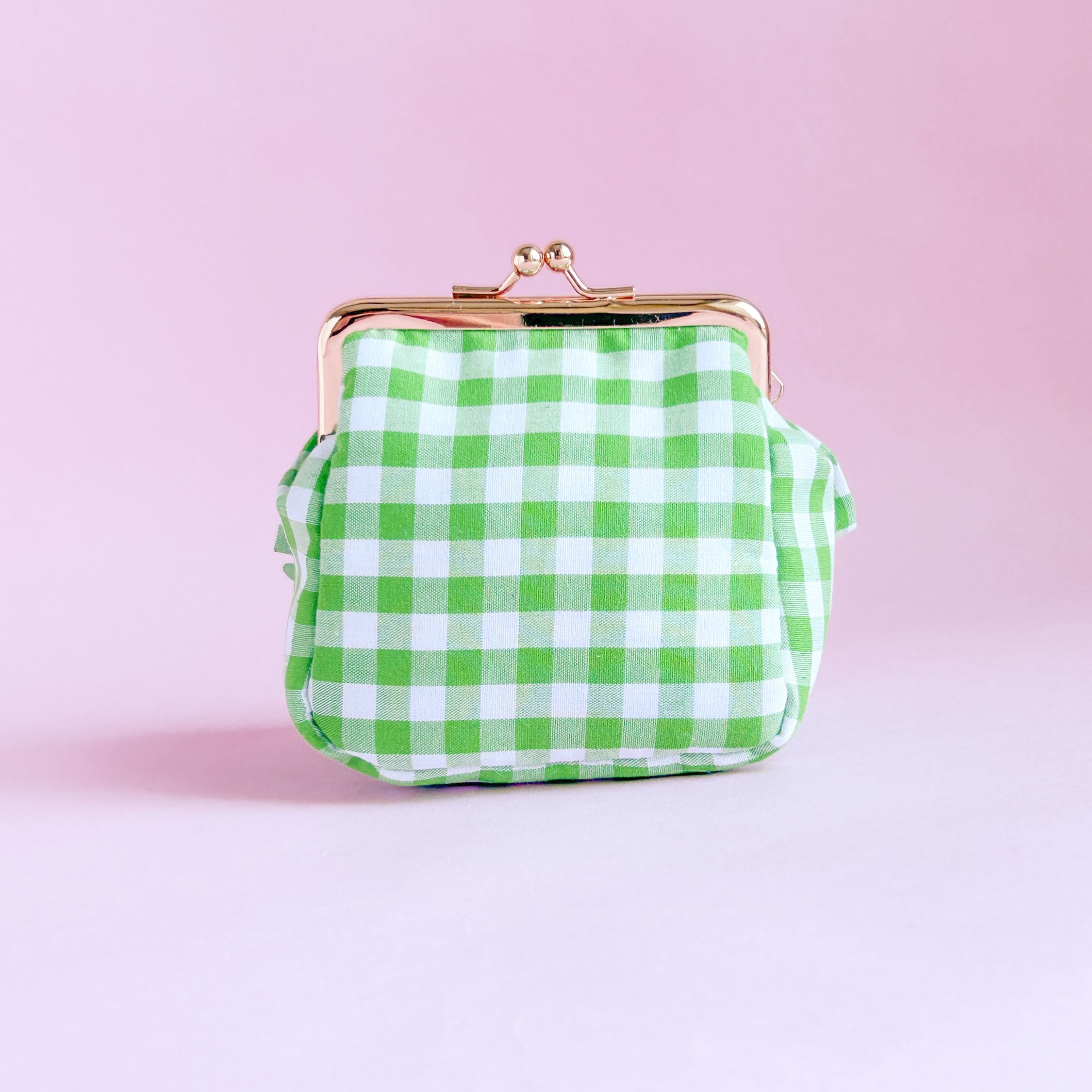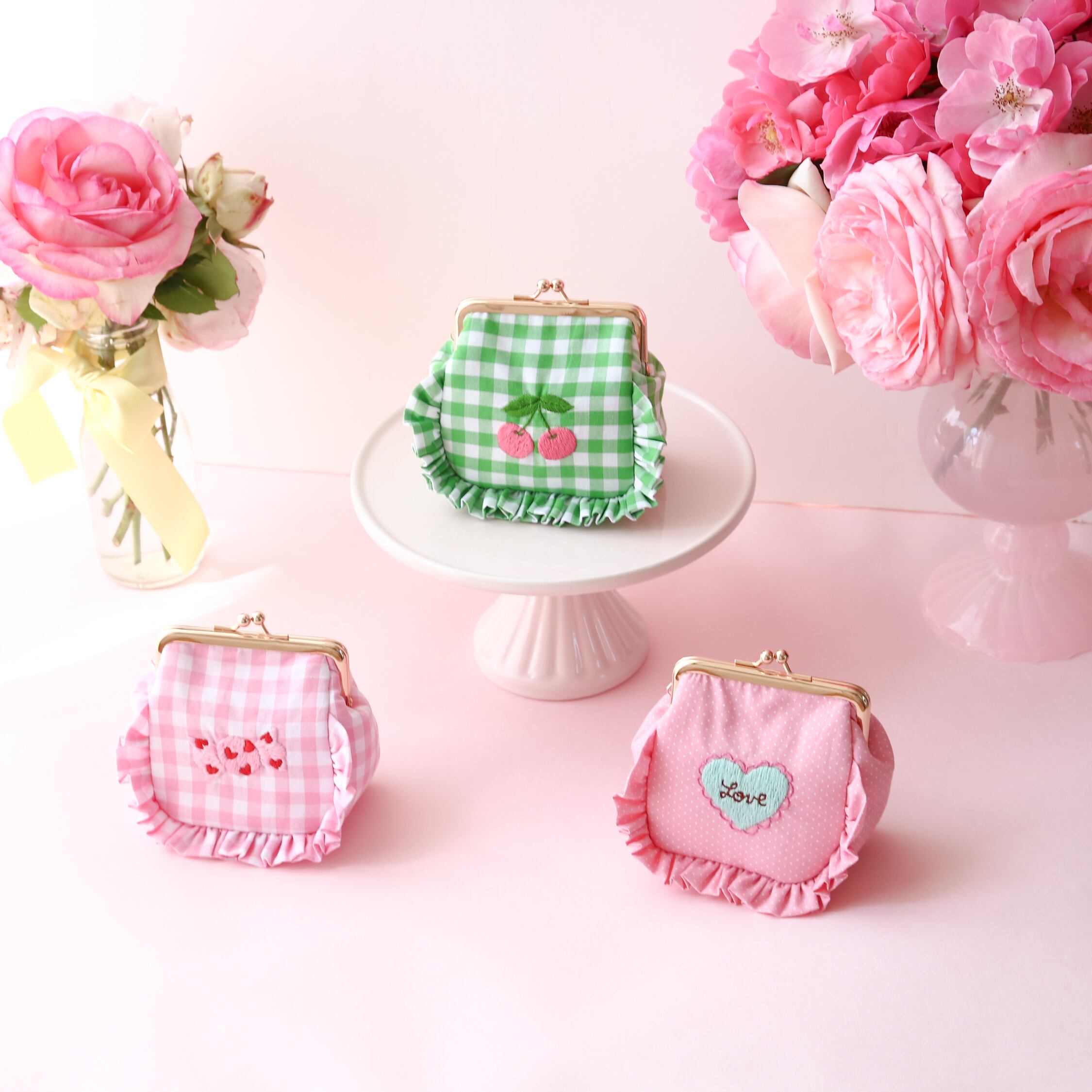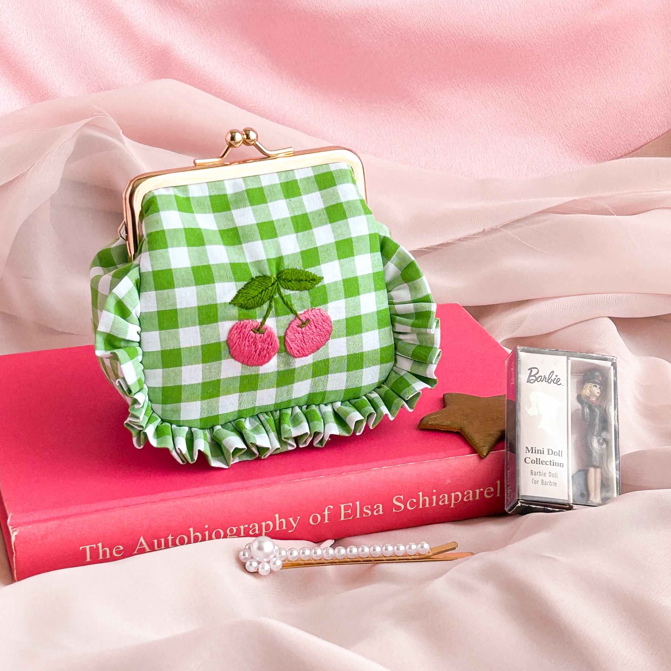 角がま口ポーチマチ付(グリーンギンガム/ピンクチェリー刺繍)ミネット