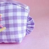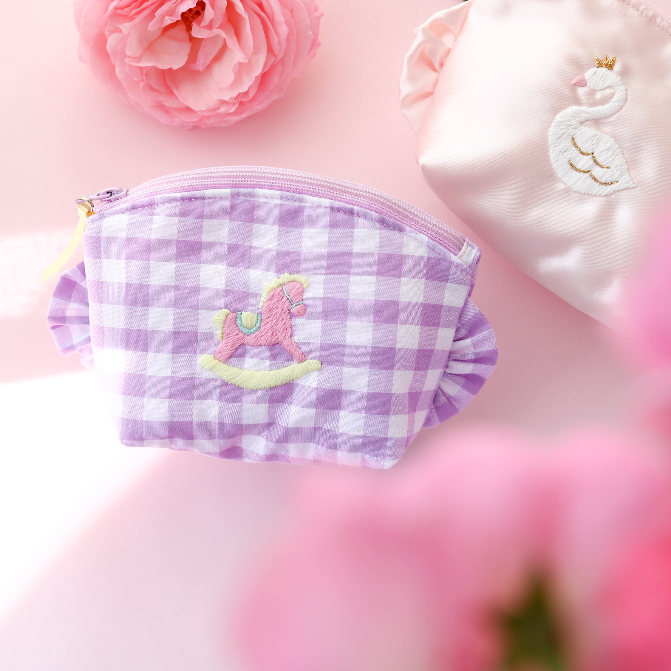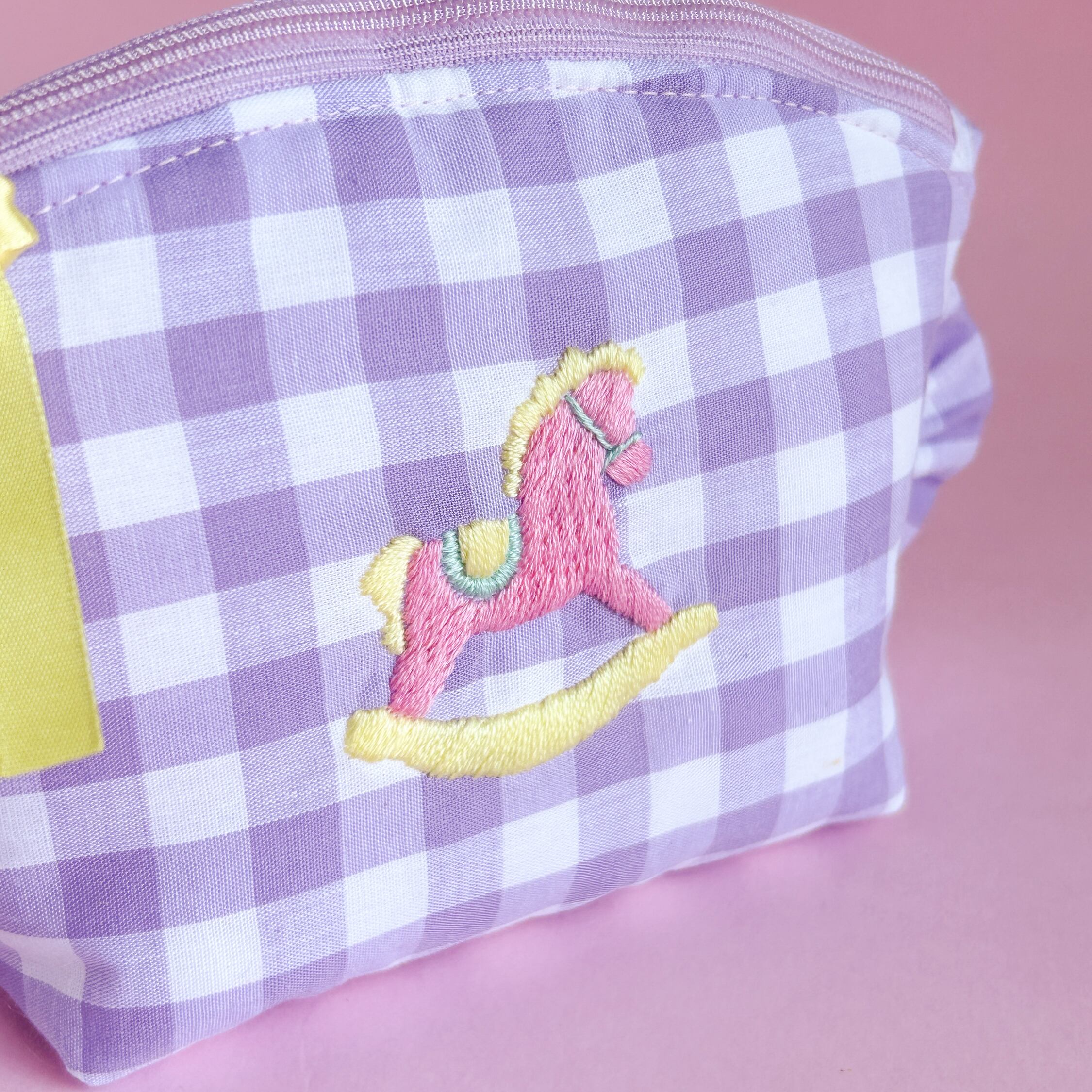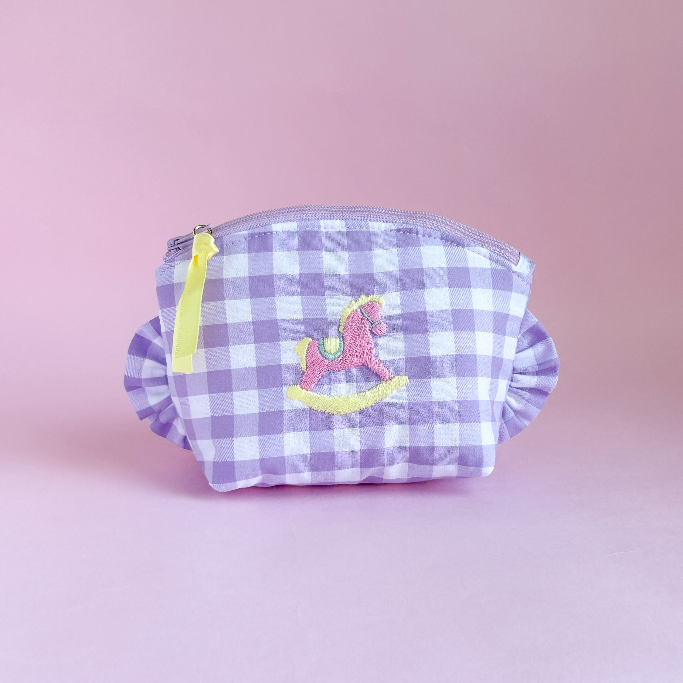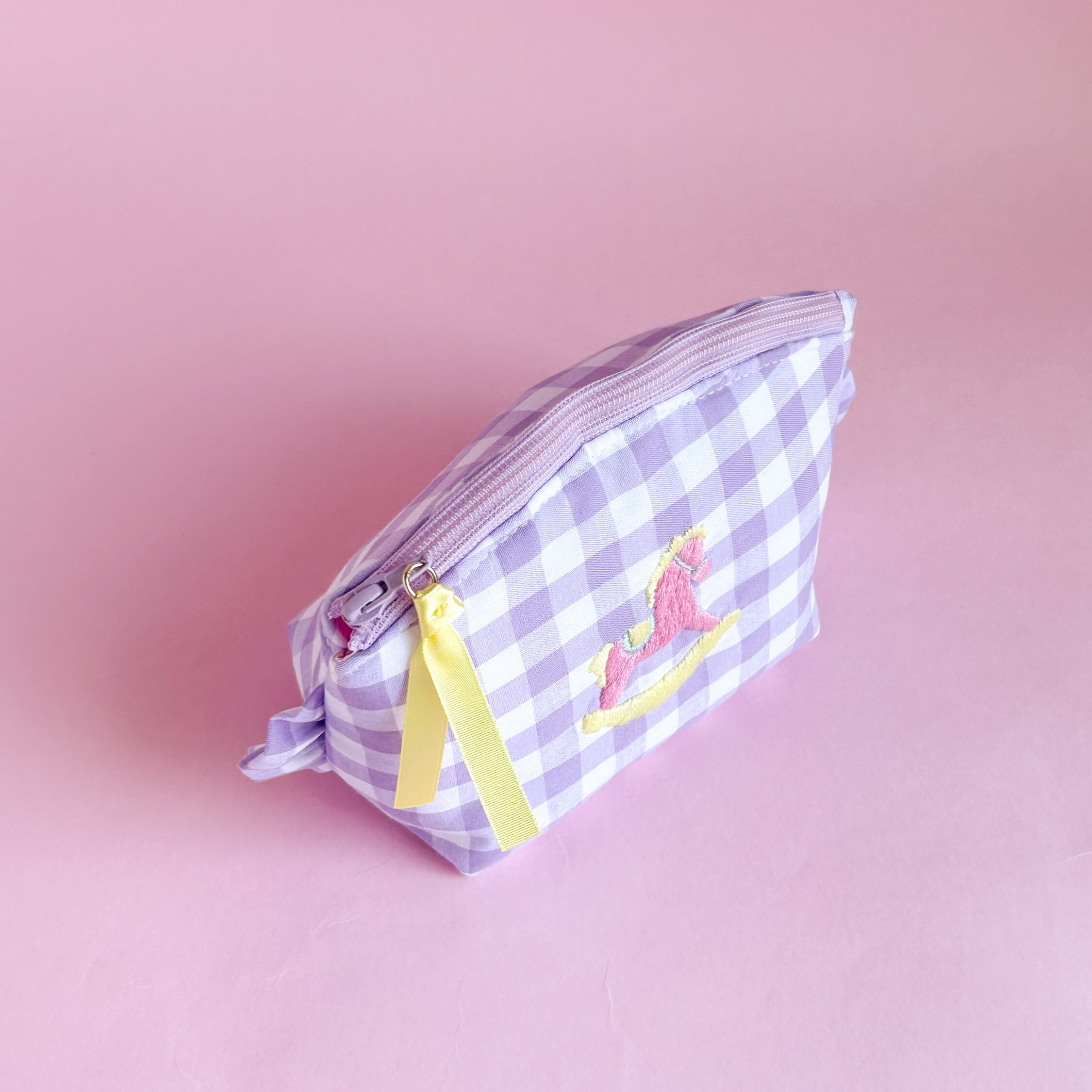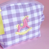トップラウンドポーチ(紫ギンガム/ロッキングホース刺繍)ミネット手作りポーチ