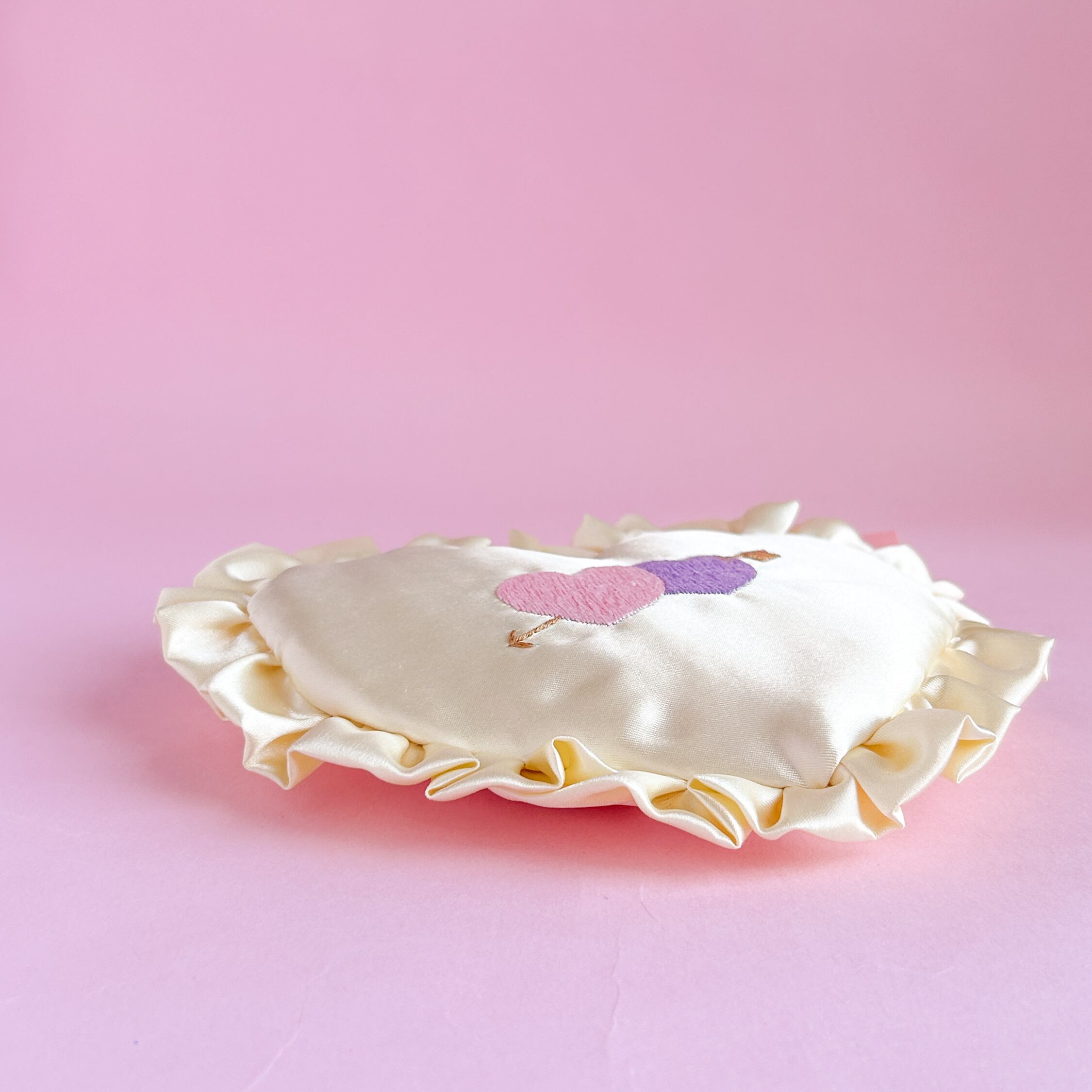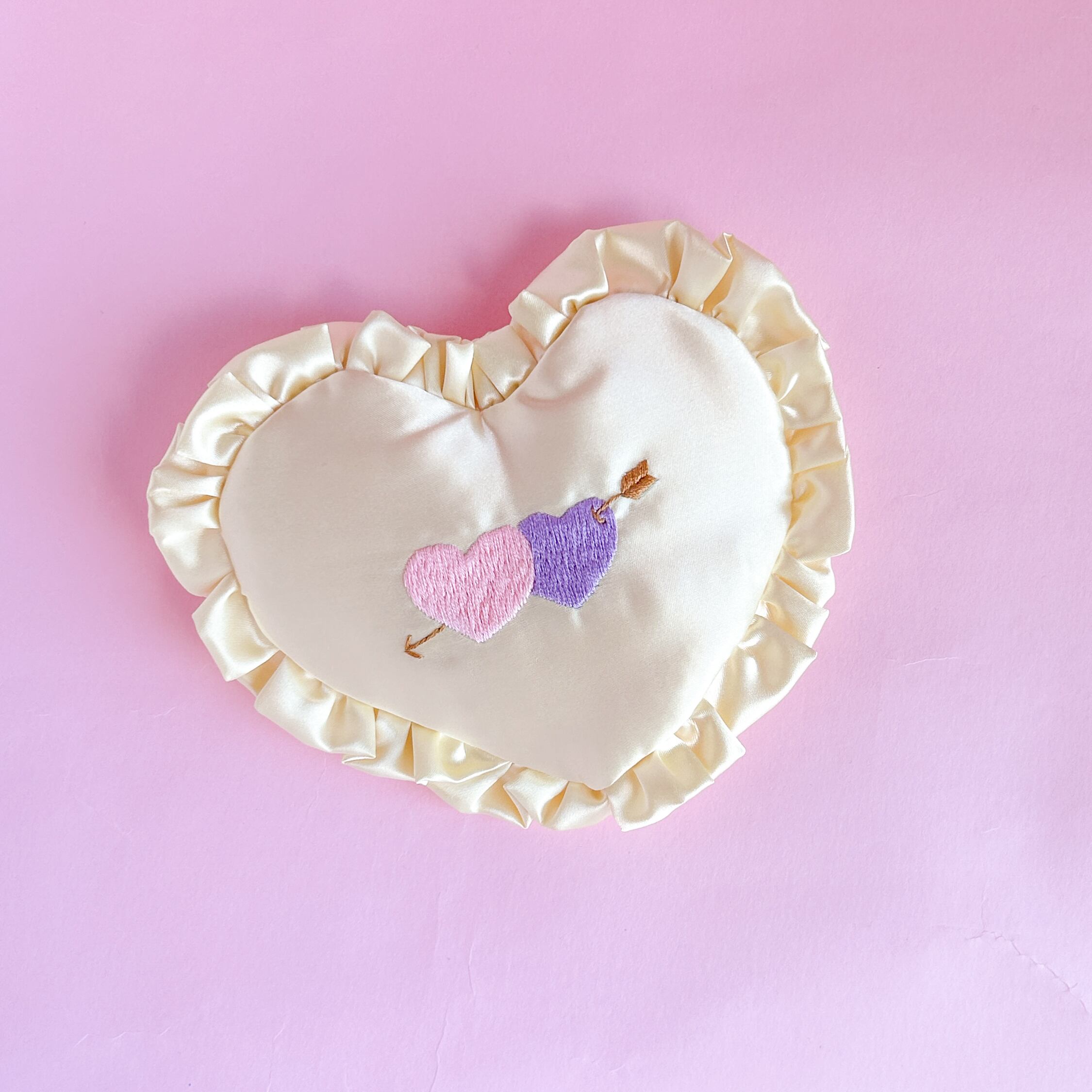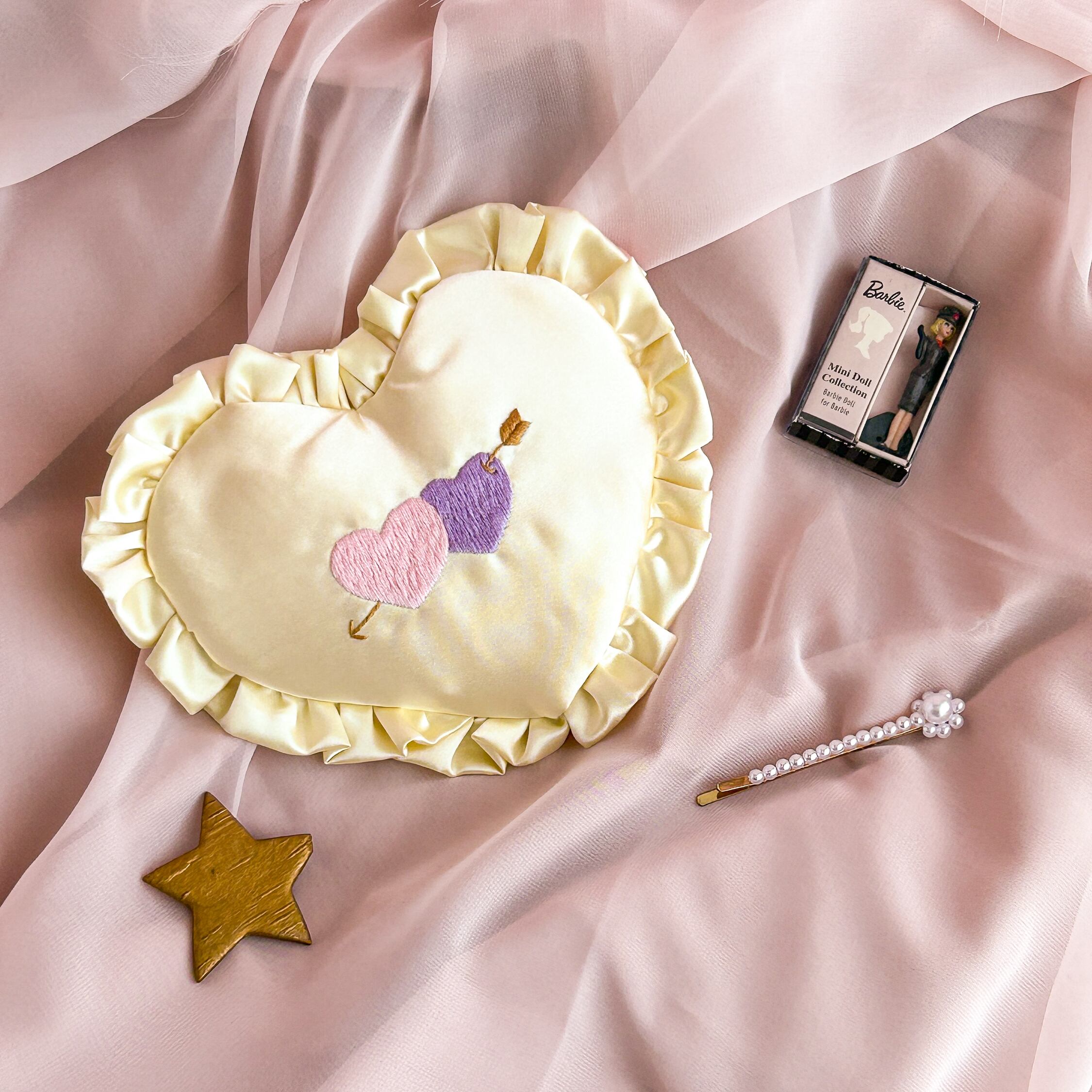 ハートぺたんこポーチ(クリームイエロー/ダブルハートアロー刺繍)minette刺繍ハンドメイド