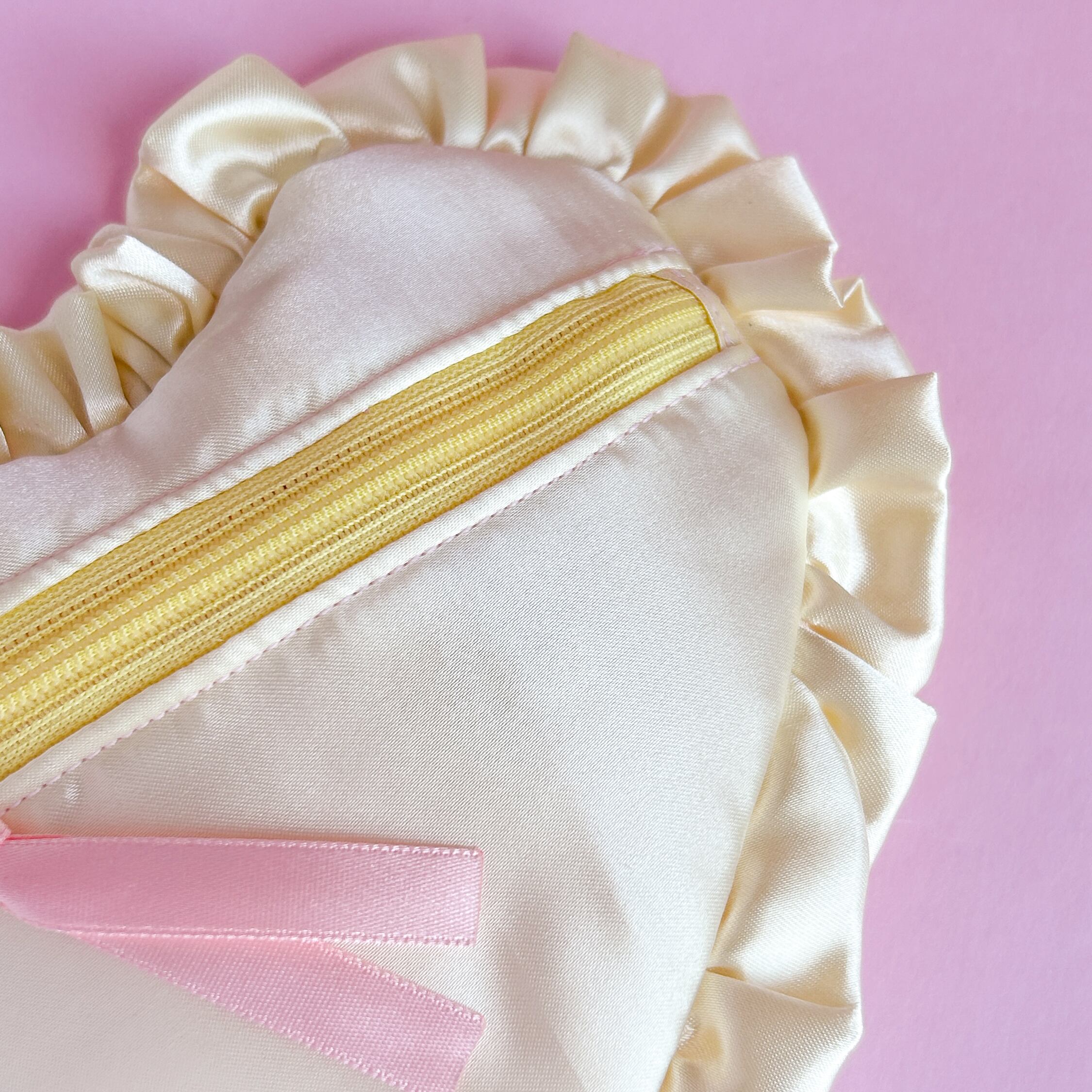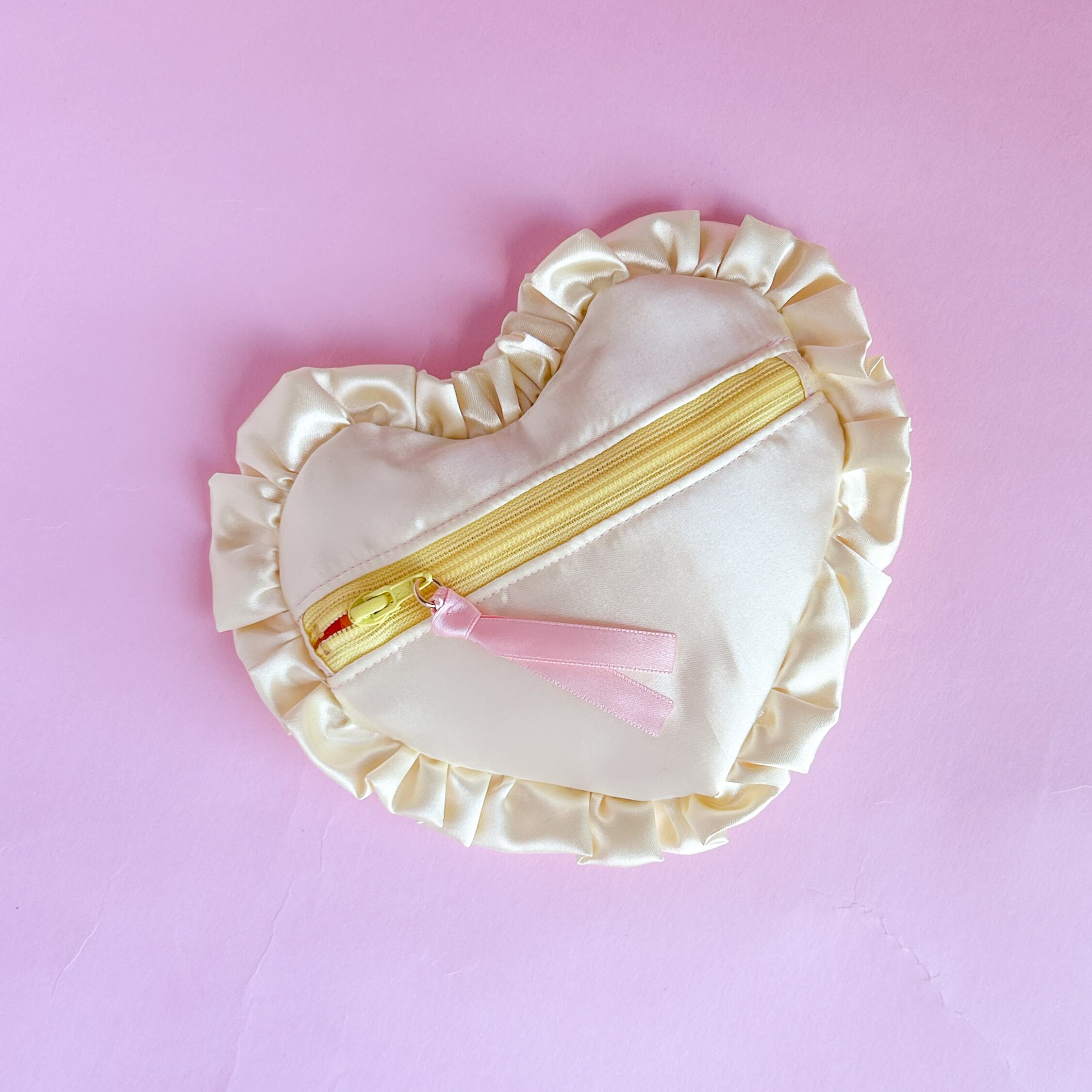 このポーチは、ハートの形をしており、特徴的なデザインが目を引きます。