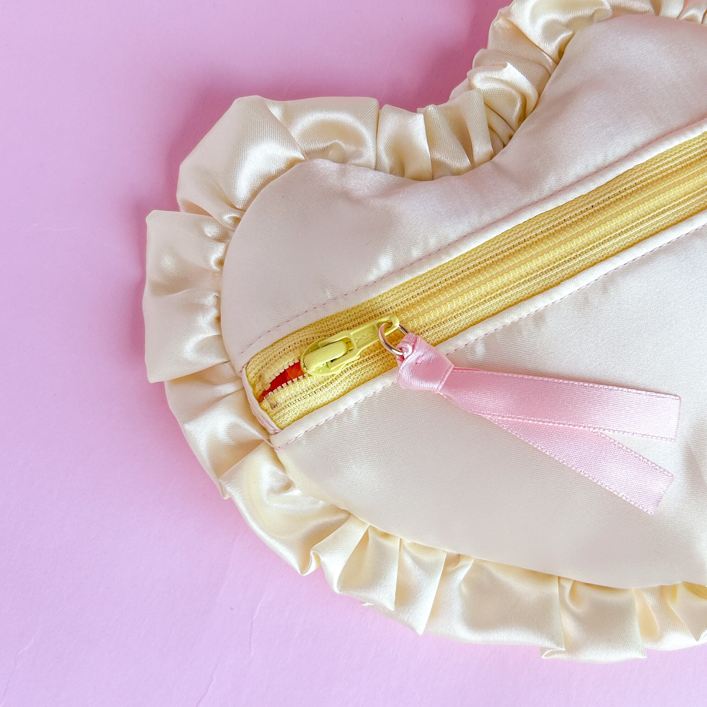 この可愛らしいポーチは、フリルたっぷりのデザインが特徴です。