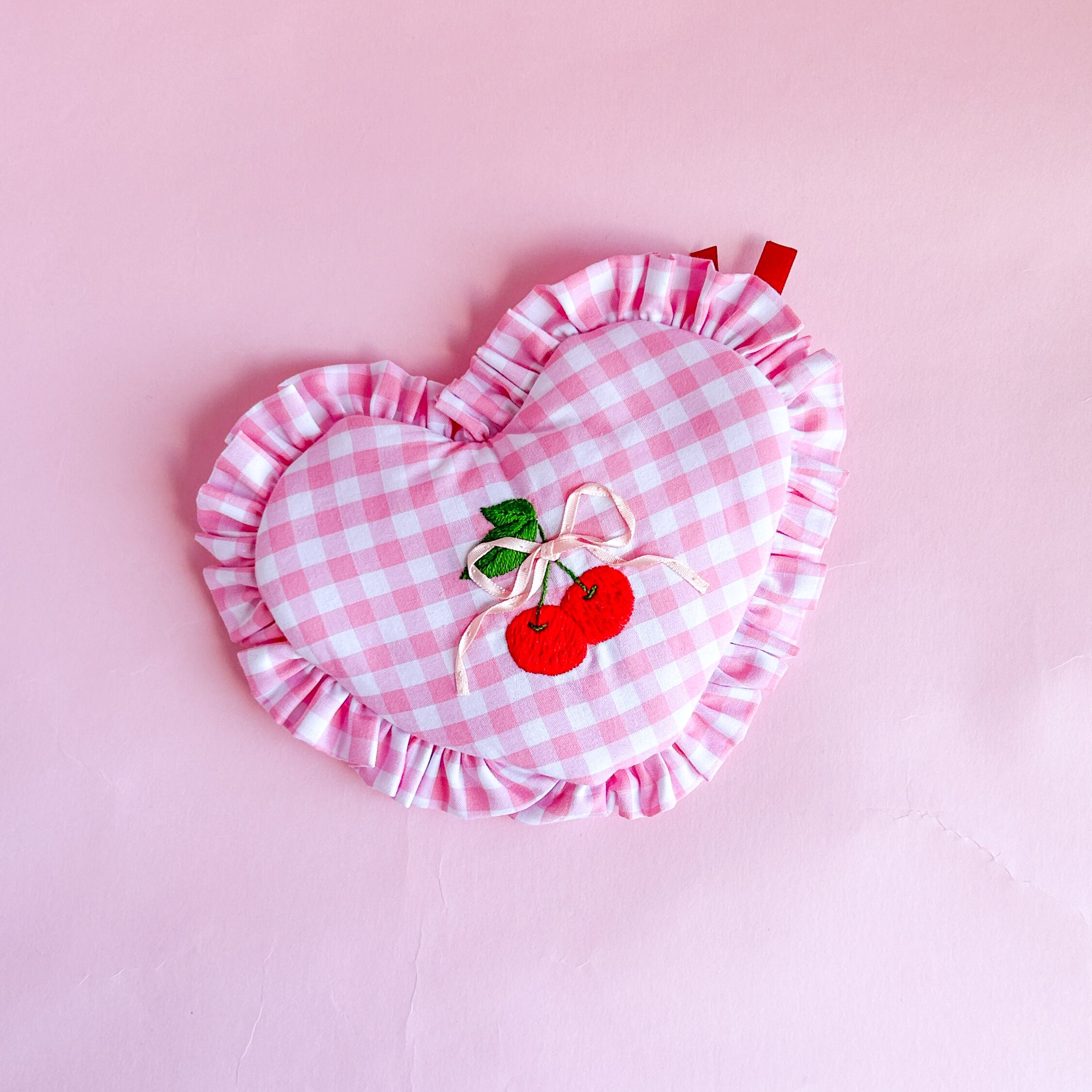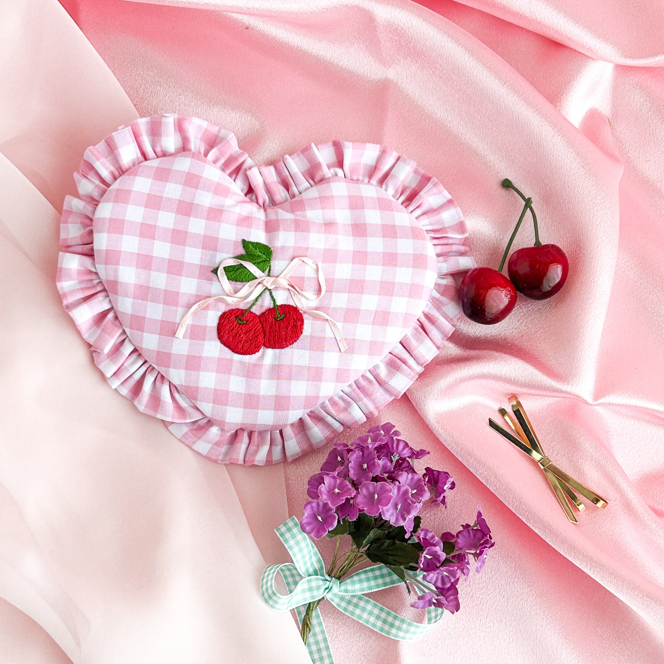ハートぺたんこポーチ(ピンクギンガム/リボンチェリー刺繍)minette刺繍ハンドメイド