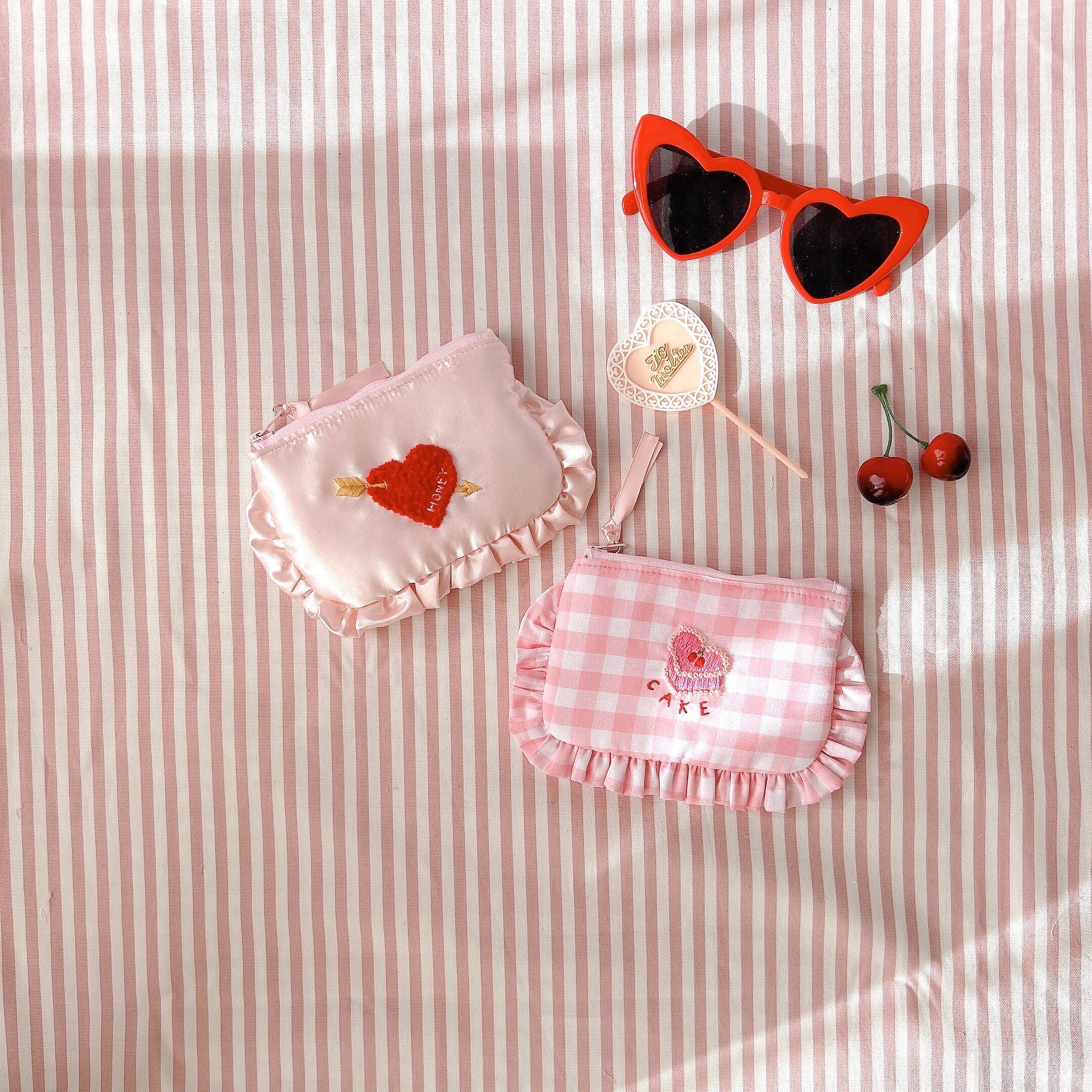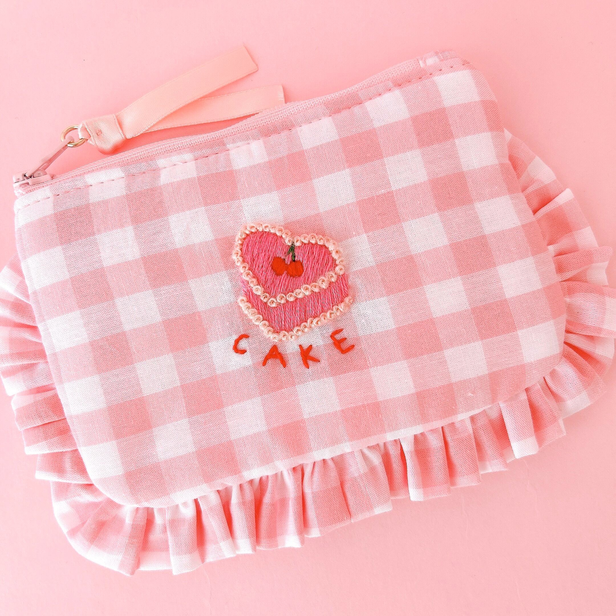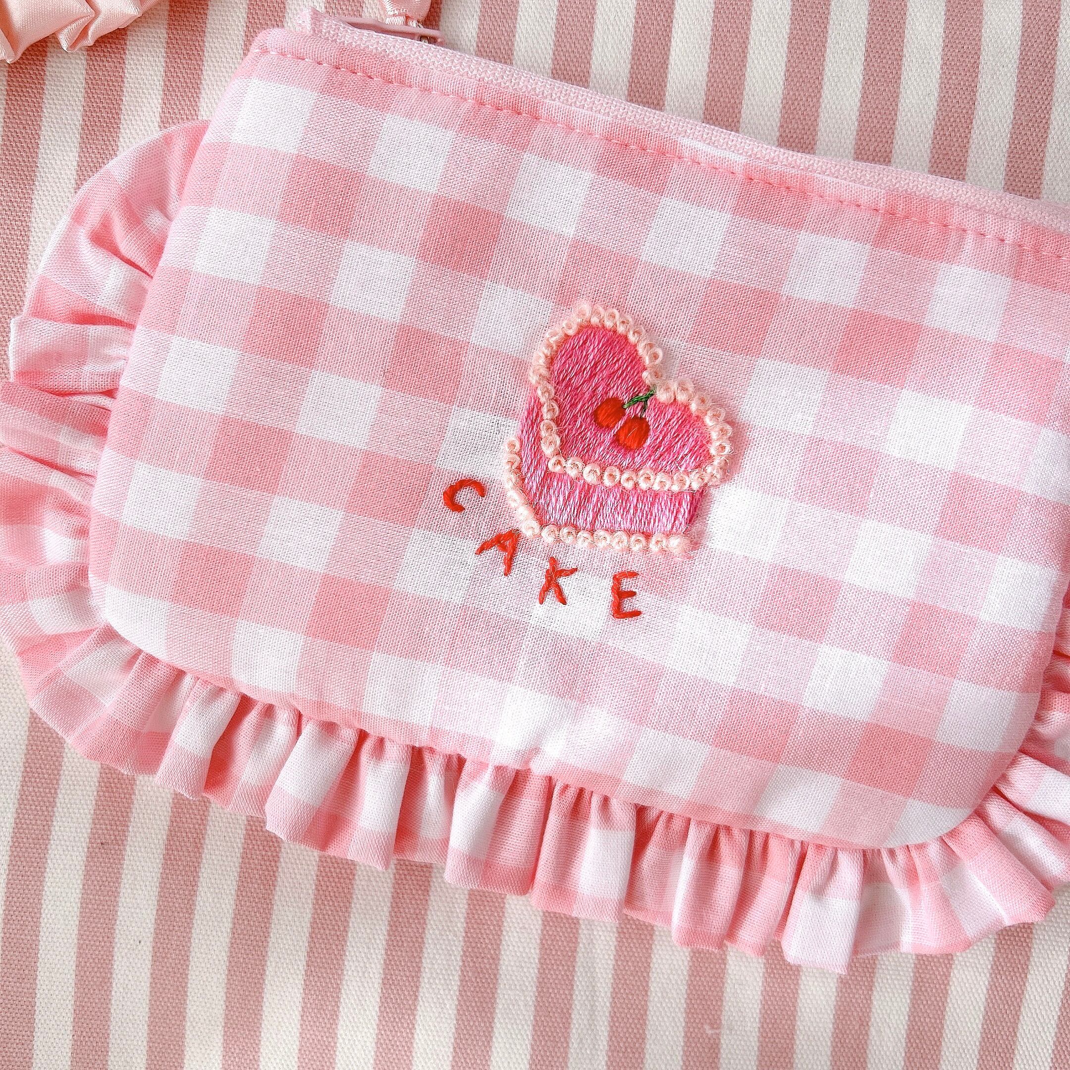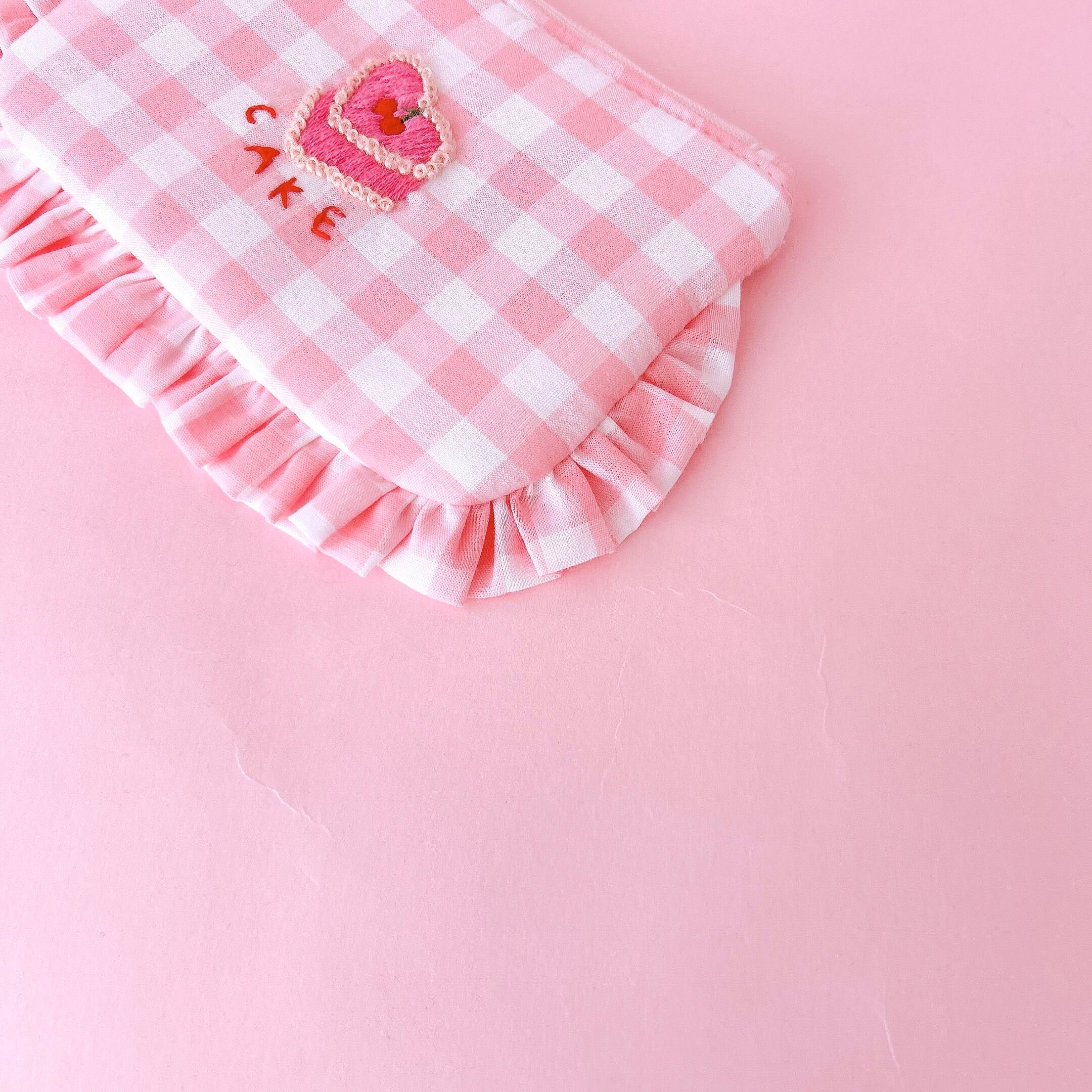 ぺたんこポーチ(ピンクギンガム/ハートケーキ刺繍)