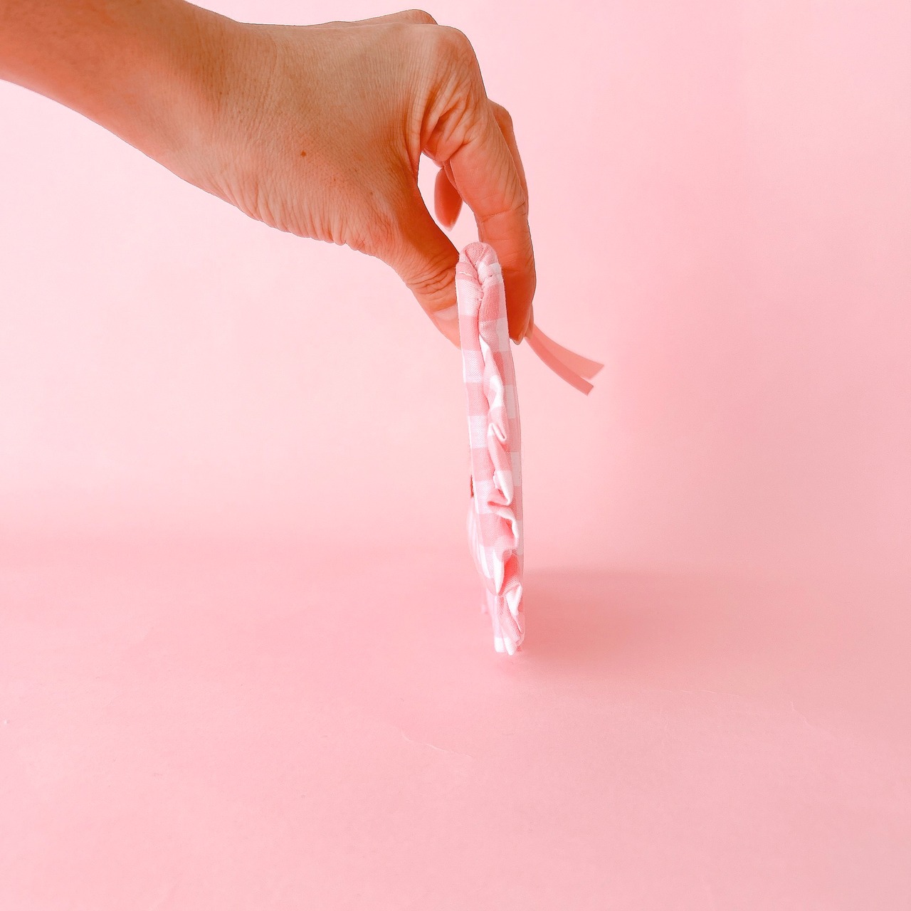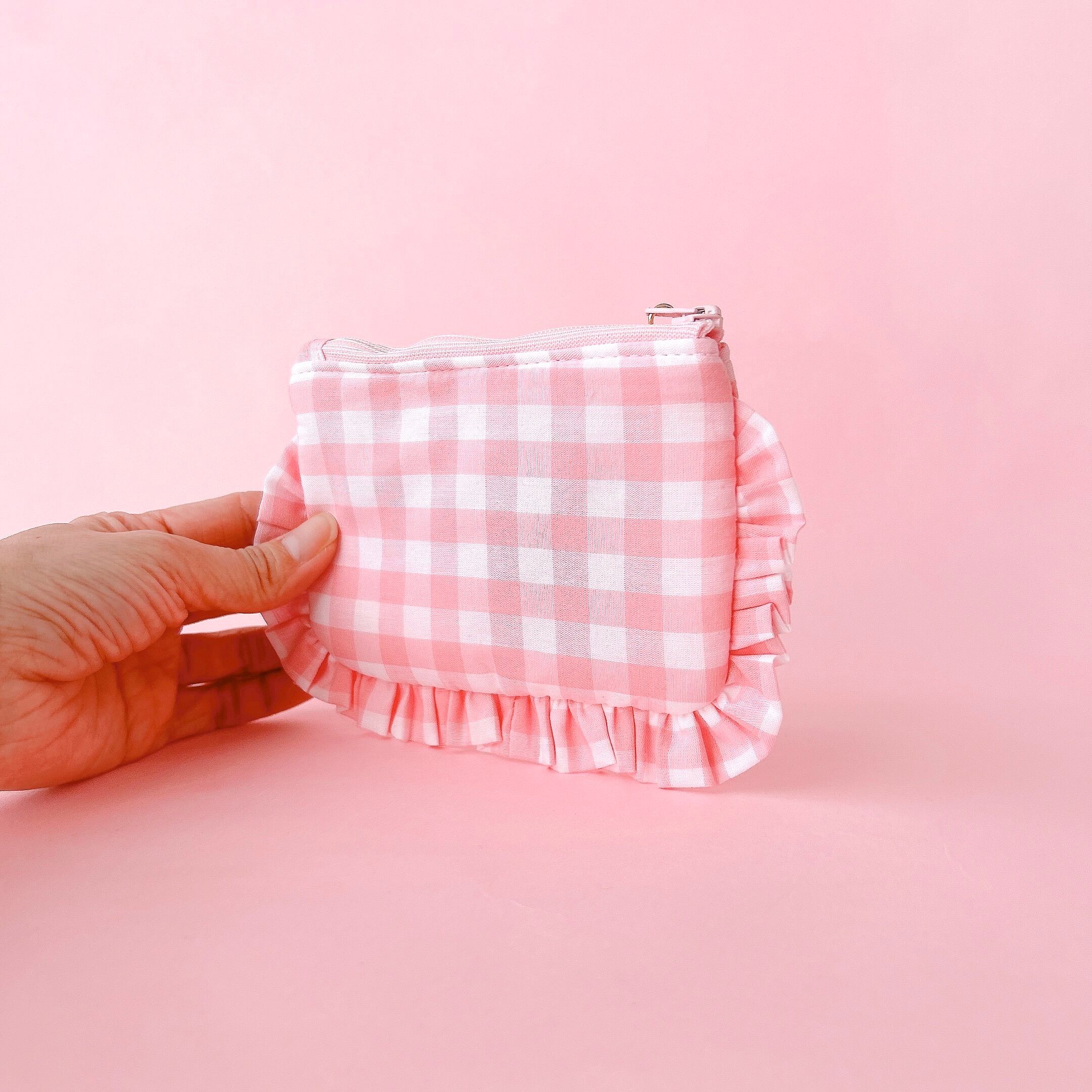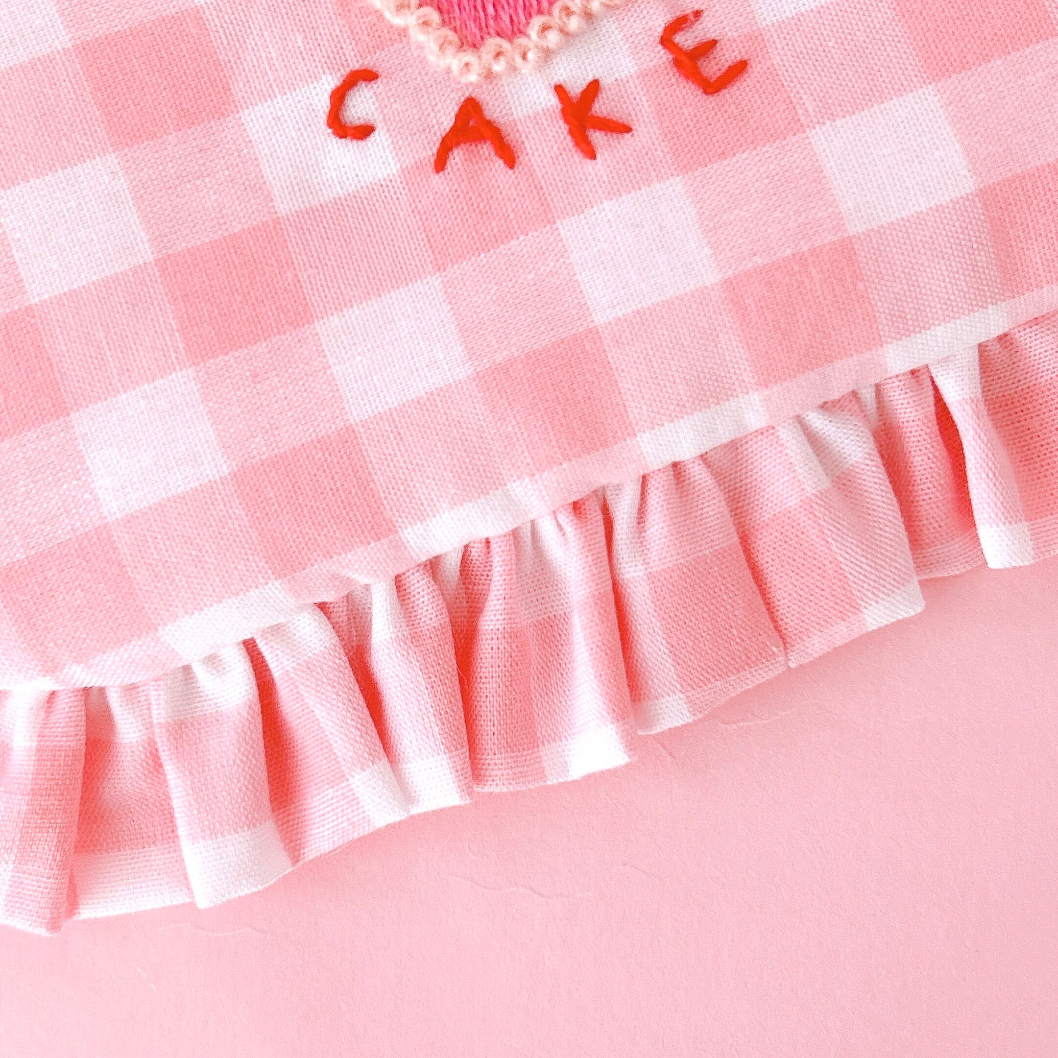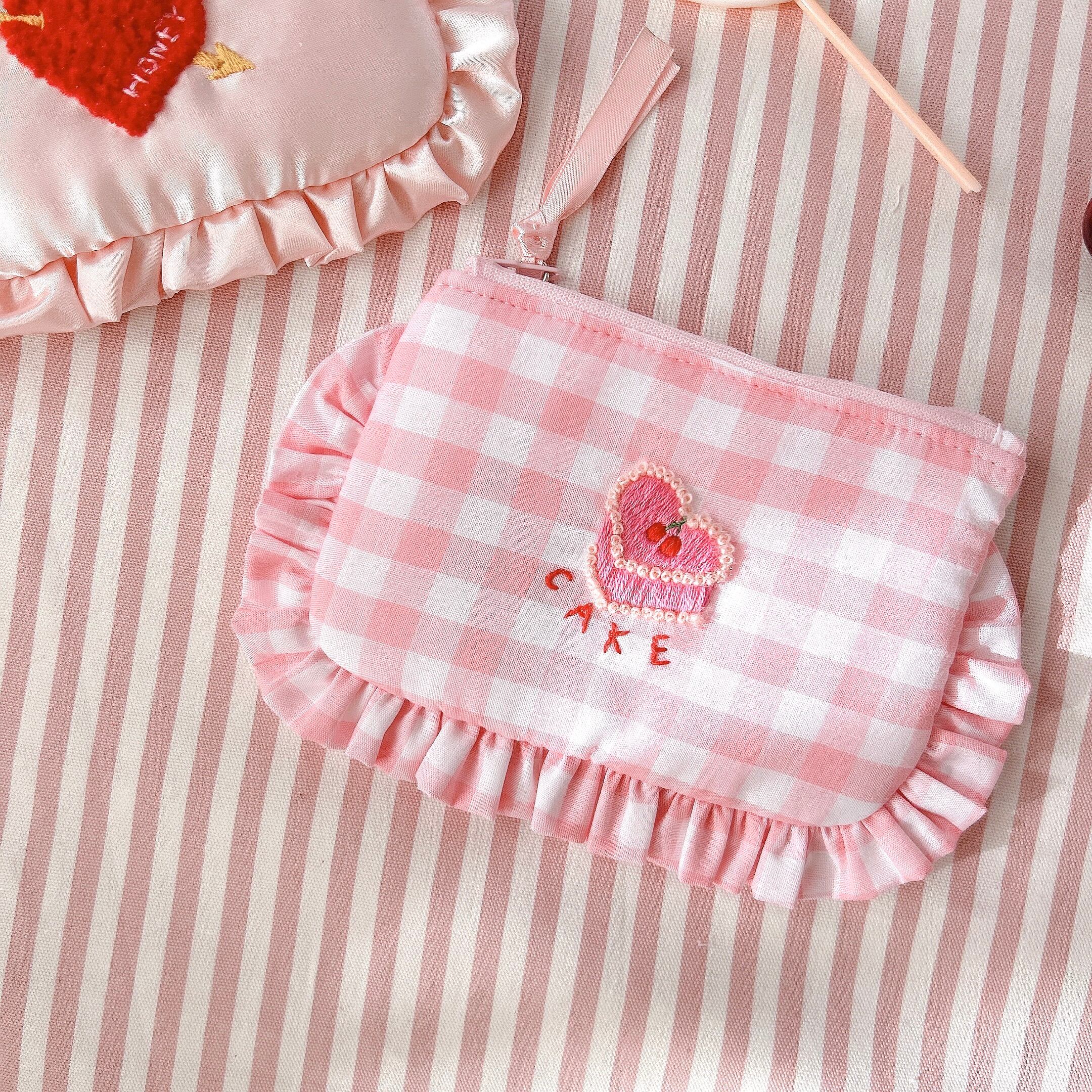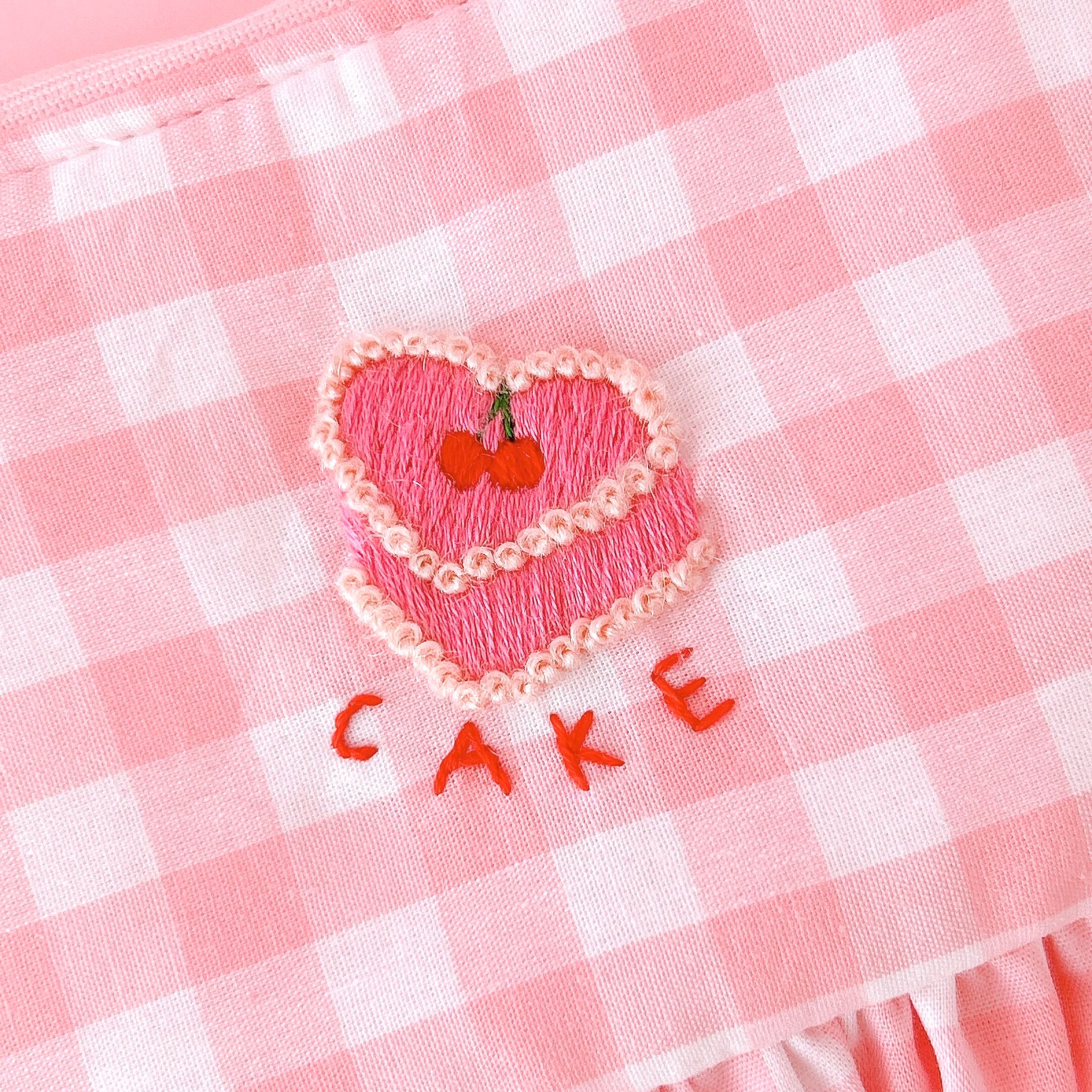 ぺたんこポーチ(ピンクギンガム/ハートケーキ刺繍)