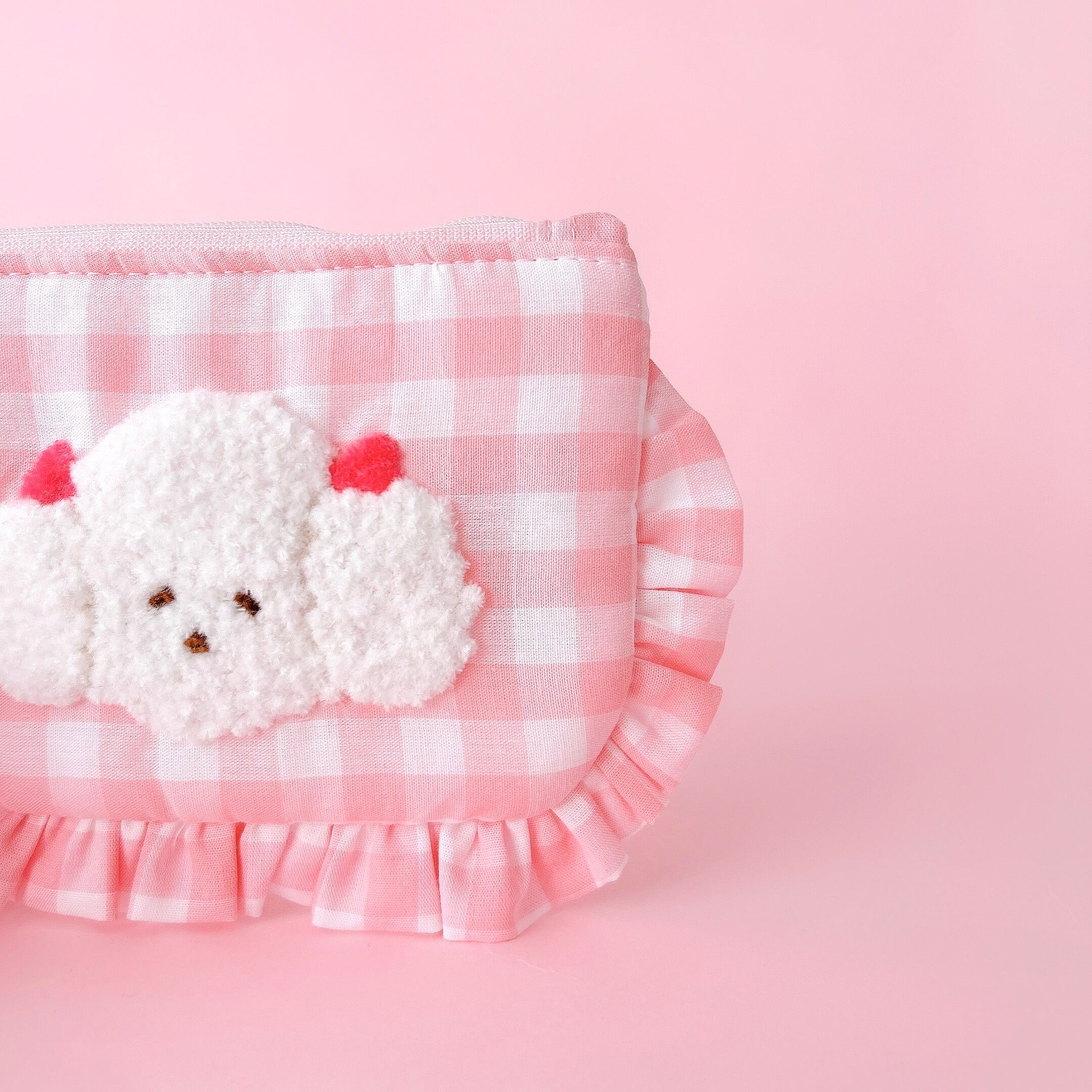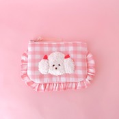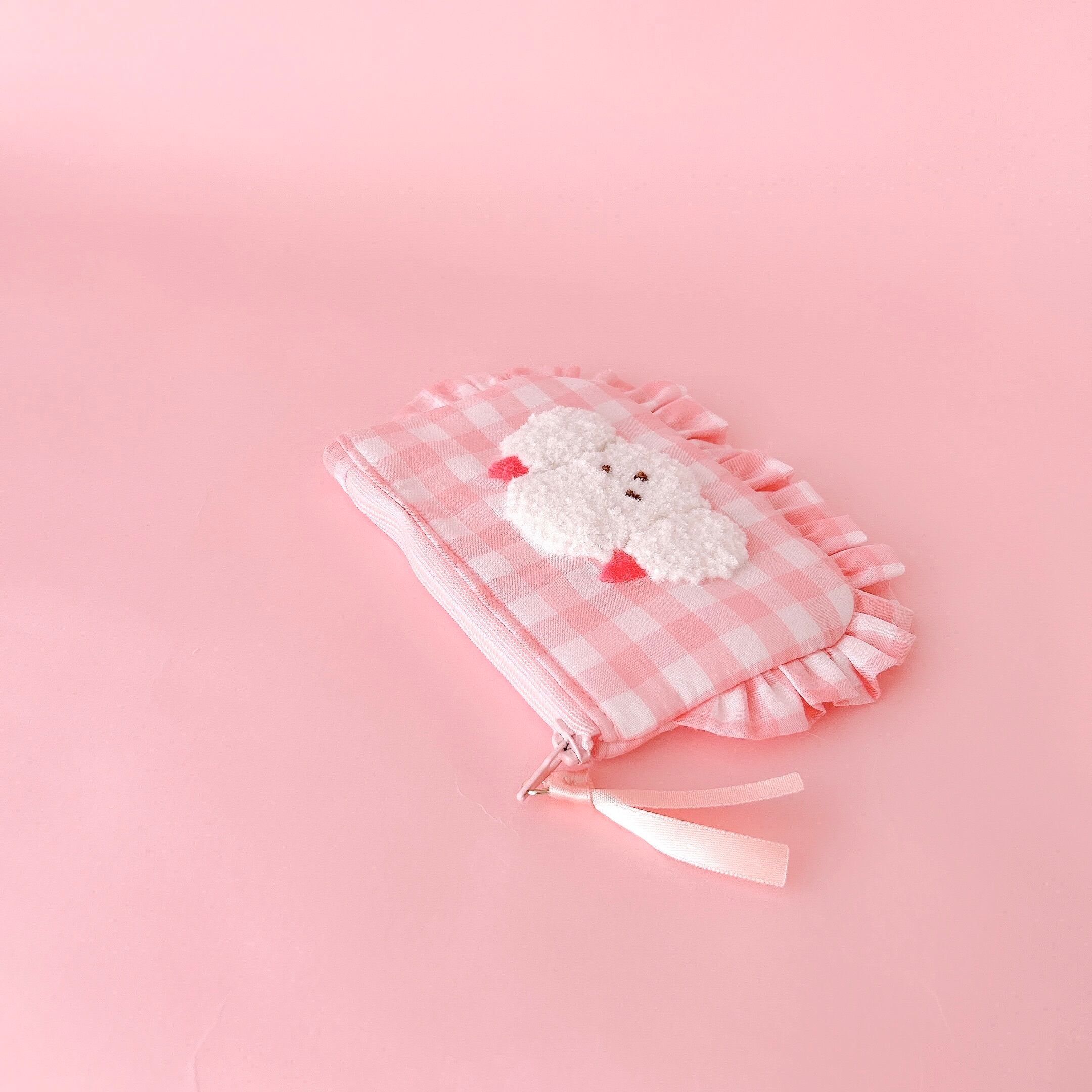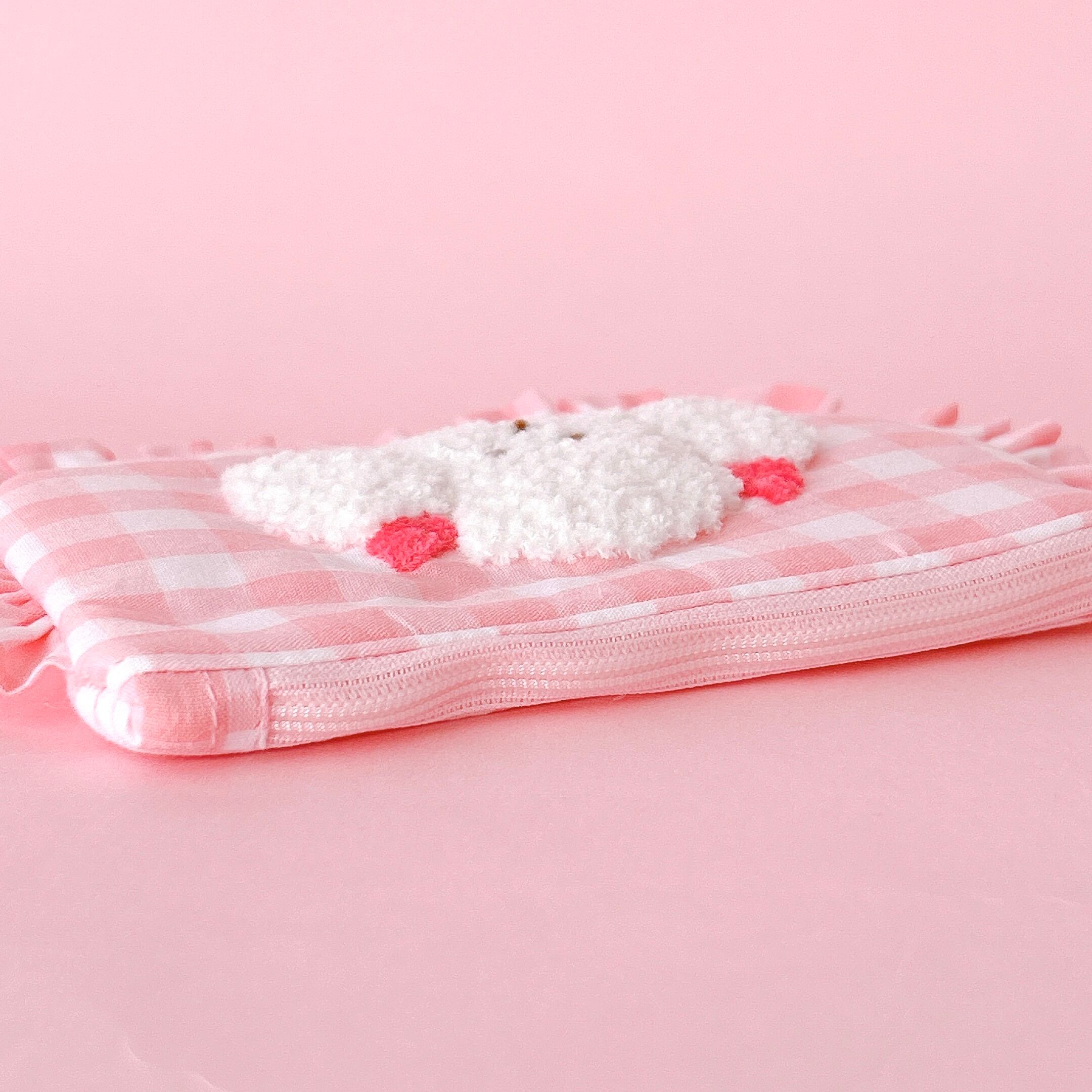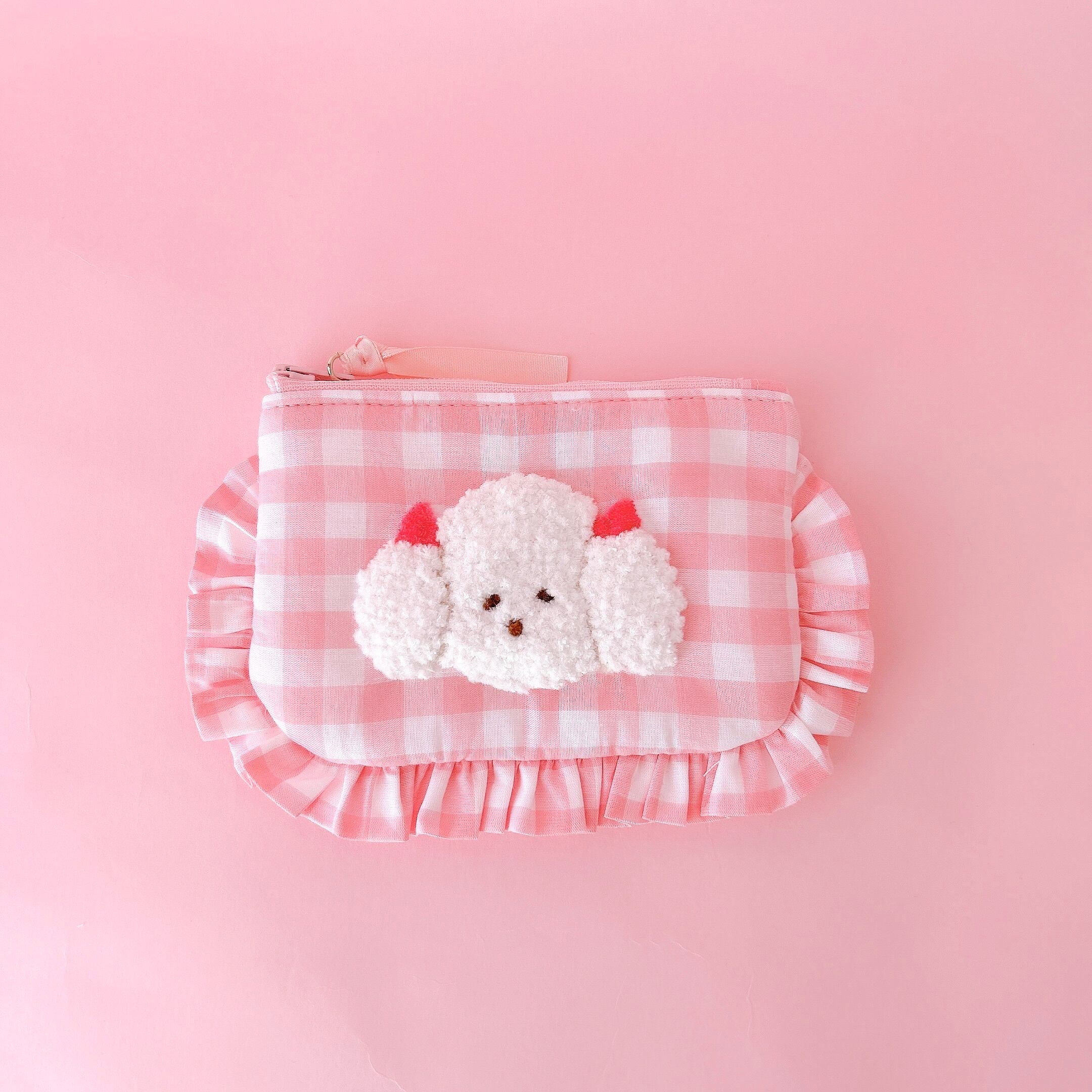 ぺたんこポーチ(ピンクギンガム/モコモコプードル刺繍)